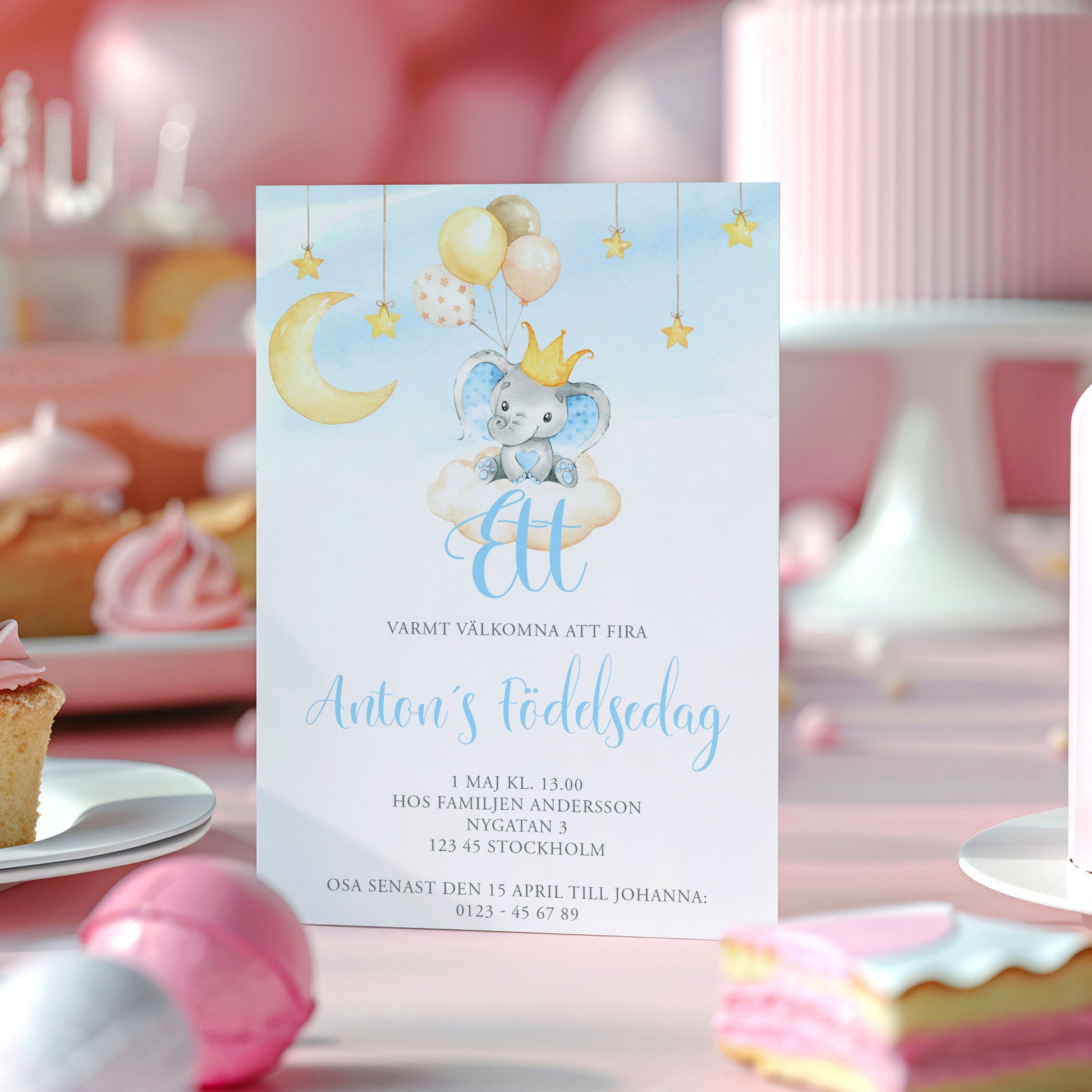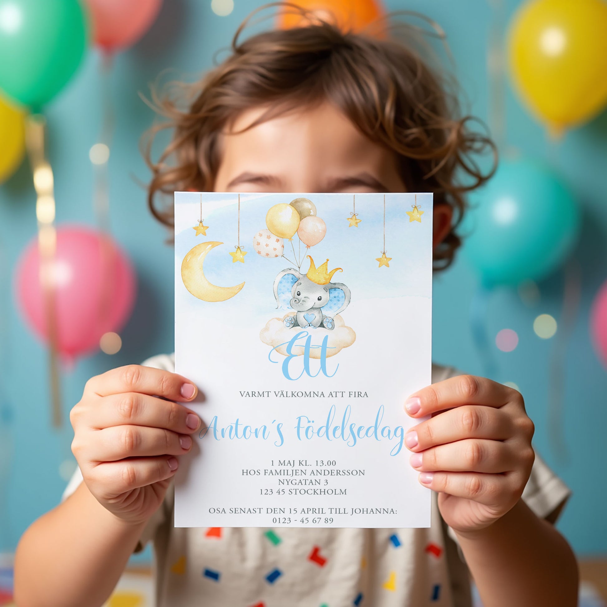 Barnkalas Inbjudningskort – Elefant med Ballonger Blå – A6 Tryckt Kort för Födelsedagskalas BK002b