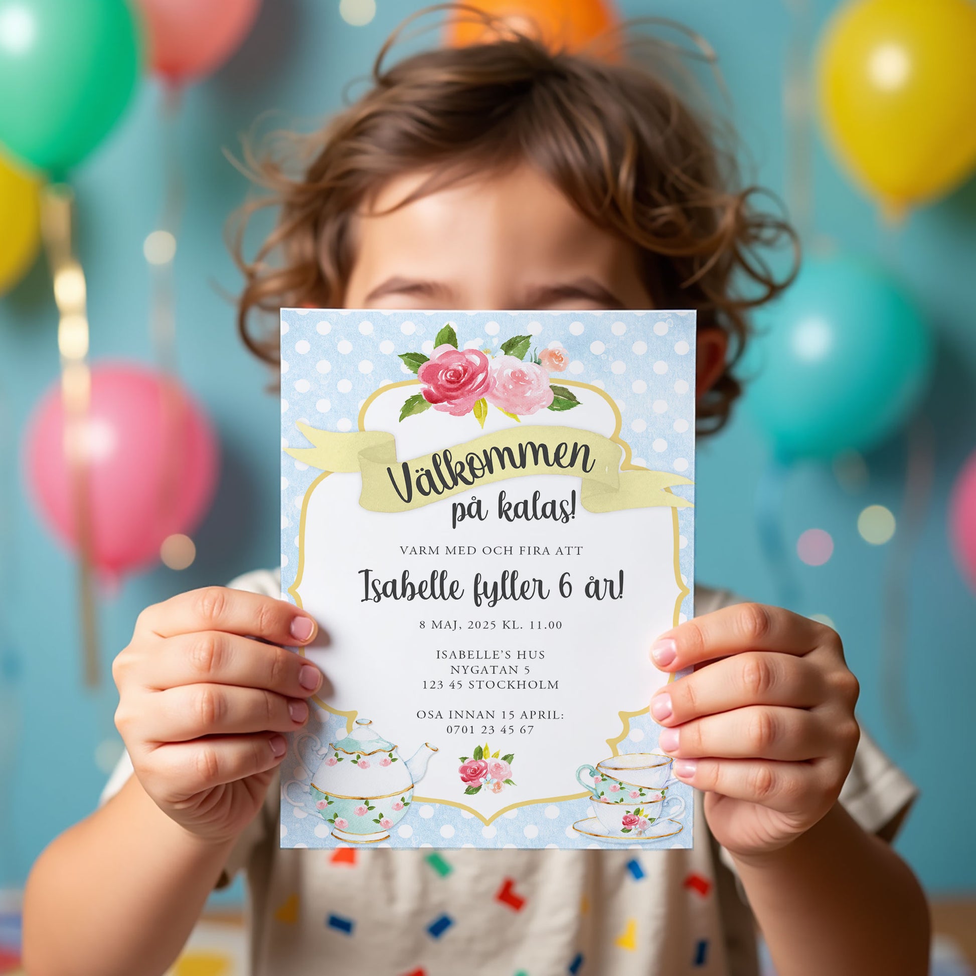 Barnkalas Inbjudningskort – Tekoppar Polkadot Blå – A6 Tryckt Kort för Födelsedagskalas BK001b