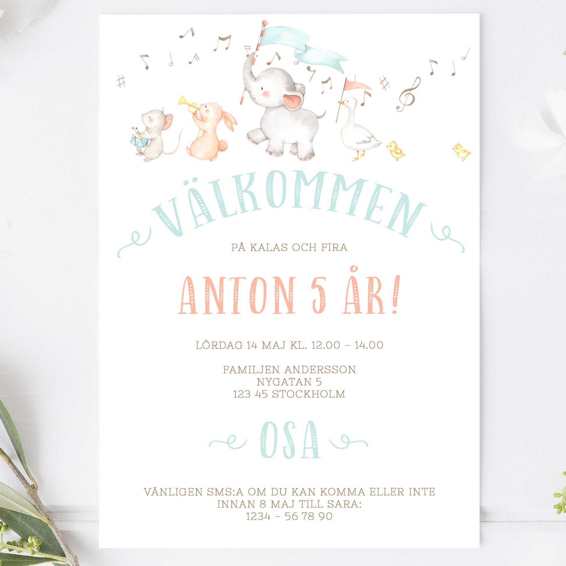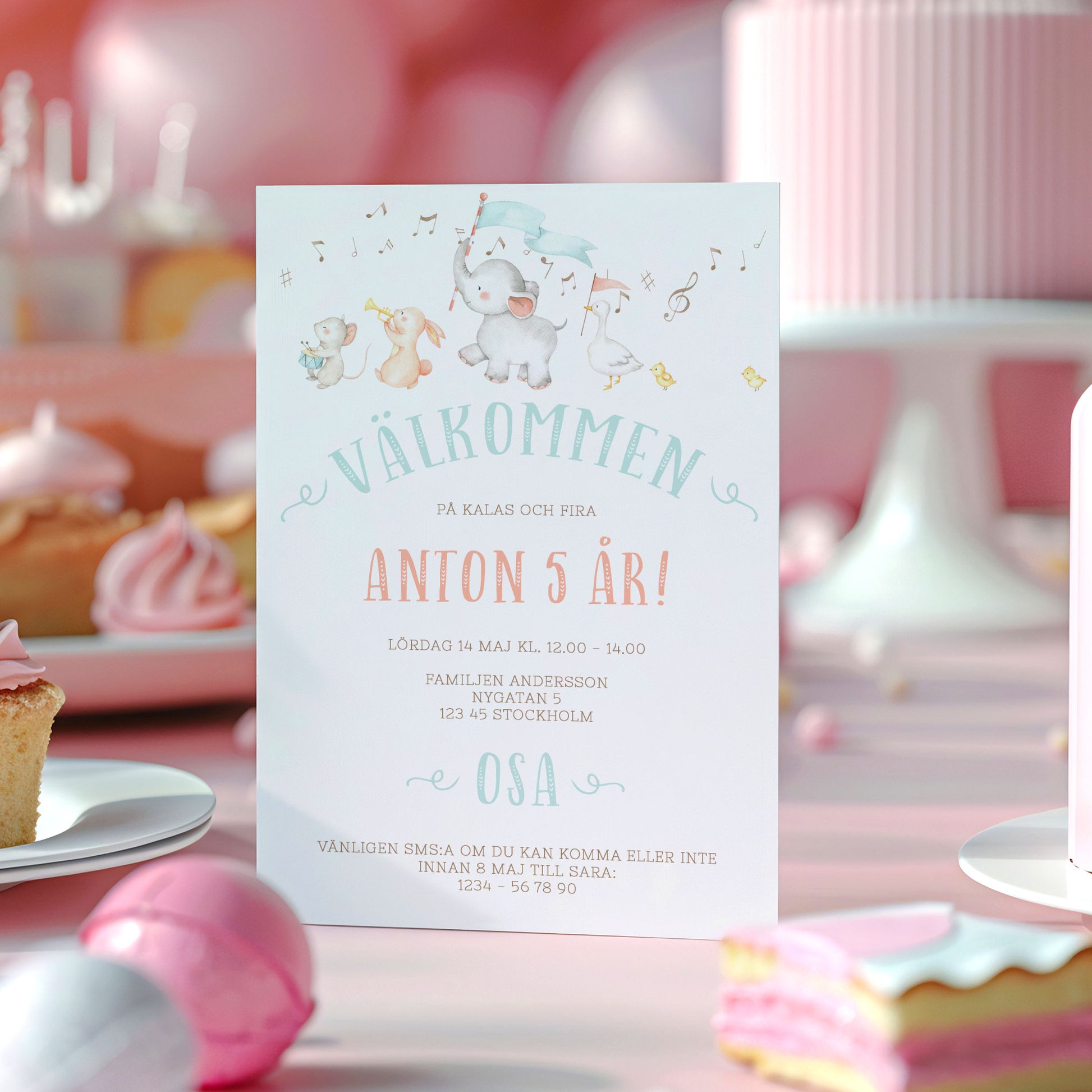 Barnkalas Inbjudningskort – Djurparad – A6 Tryckt Kort för Födelsedagskalas BK003
