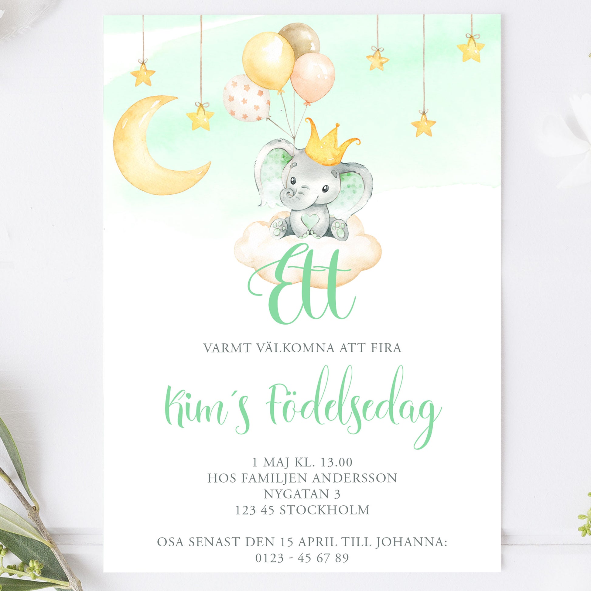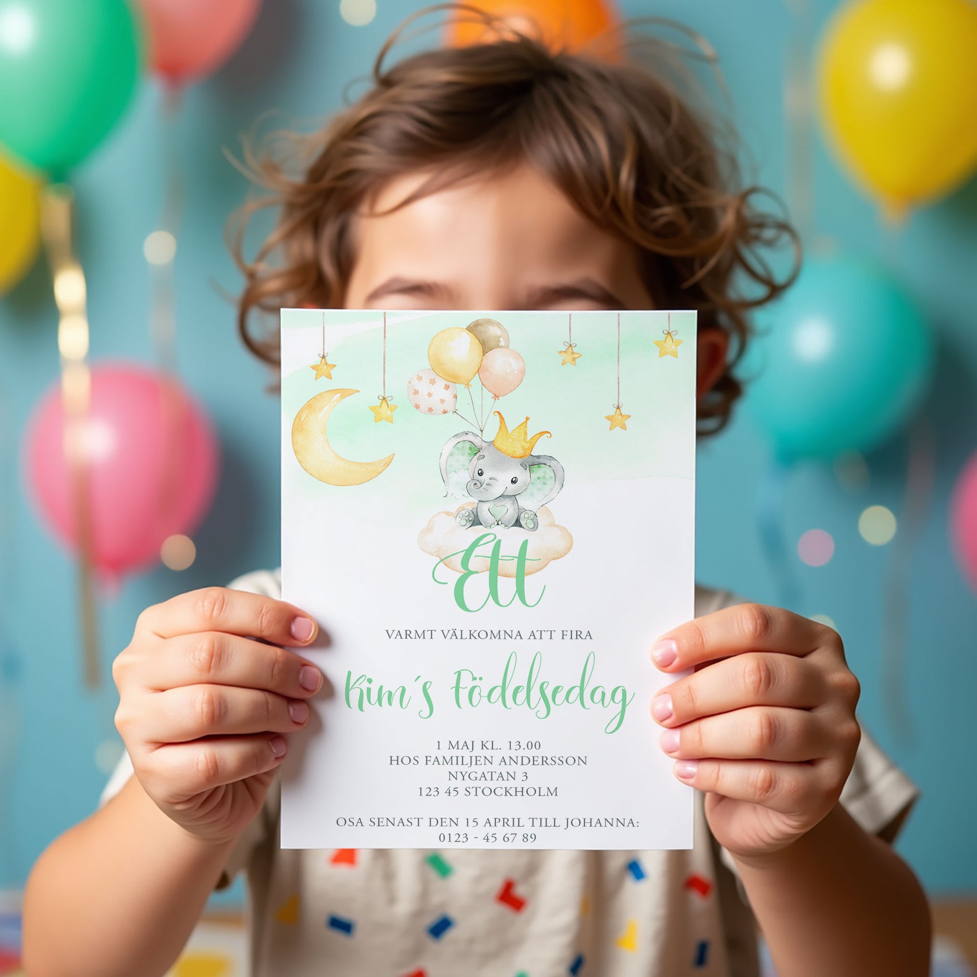 Barnkalas Inbjudningskort – Elefant med Ballonger Grön – A6 Tryckt Kort för Födelsedagskalas BK002g