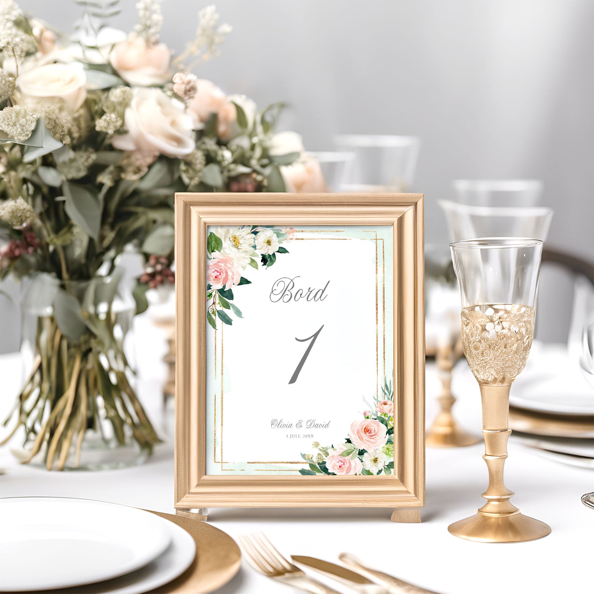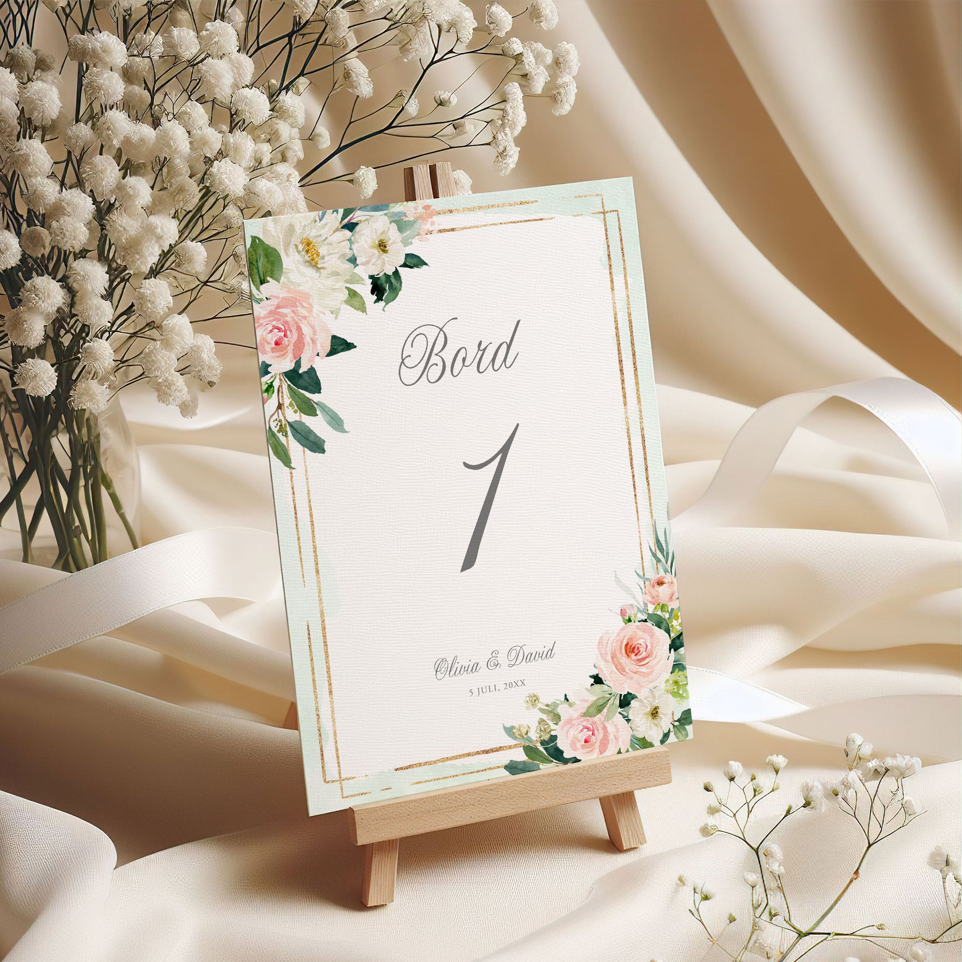 Bordsnummerkort till bröllop – Mint & Guld Somrigt – Tryckt kort för dukning och bordsplacering BR009
