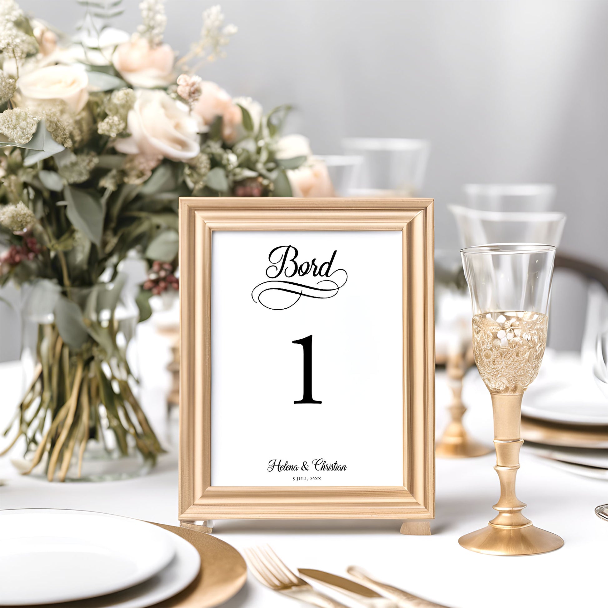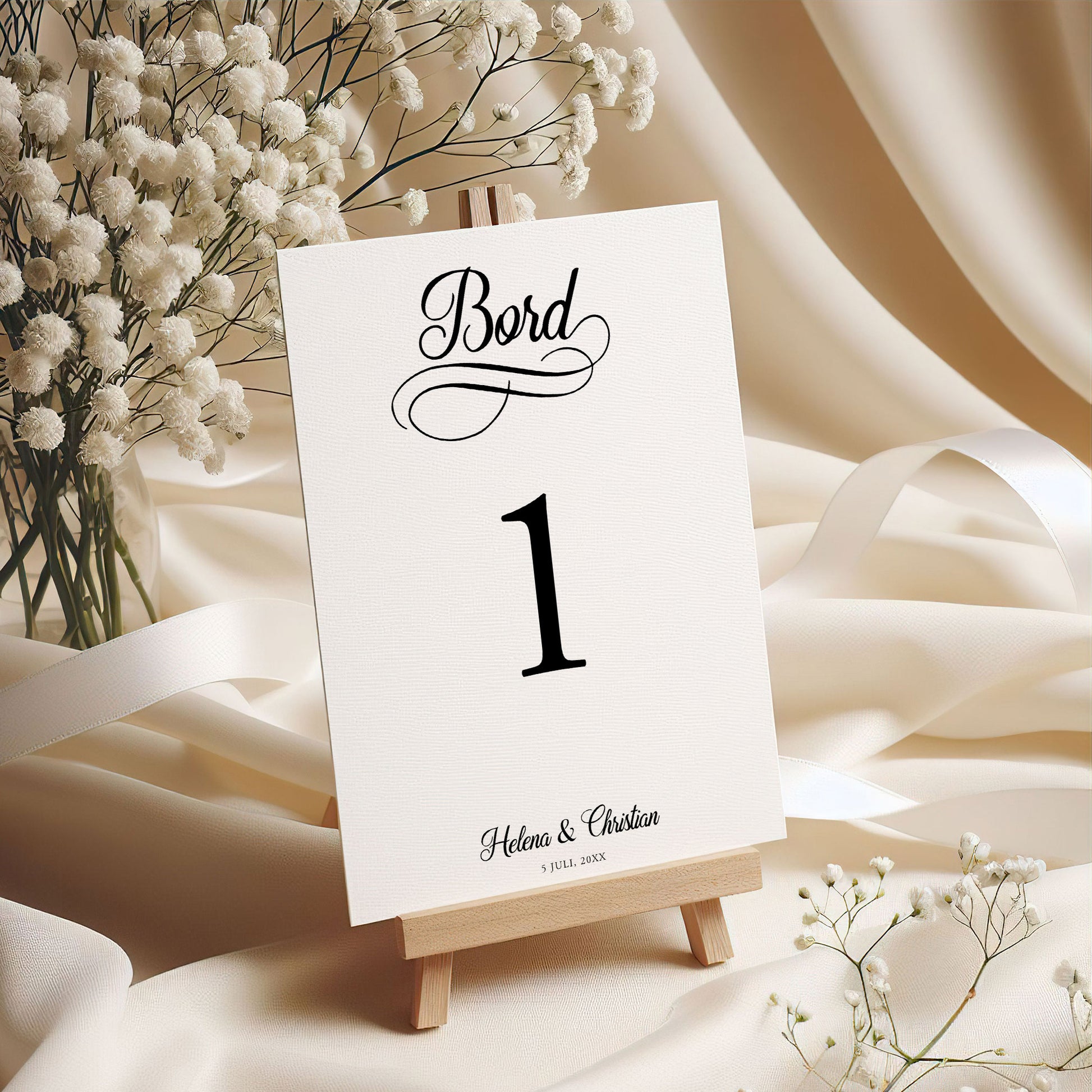 Bordsnummerkort till bröllop – Modern Script Svartvitt – Tryckt kort för dukning och bordsplacering BR004