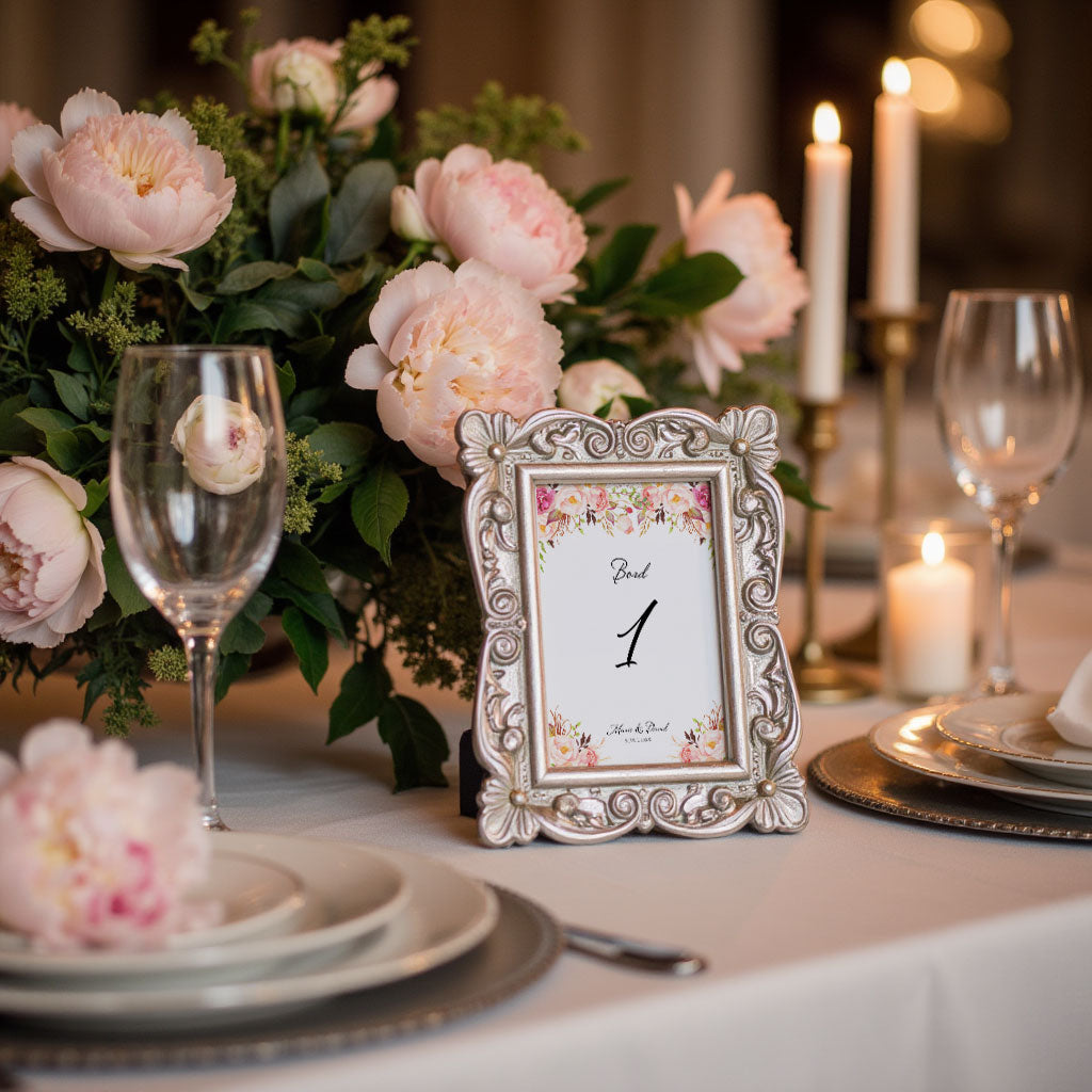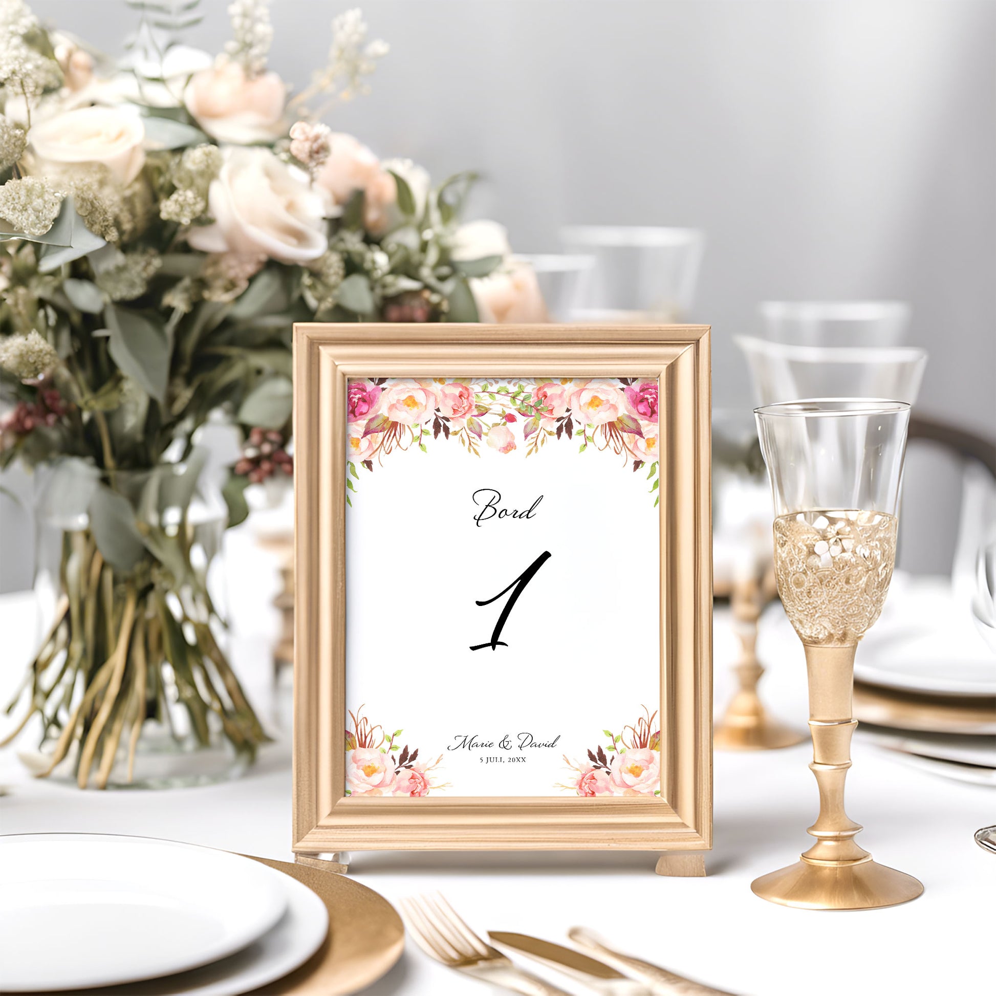 Bordsnummerkort till bröllop – Peach & Blush blommigt, somrigt – Tryckt kort för dukning och bordsplacering BR006