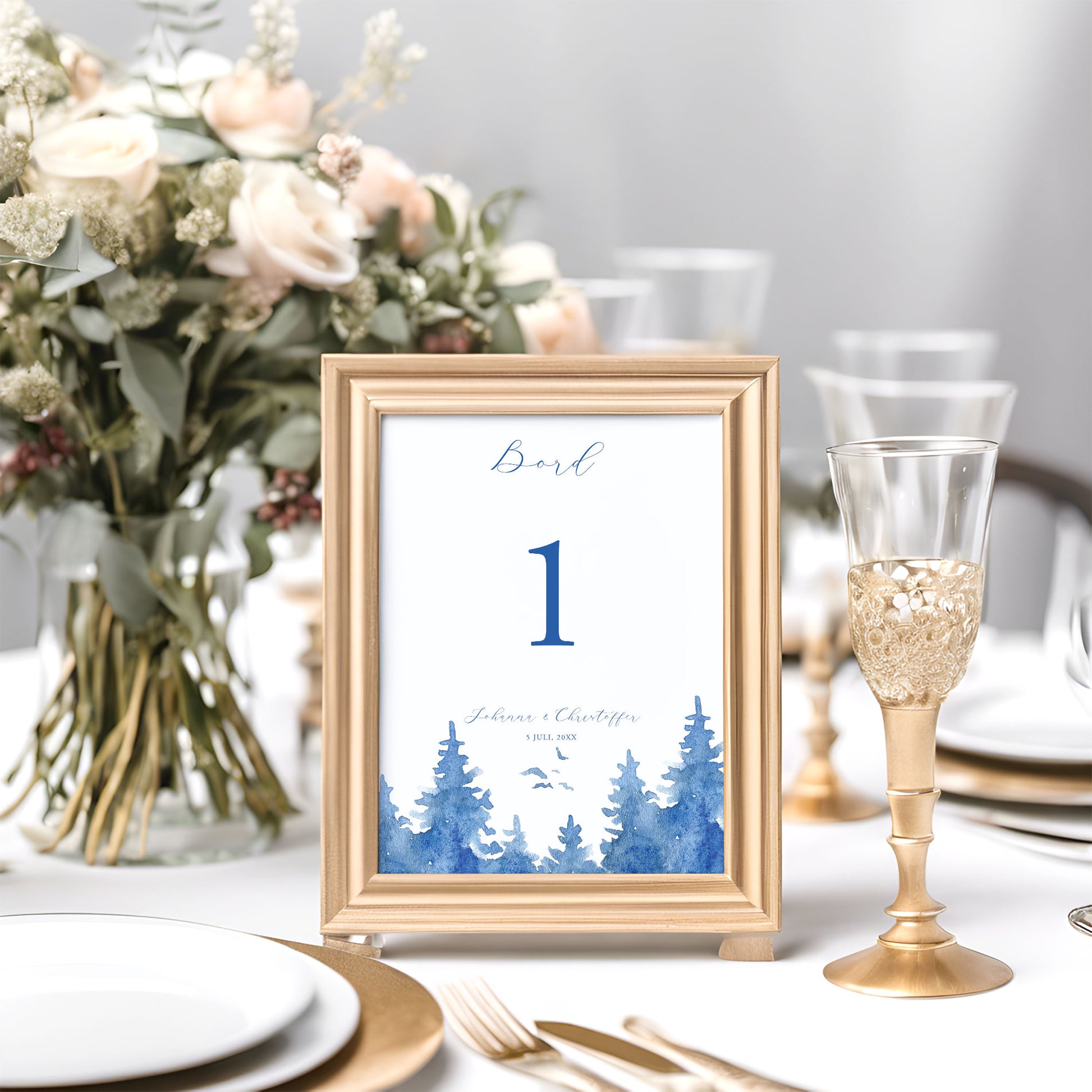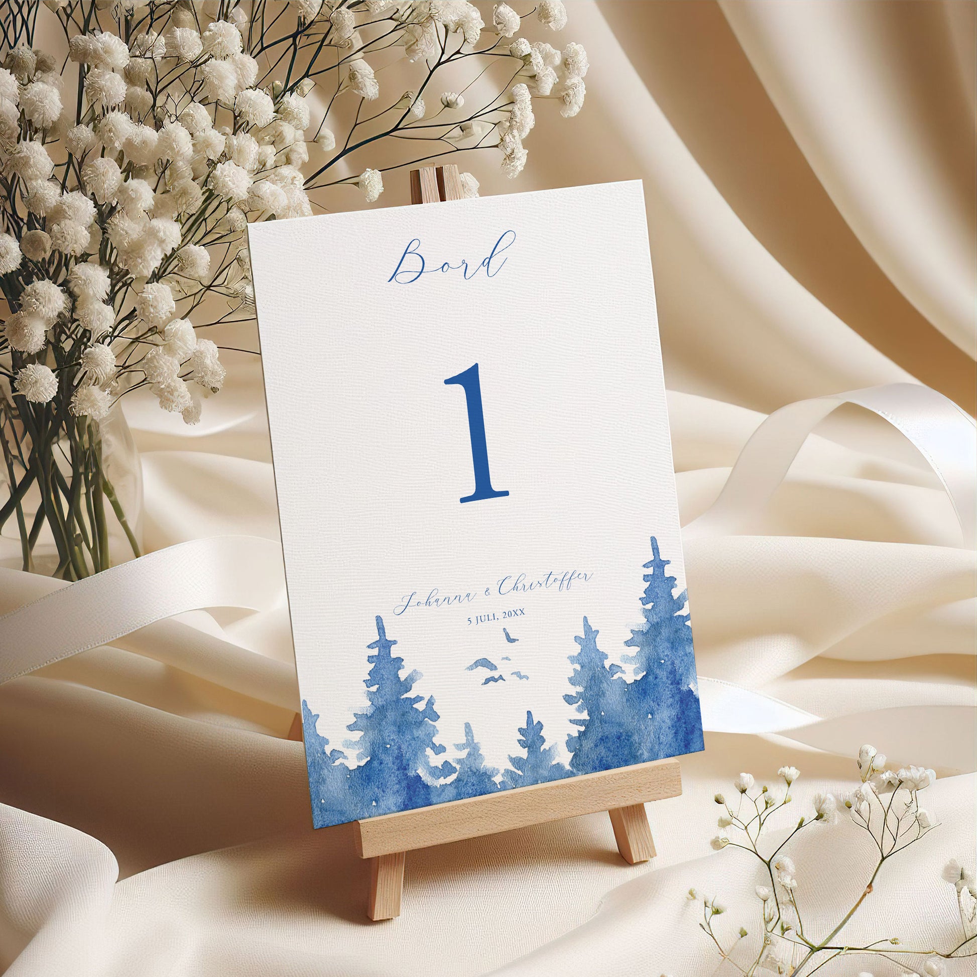 Bordsnummerkort till bröllop – Vintrigt blått akvarelltryck – Tryckt kort för dukning och bordsplacering BR008
