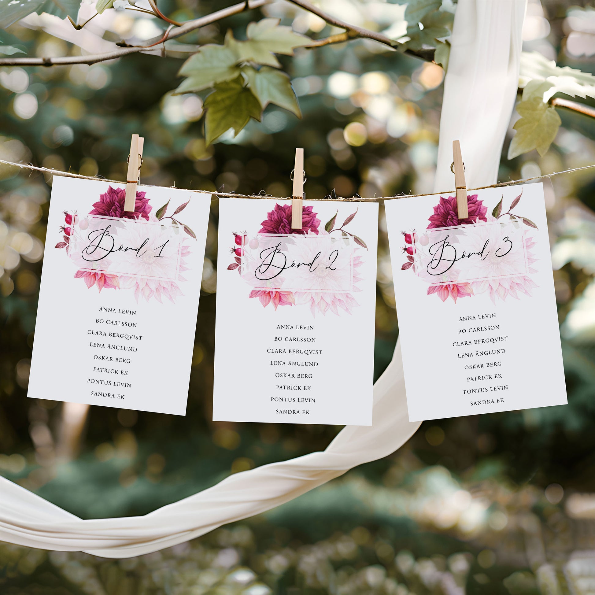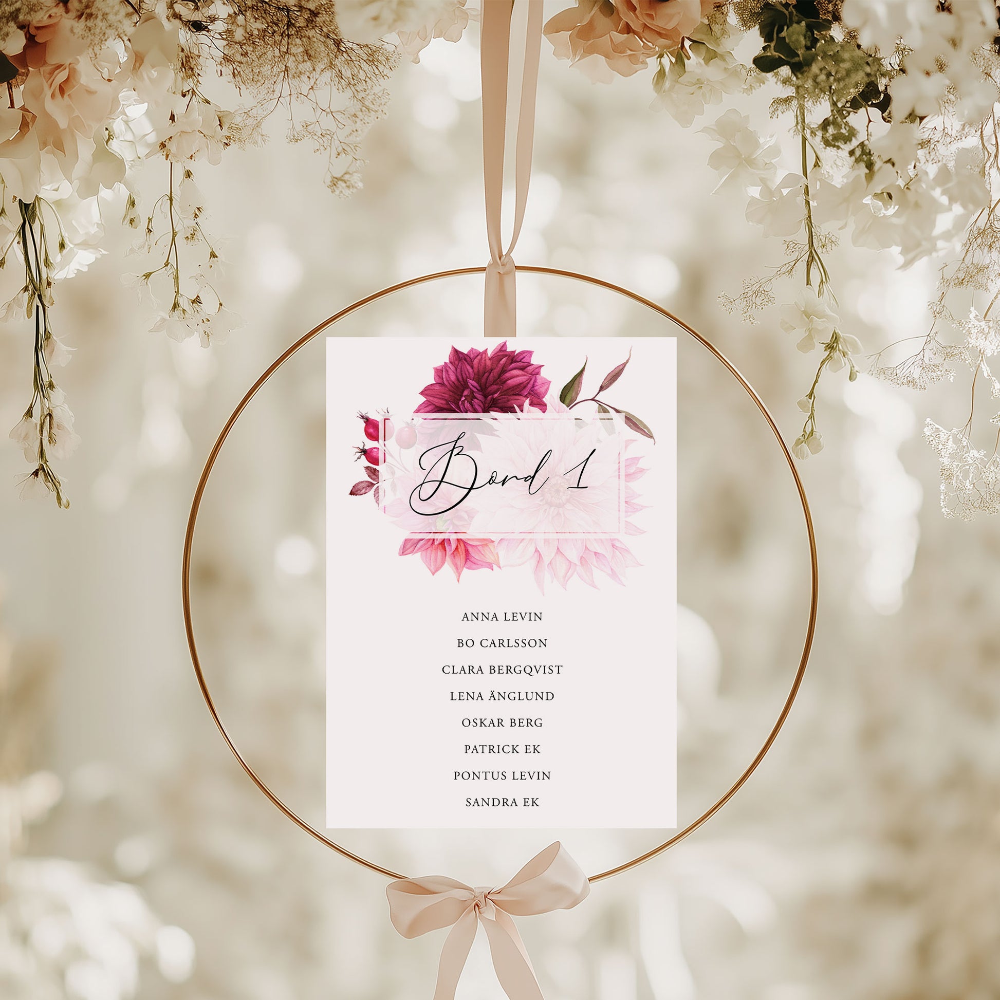 Bordsplaceringskort till bröllop – Burgundy Dahlia – Titelskylt & bordskort för gäster BR002