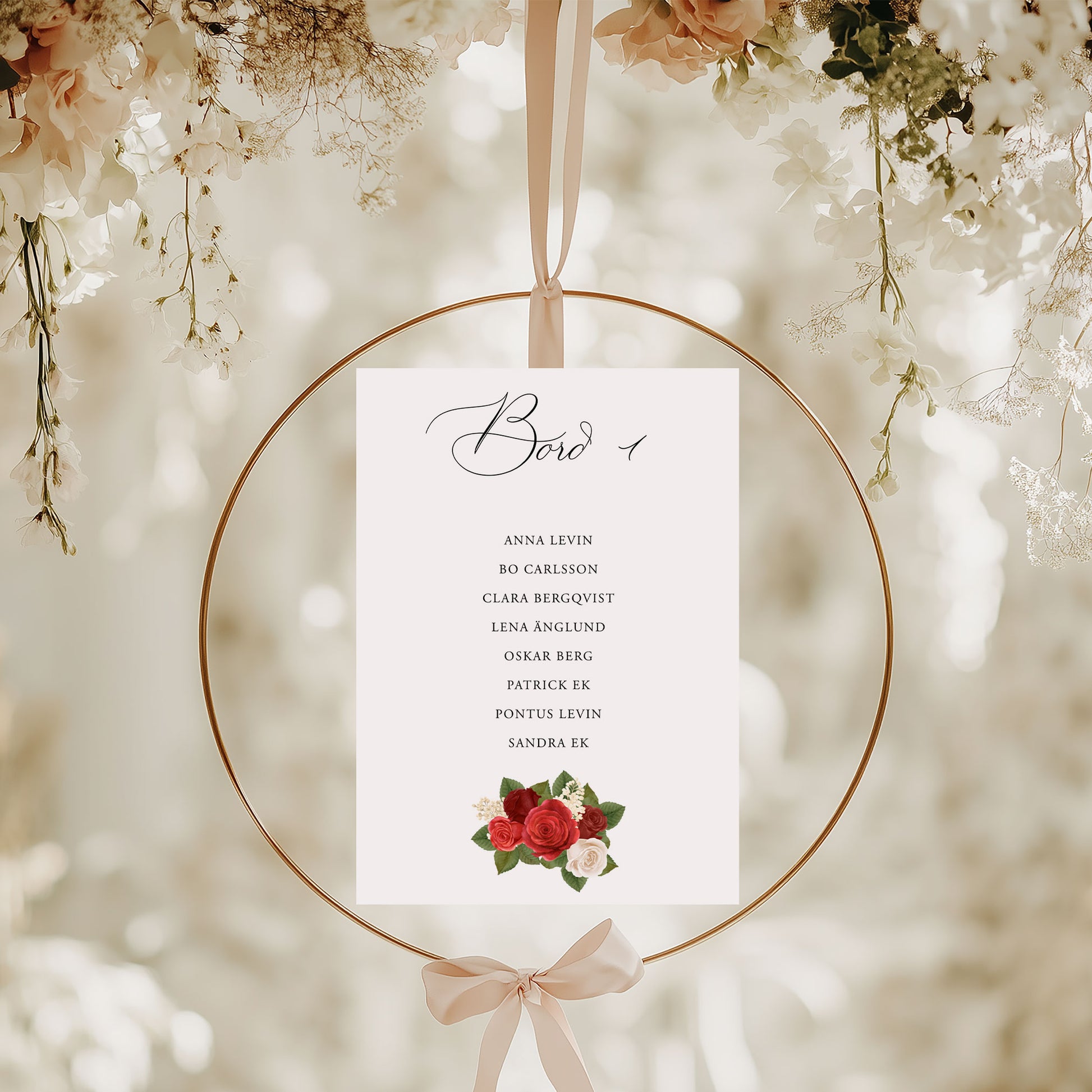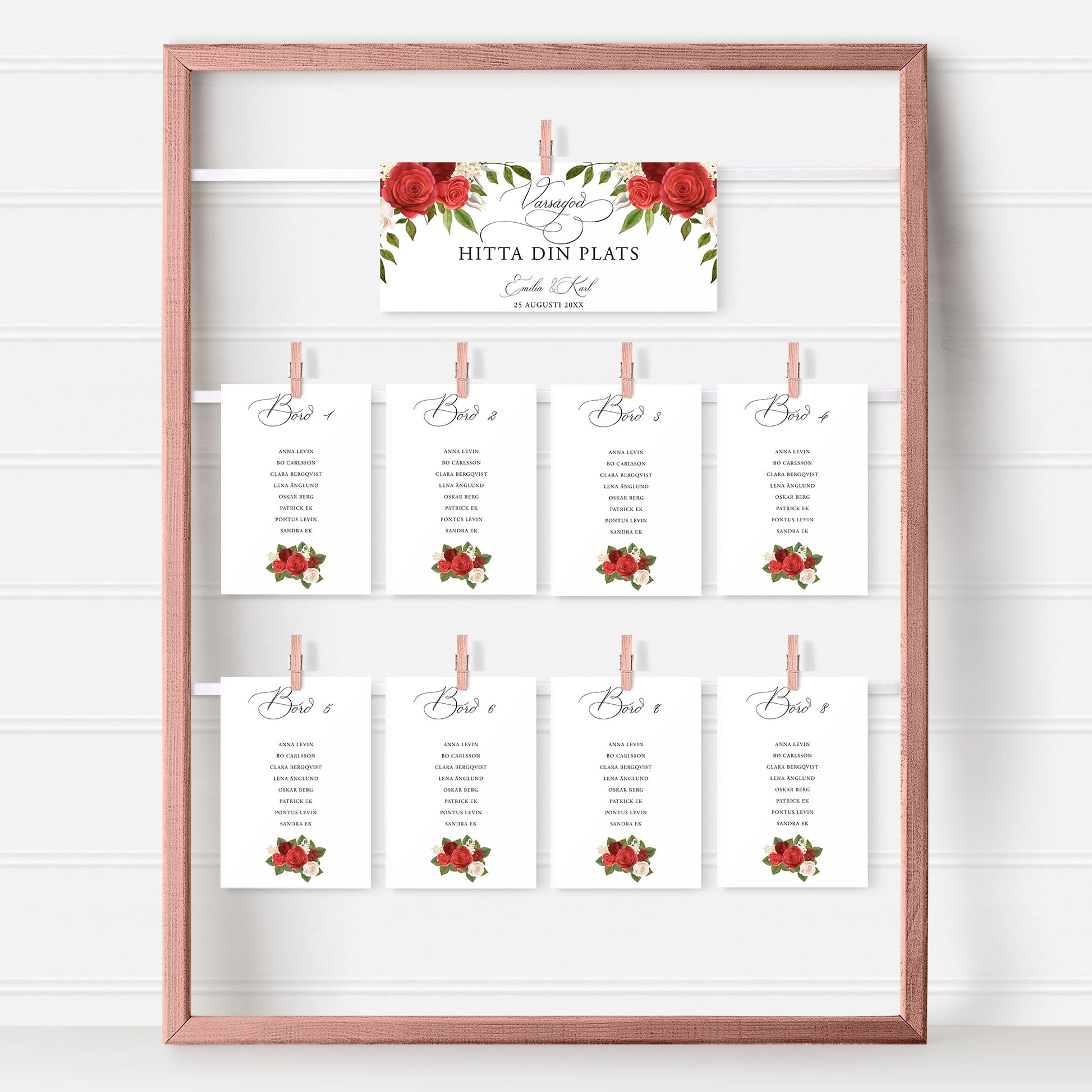 Bordsplaceringskort till bröllop – Röda rosor romantiskt – Titelskylt & bordskort för gäster BR010
