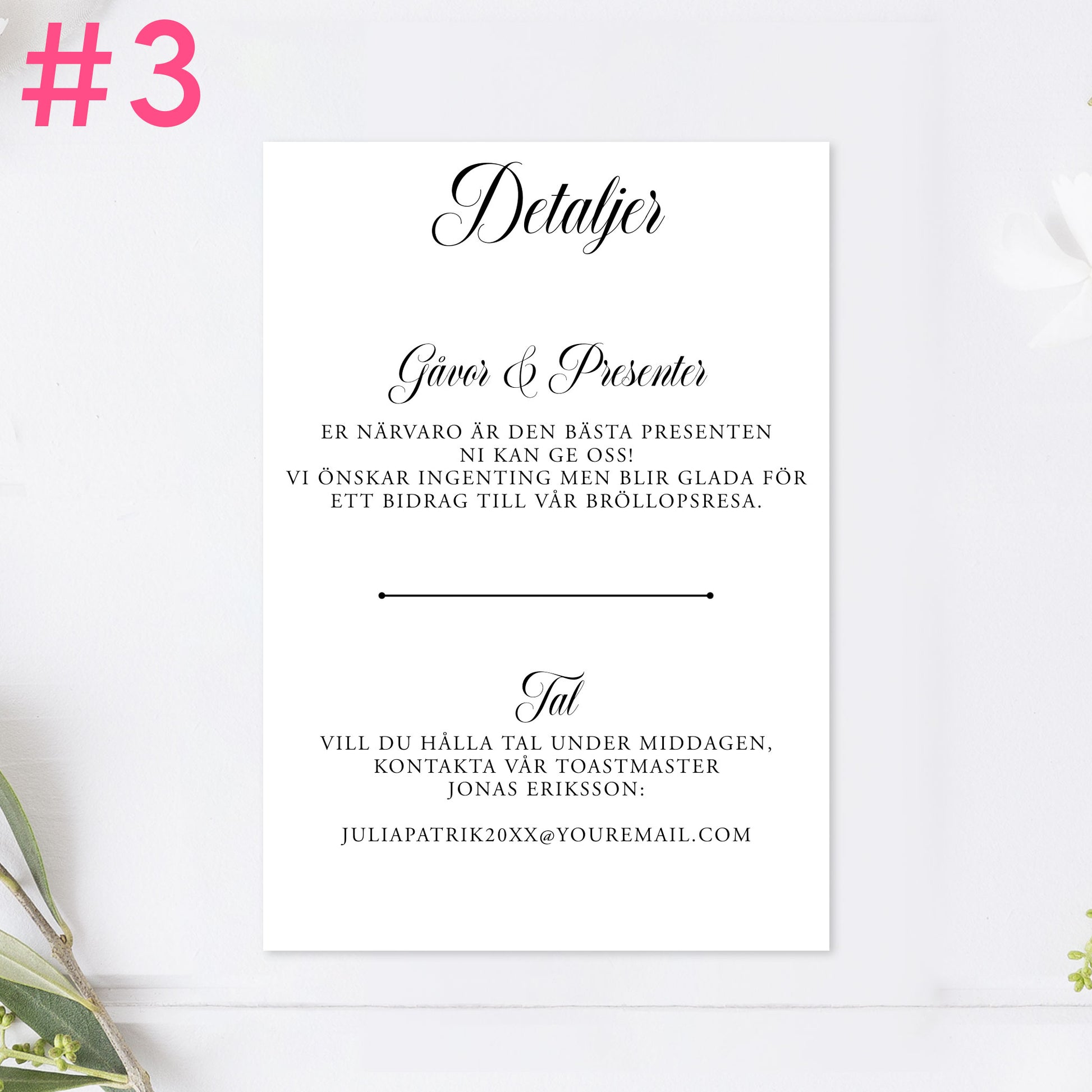 BR003-3 - Informationskort- Formellt svartvitt - Tryckt bröllopskort