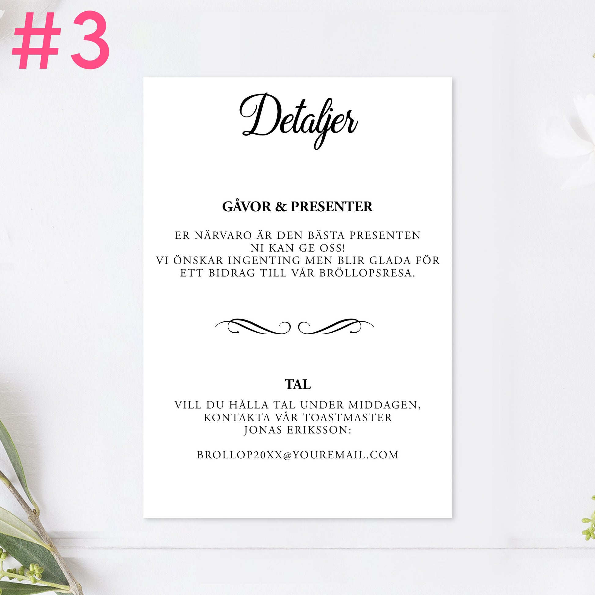 BR004-3 - Informationskort - Modern Script Svartvitt - Tryckt bröllopskort