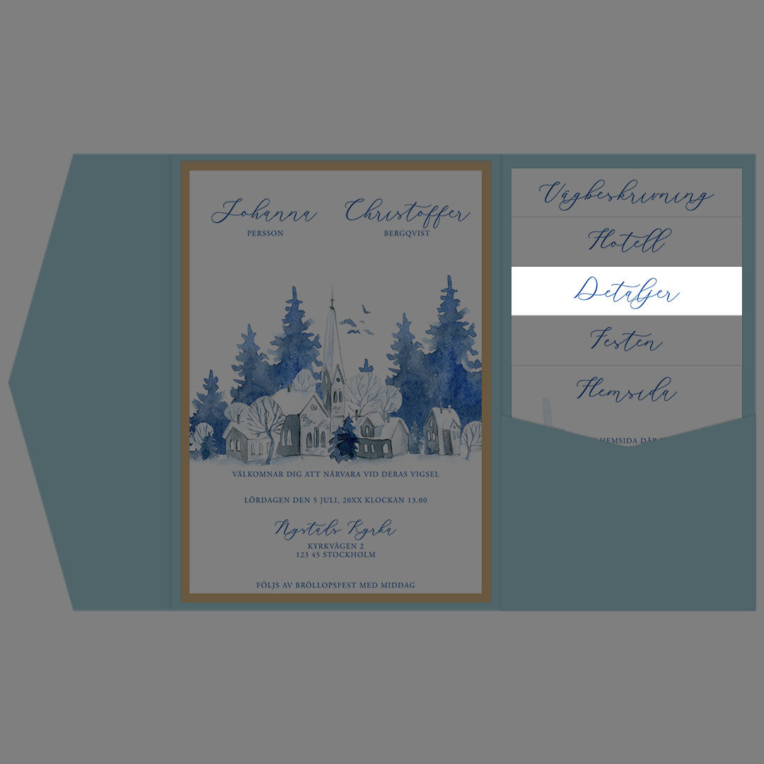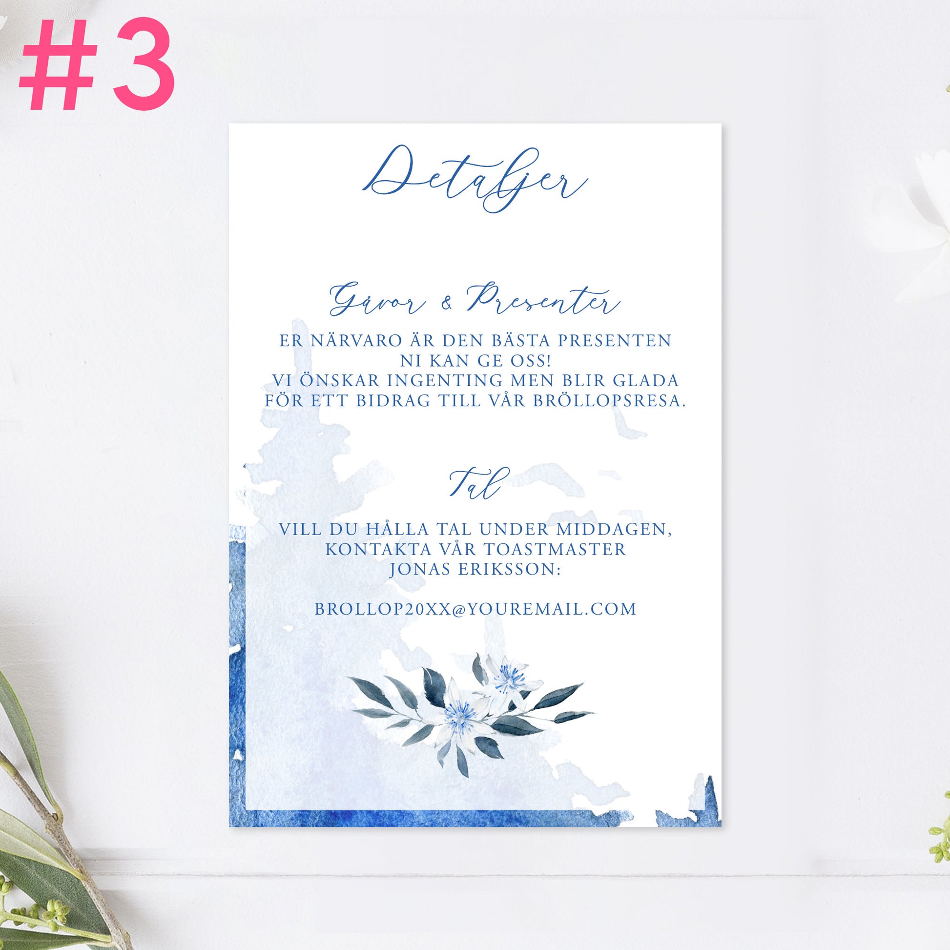 BR008-3 - Informationskort - Vintrigt blått akvarelltryck - Tryckt bröllopskort
