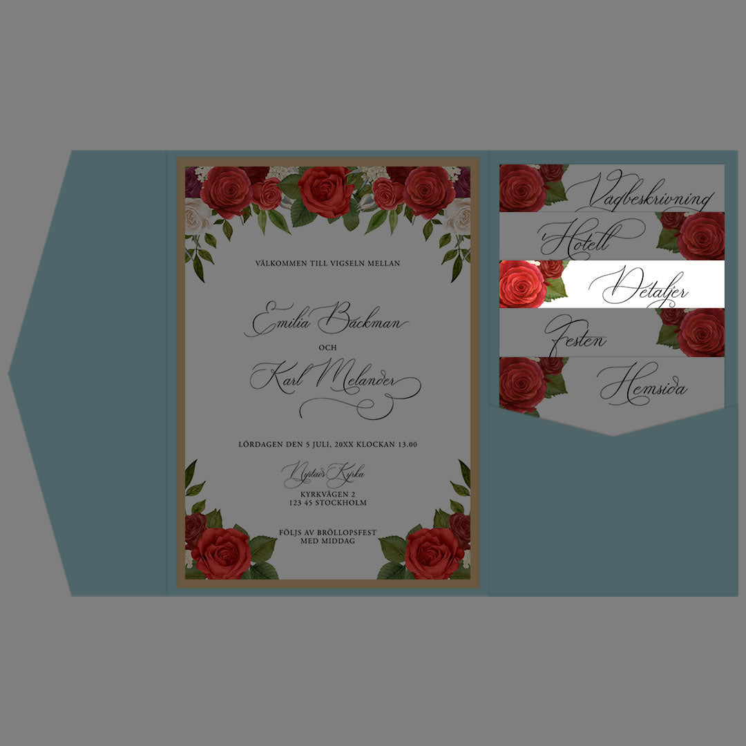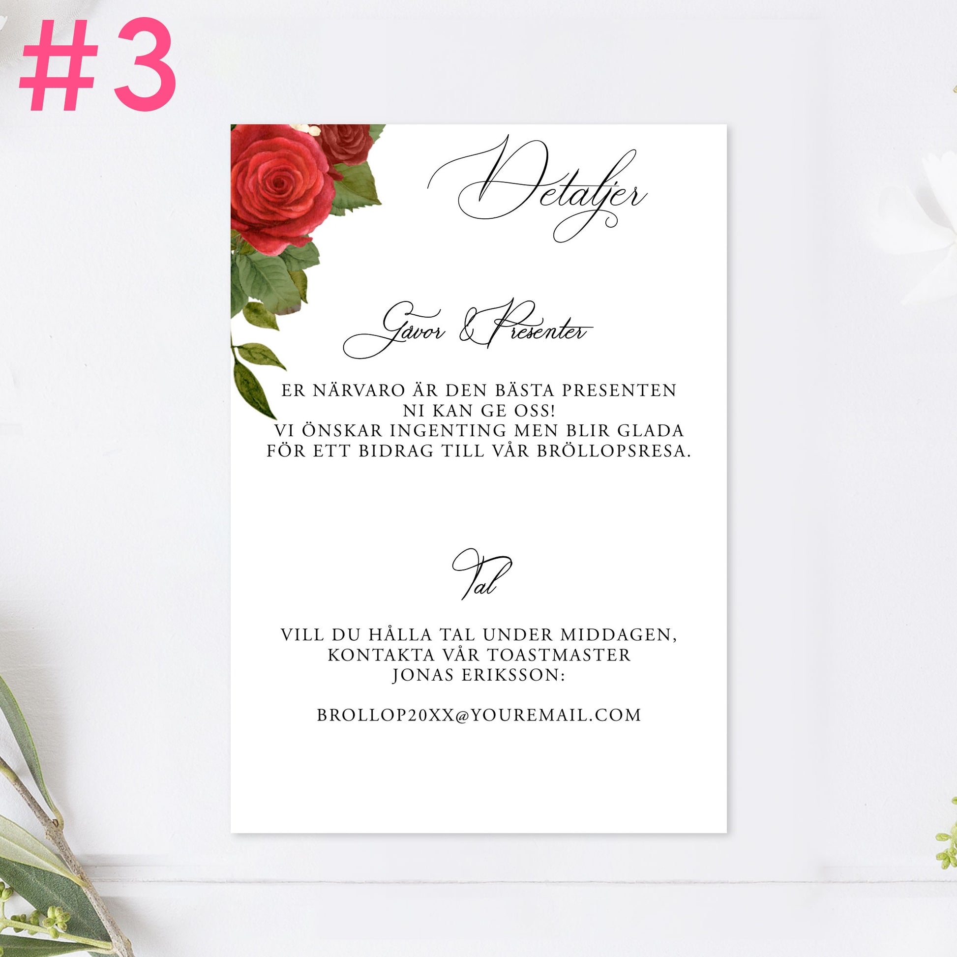 BR010-3 - Informationskort - Romantiskt Röda Rosor - Tryckt bröllopskort