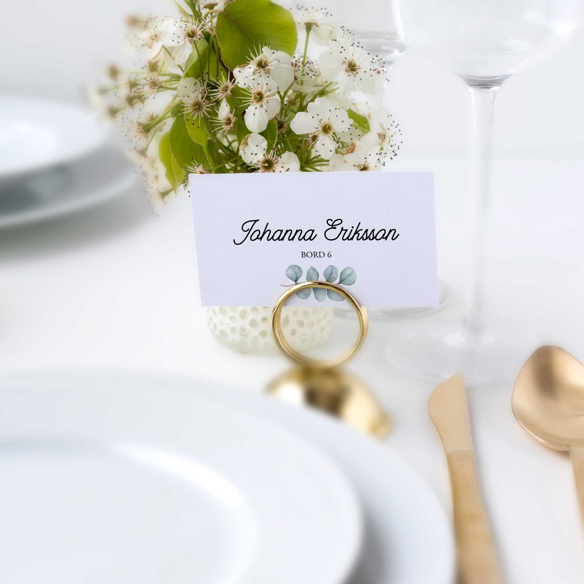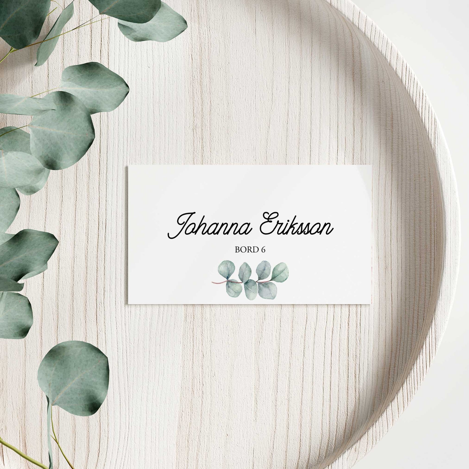 Enkla placeringskort till bröllop – Eucalyptus Elegant – Tryckt kort med namn för dukning BR005