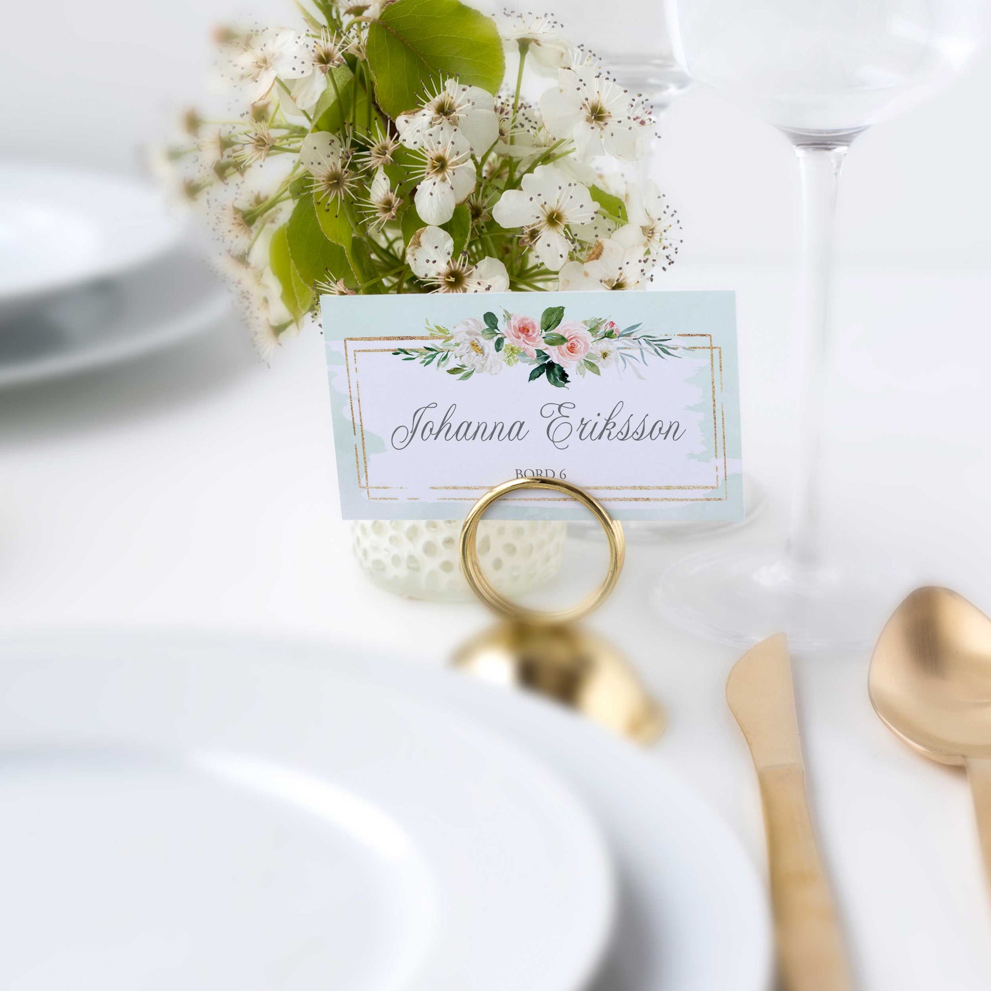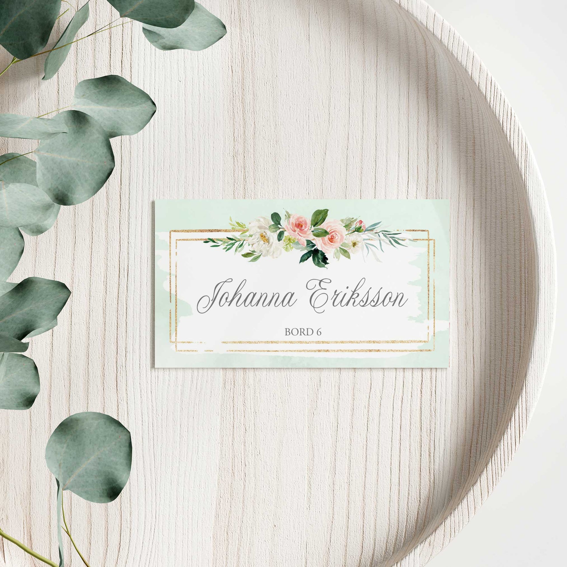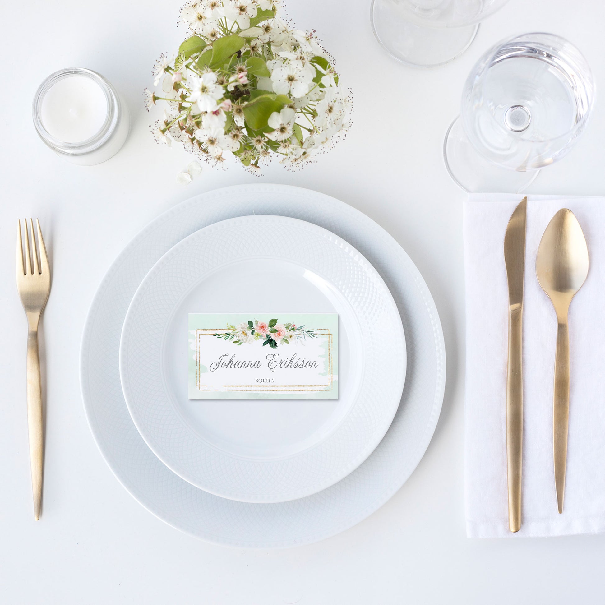Enkla placeringskort till bröllop – Mint & Guld Rosa, blommig, somrig design – Tryckt kort med namn för dukning BR009