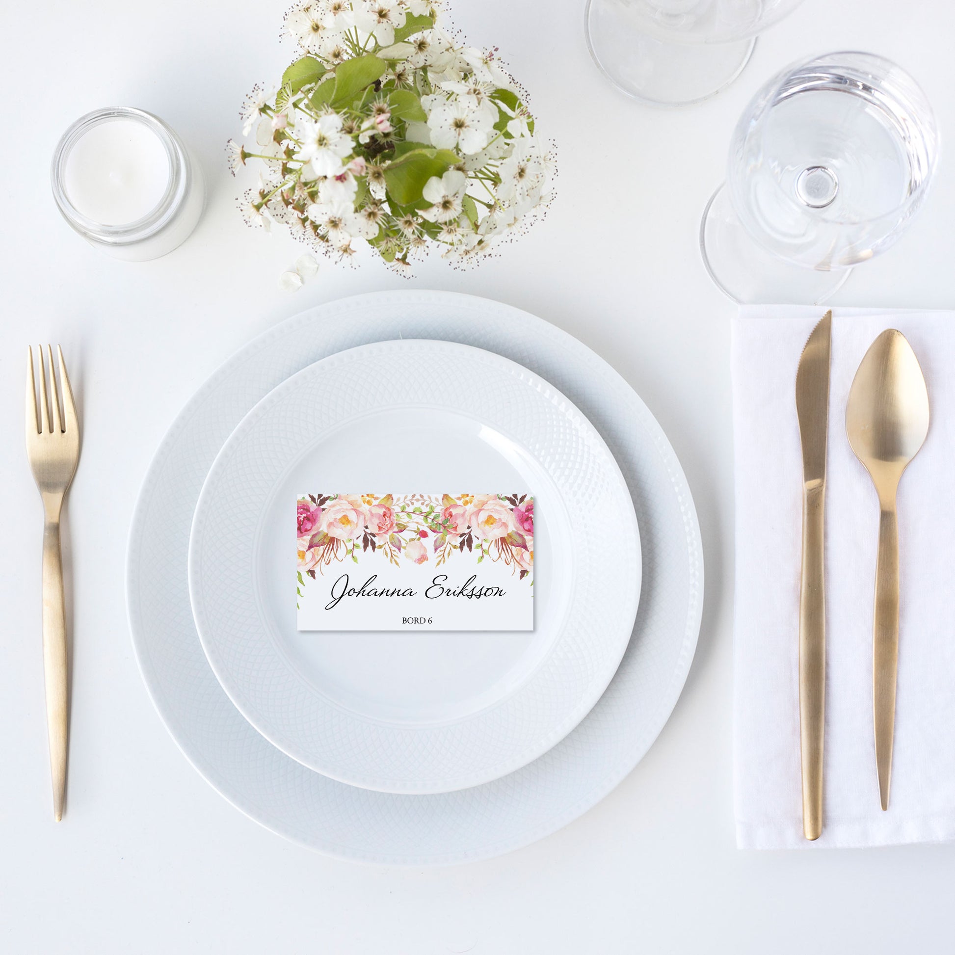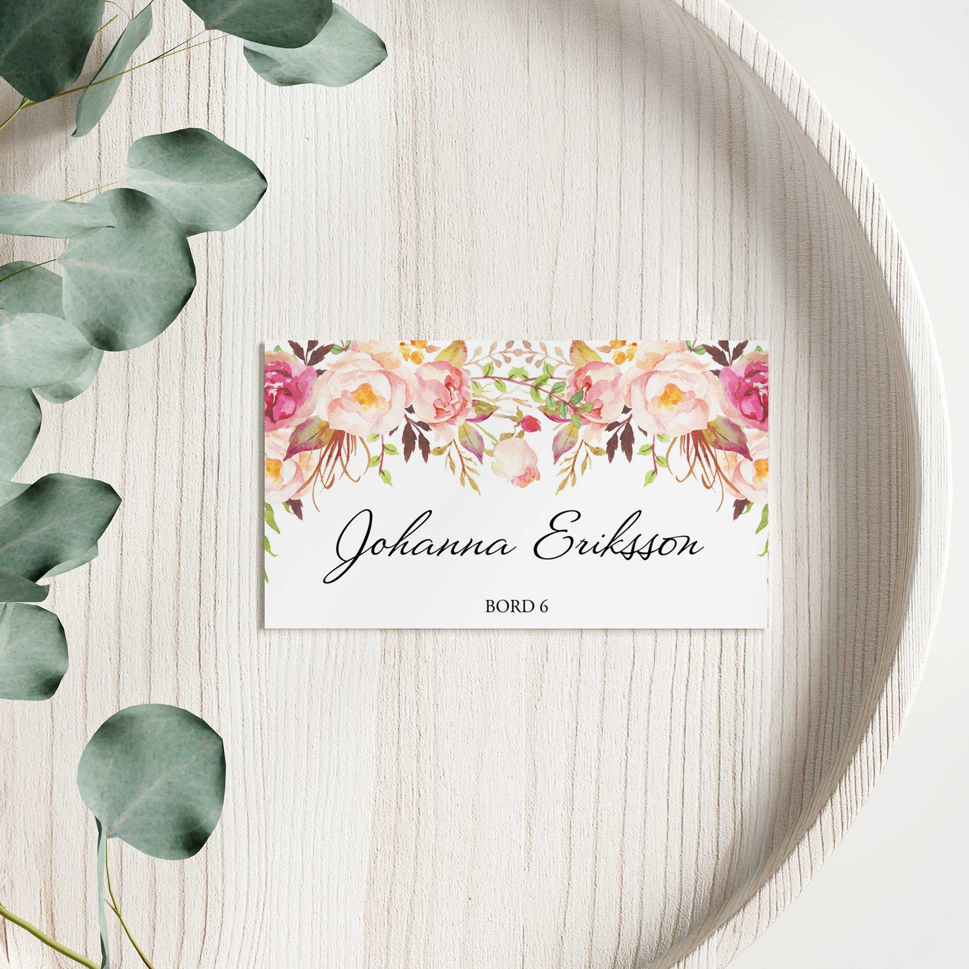 Enkla placeringskort till bröllop – Peach & Blush Blommig Romantisk Somrig – Tryckt kort med namn för dukning BR006