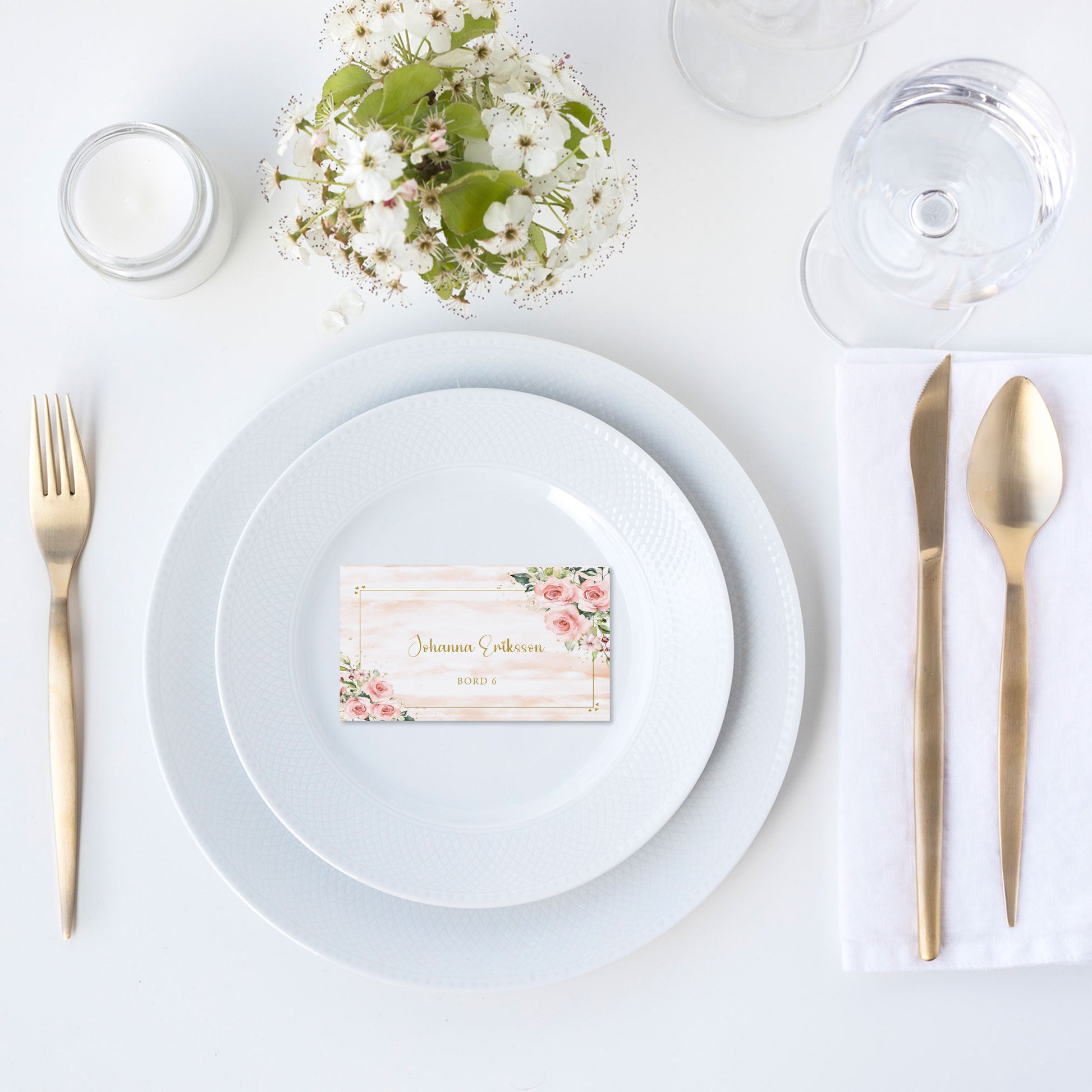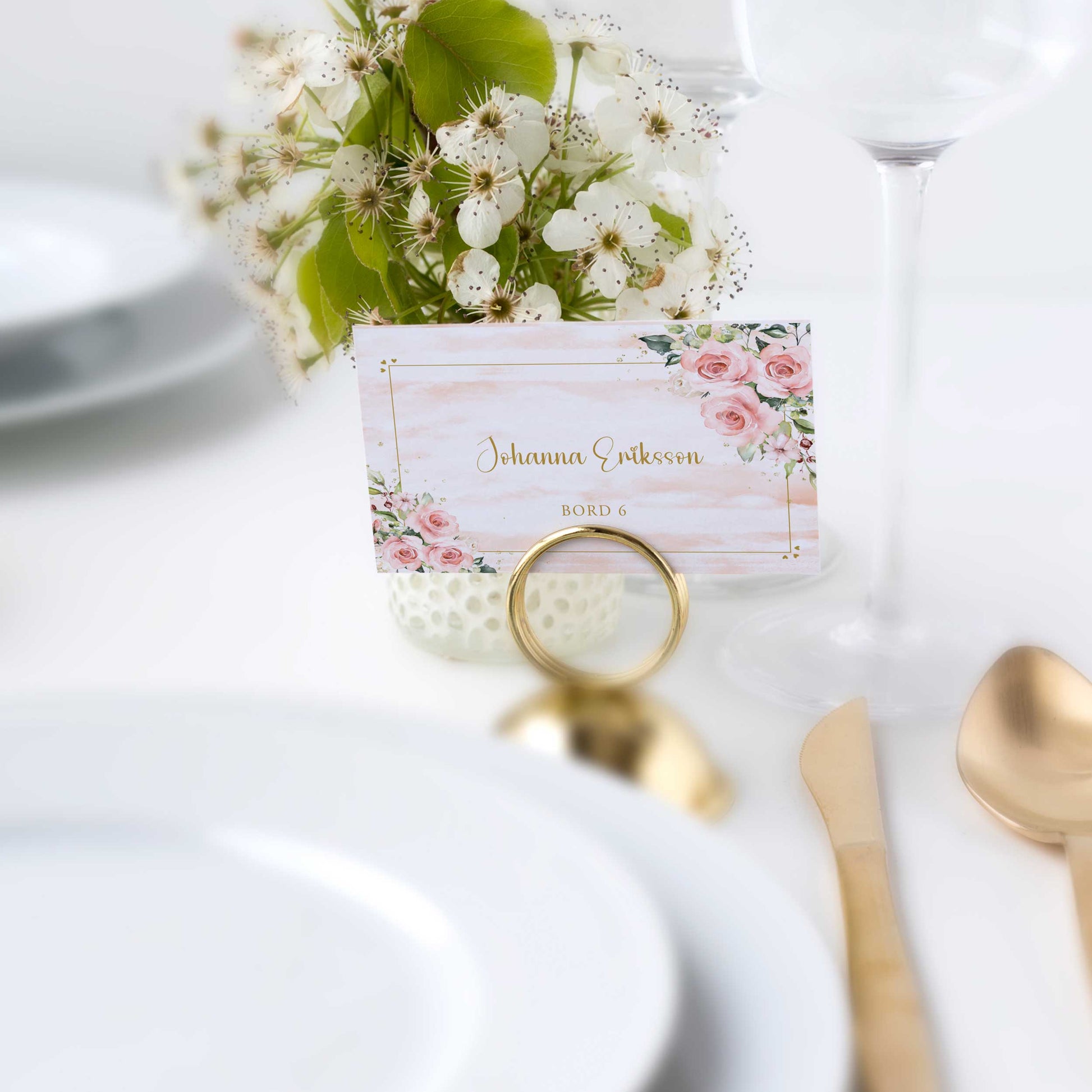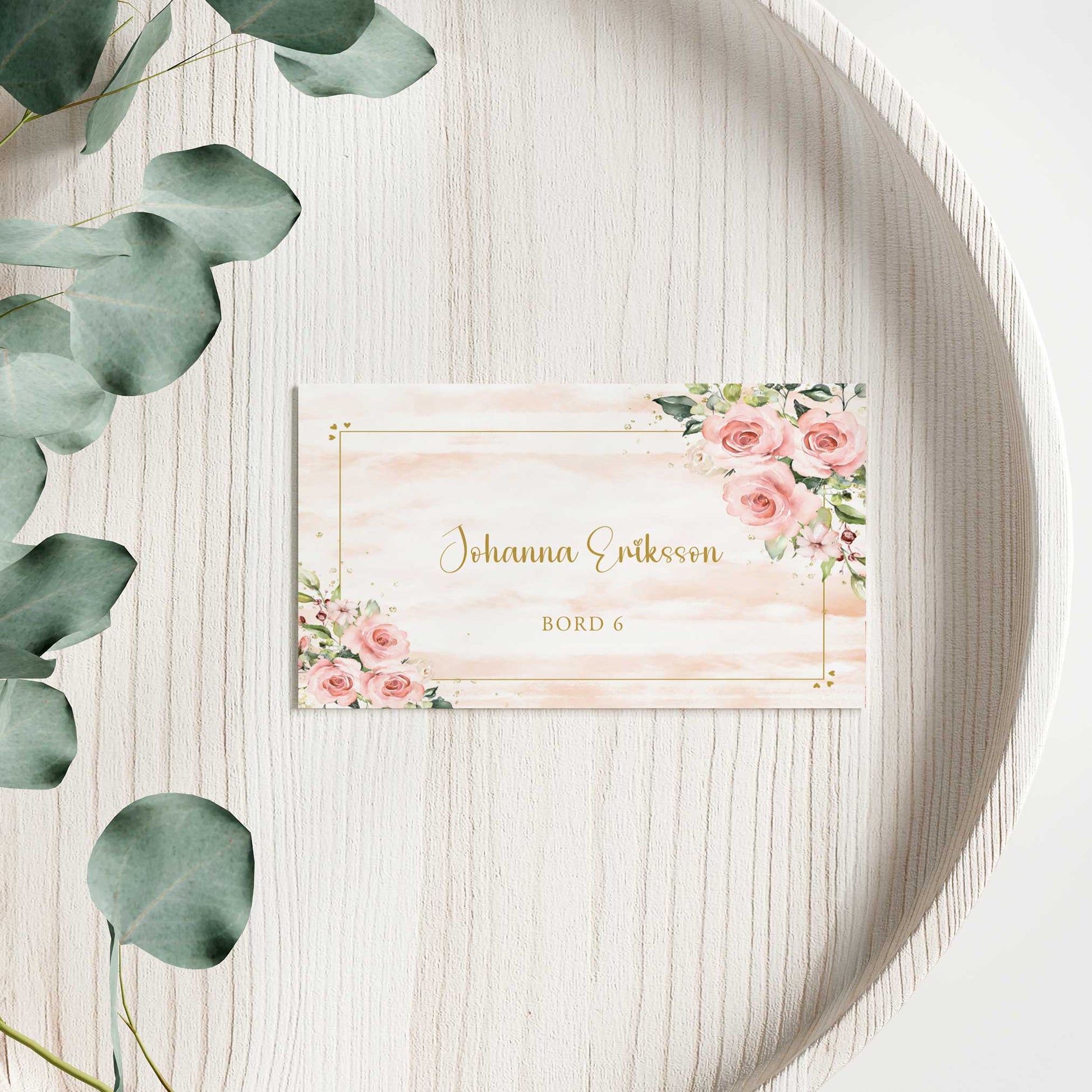 Enkla placeringskort till bröllop – Rosa & Vita Blommor m gulddetaljer – Tryckt kort med namn för dukning BR013
