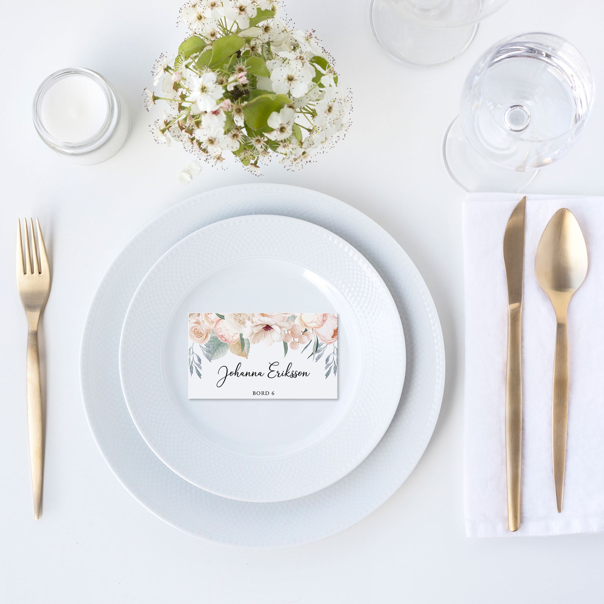 Enkla placeringskort till bröllop – White Floral Mr & Mrs – Tryckt kort med namn för dukning BR001