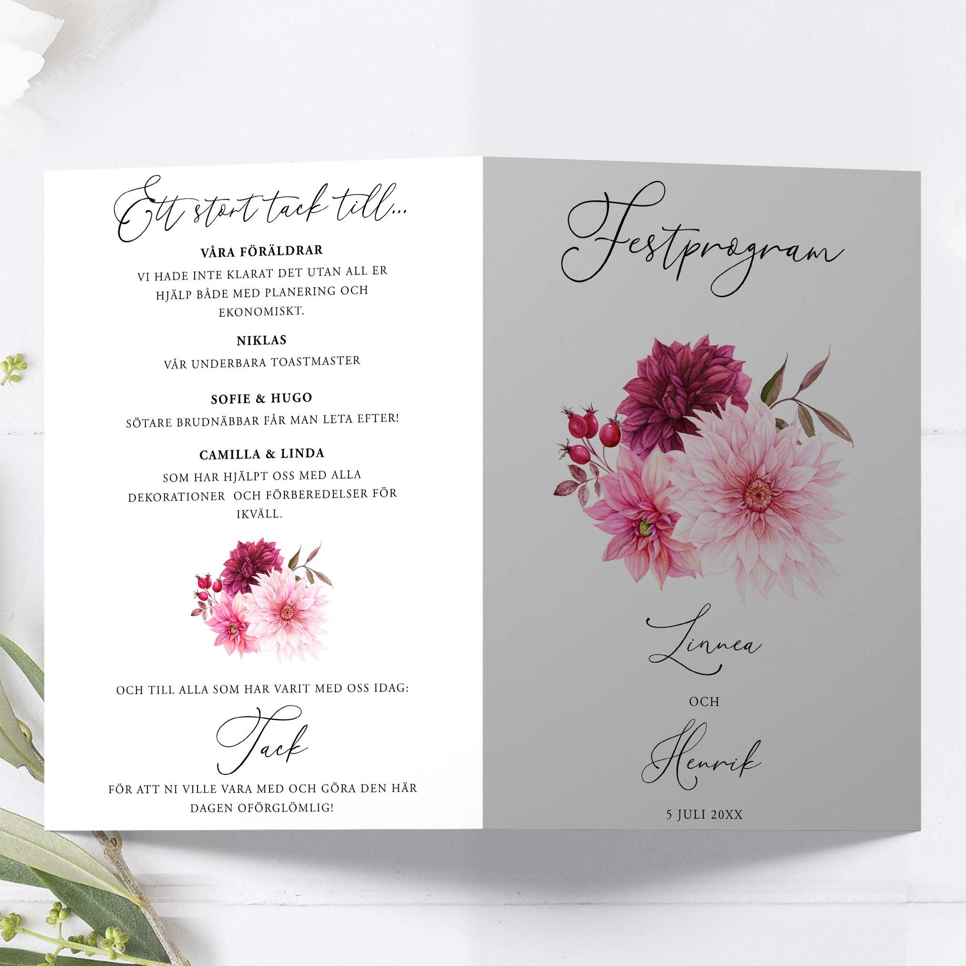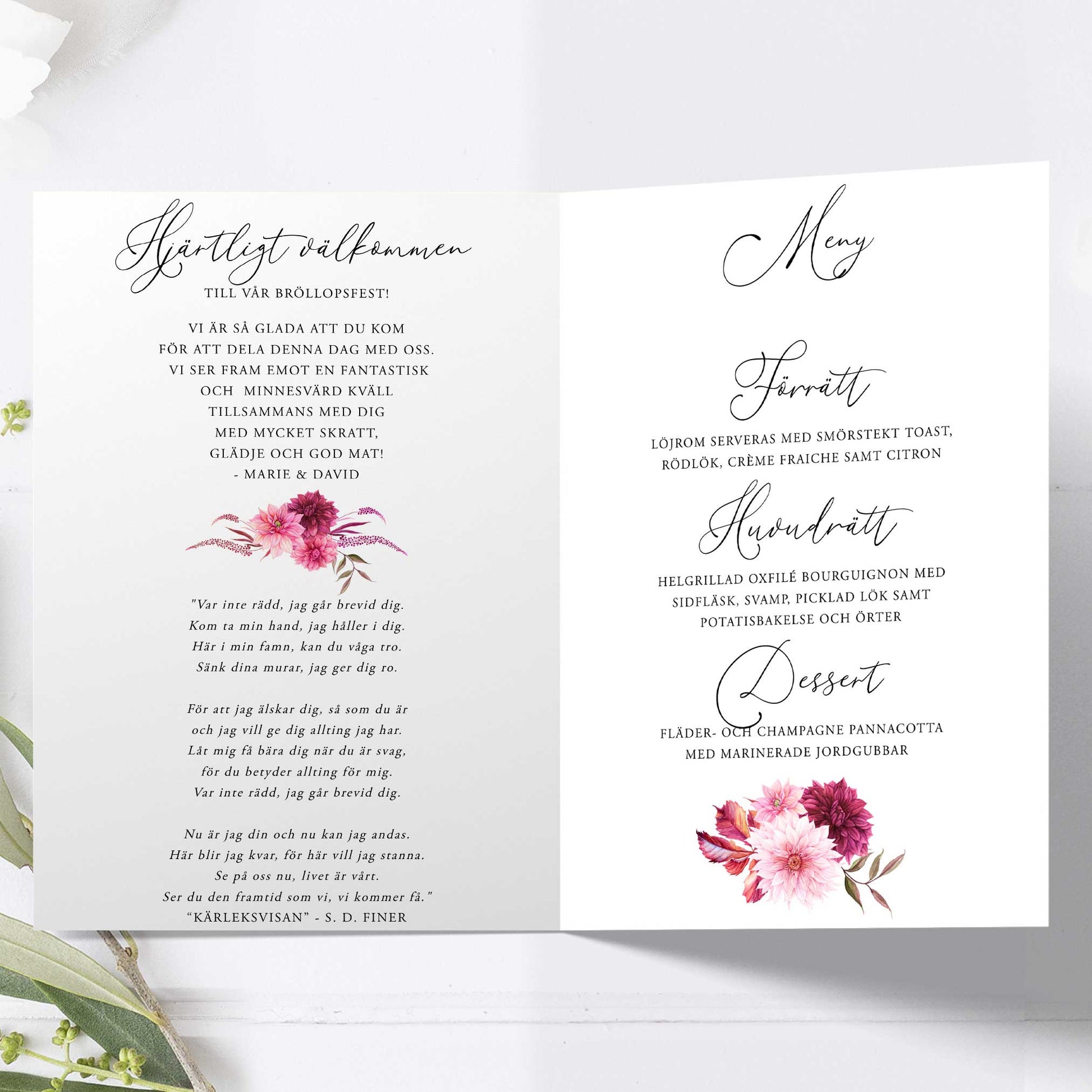 Festprogram litet, till bröllop – Burgundy Dahlia – Tryckt programkort 12,7x17,7 cm BR002