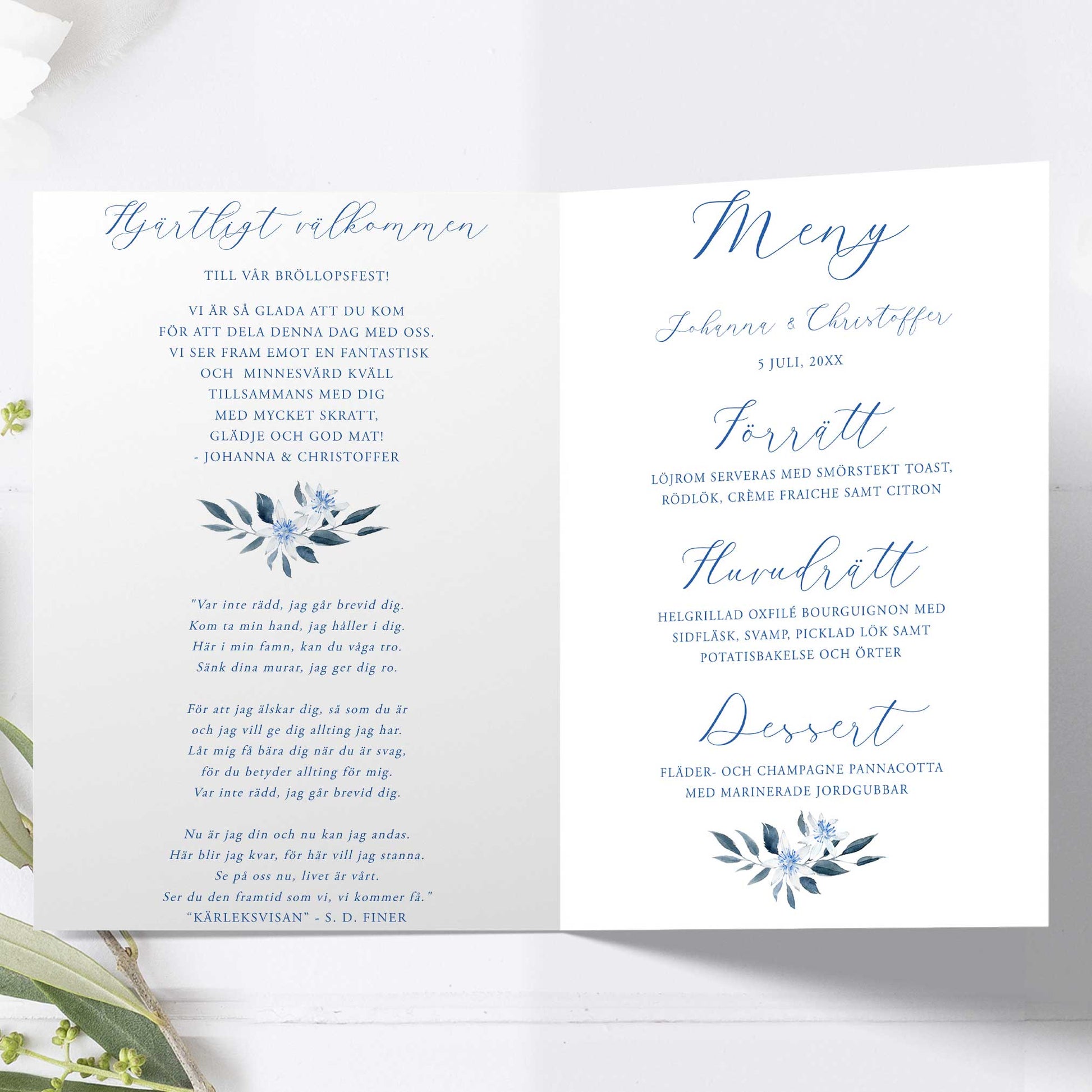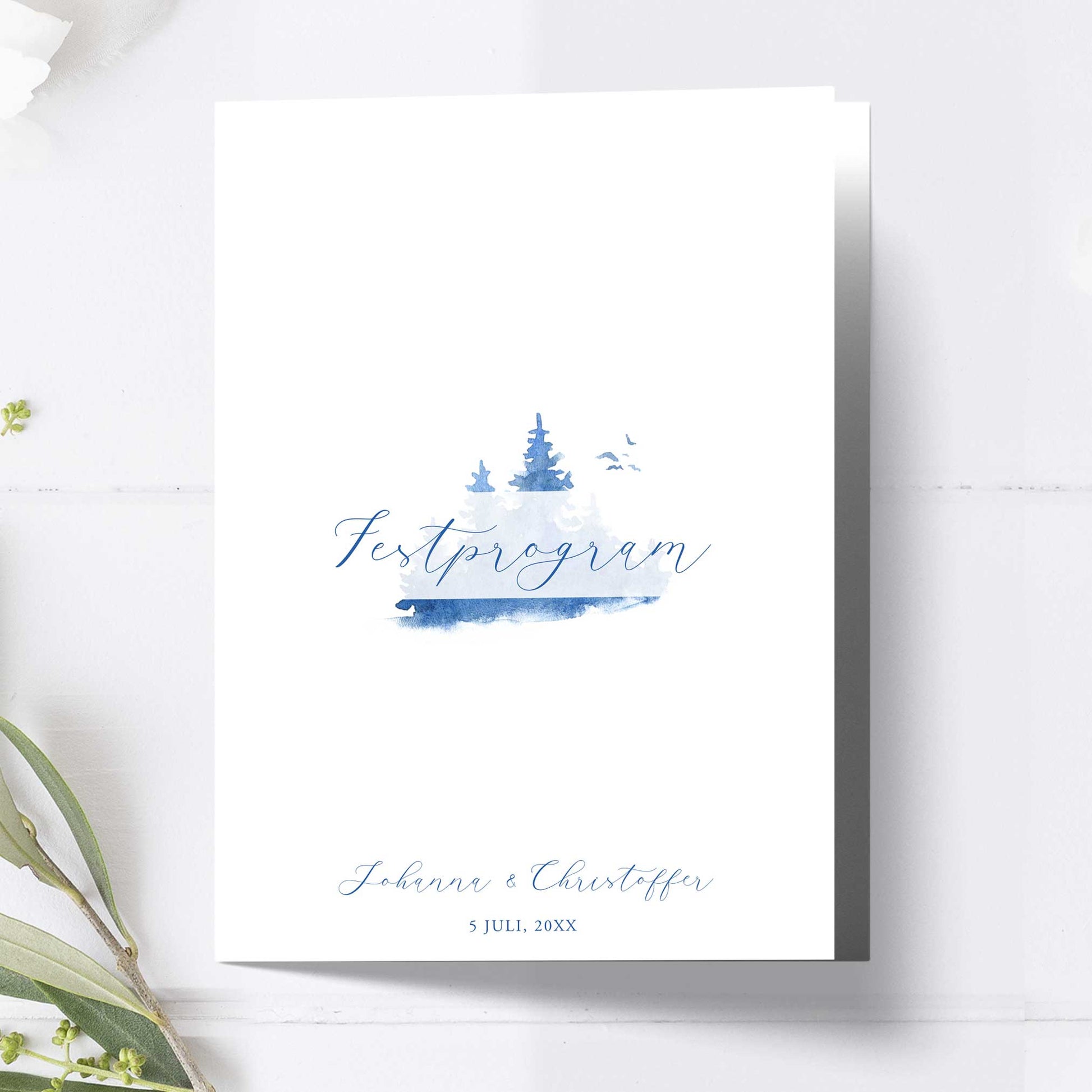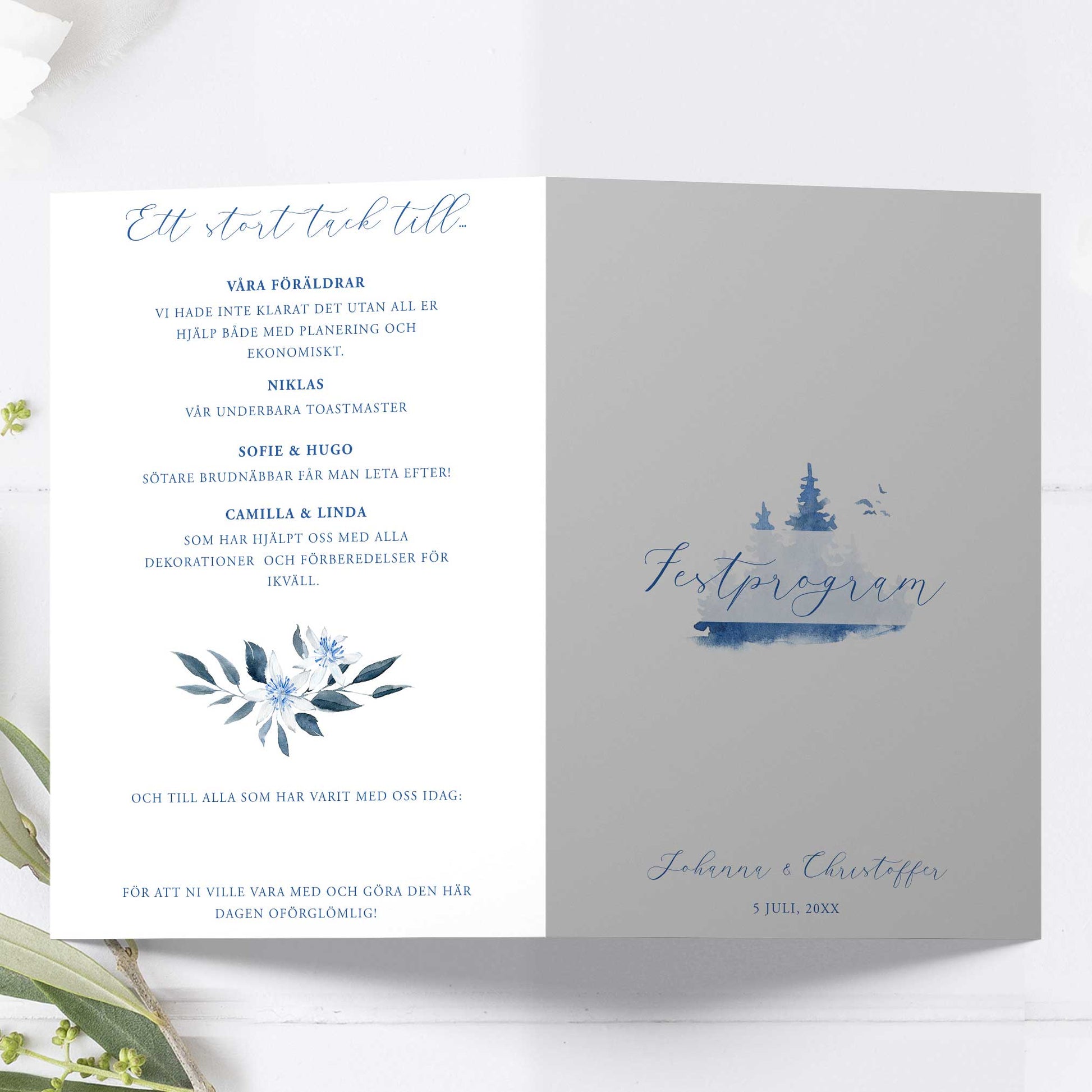 Festprogram litet, till bröllop – Vintrigt blått akvarelltryck – Tryckt programkort 12,7x17,7 cm BR008