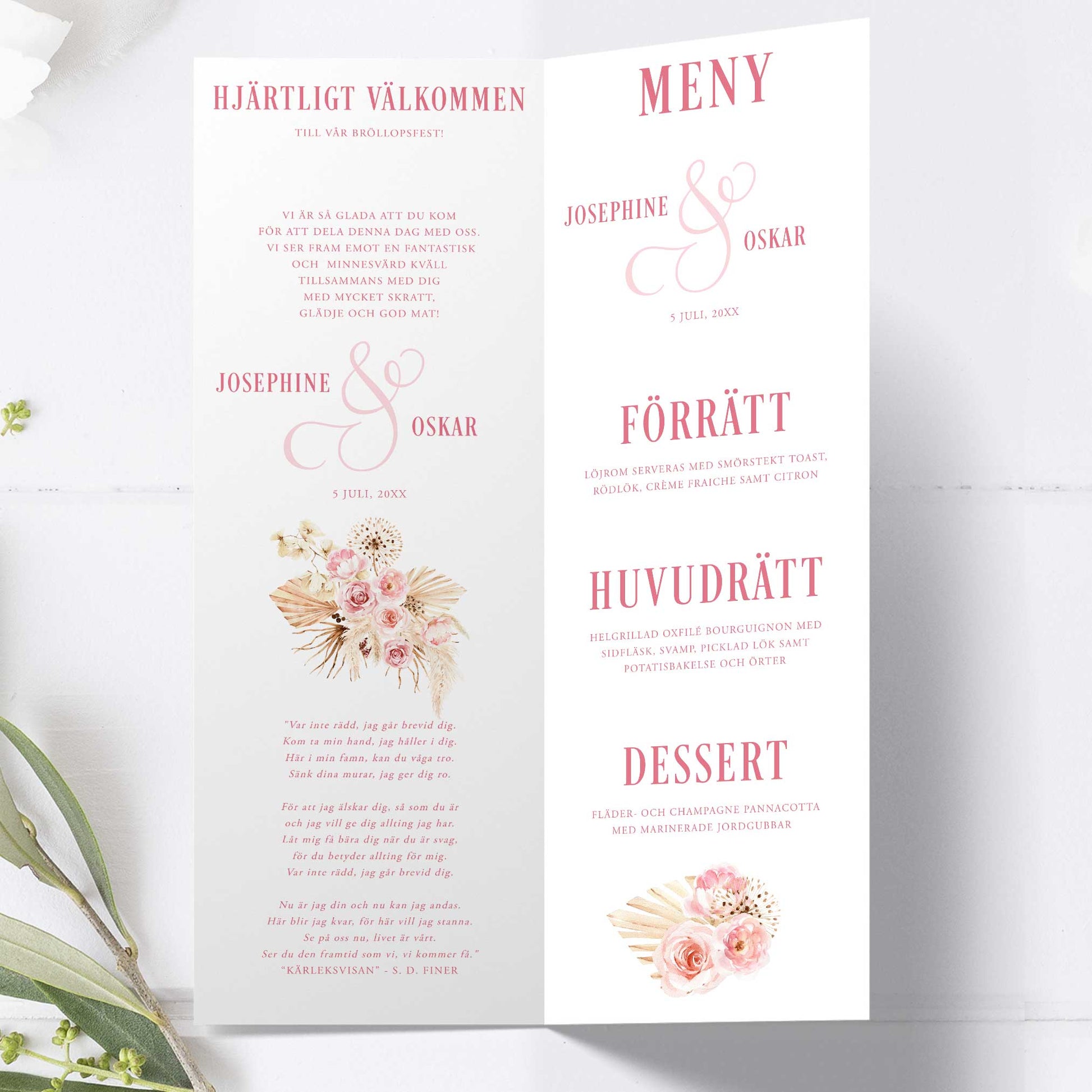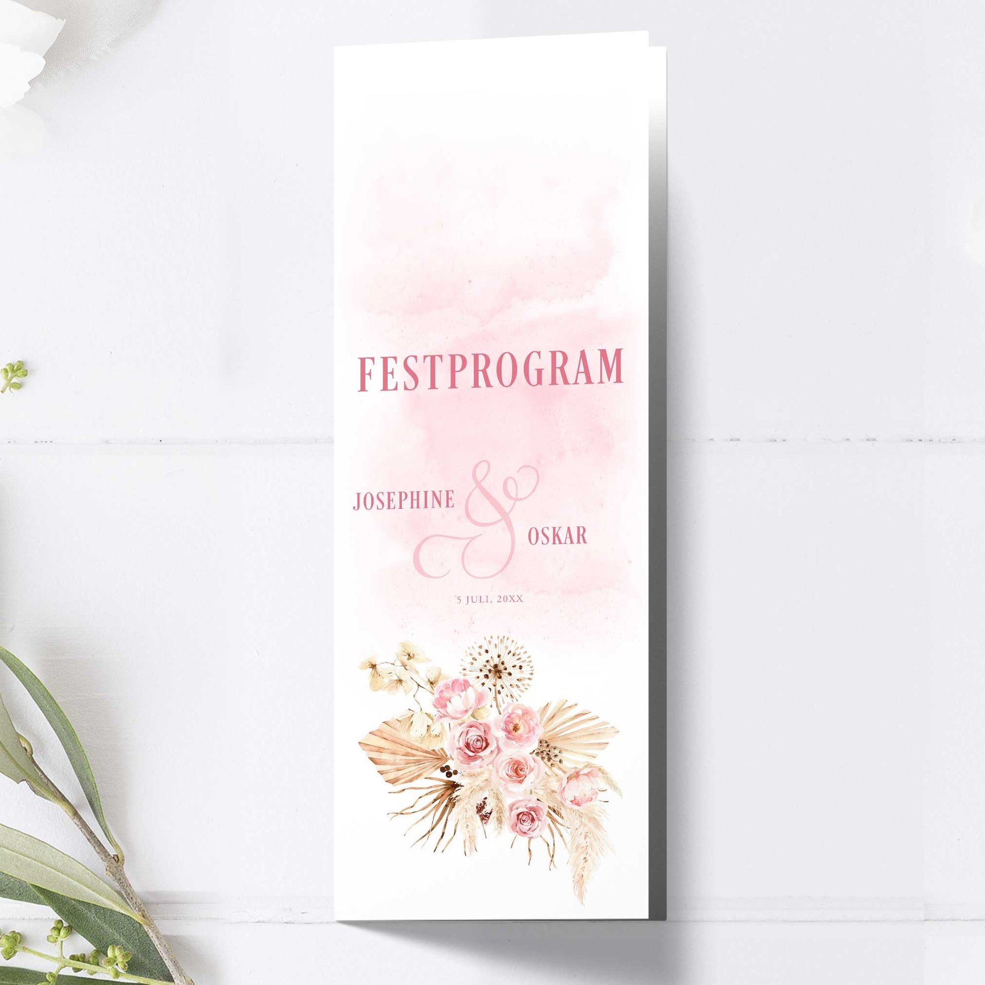 Festprogram till bröllop – Boho Rosa pampas – Avlångt tryckt programkort 10,5×29,7 cm BR011