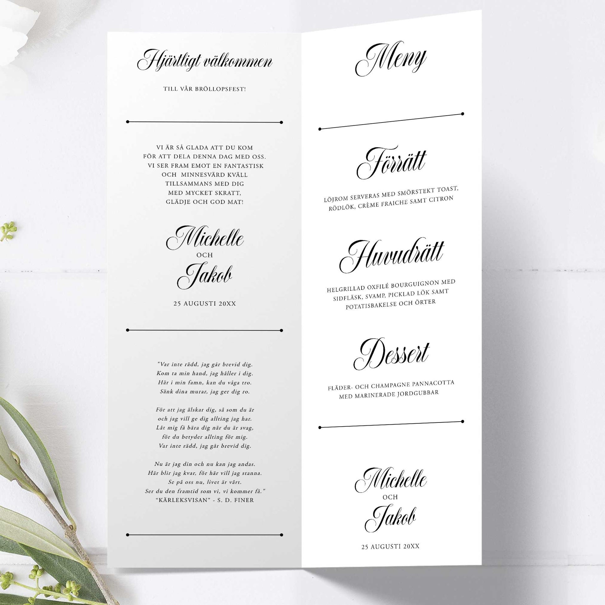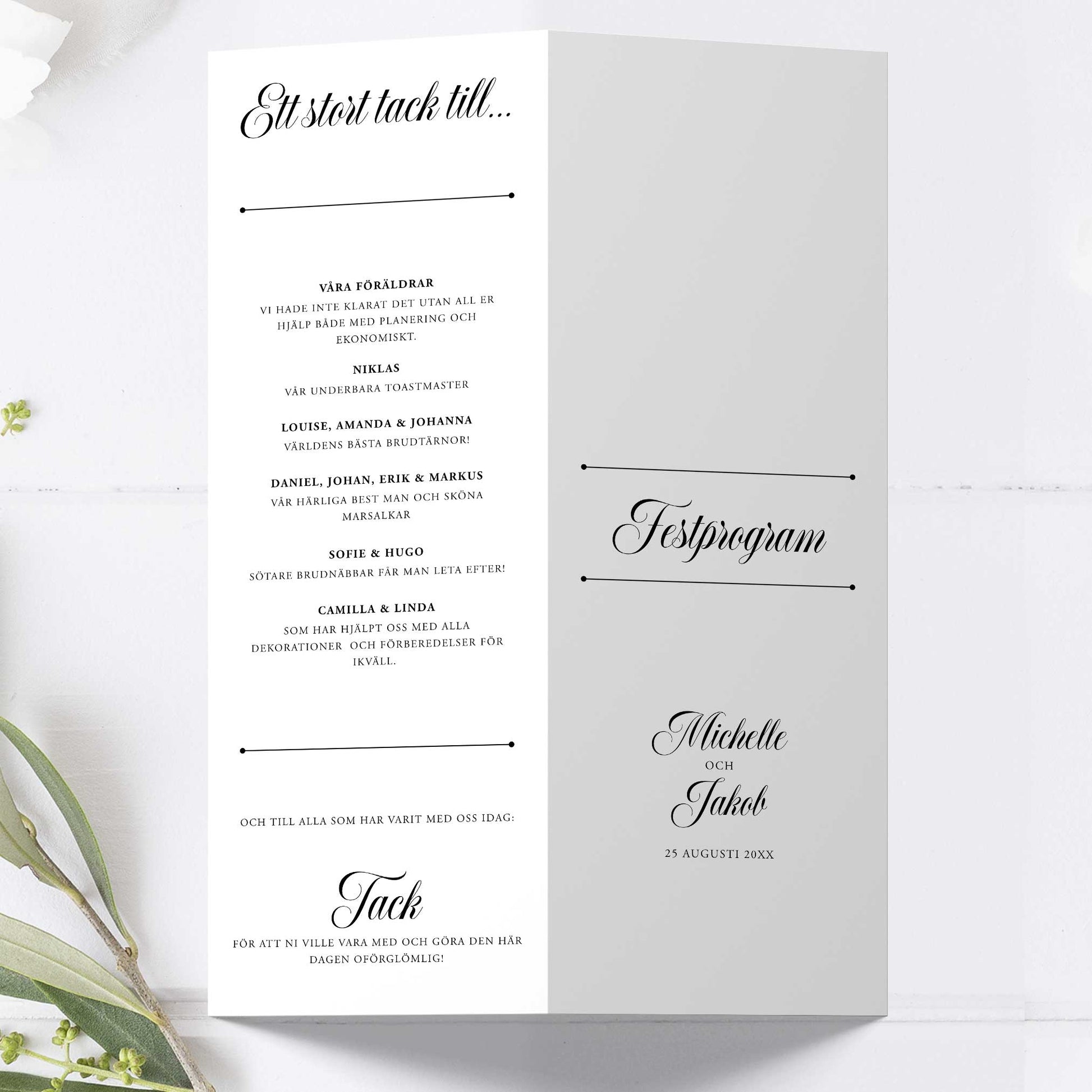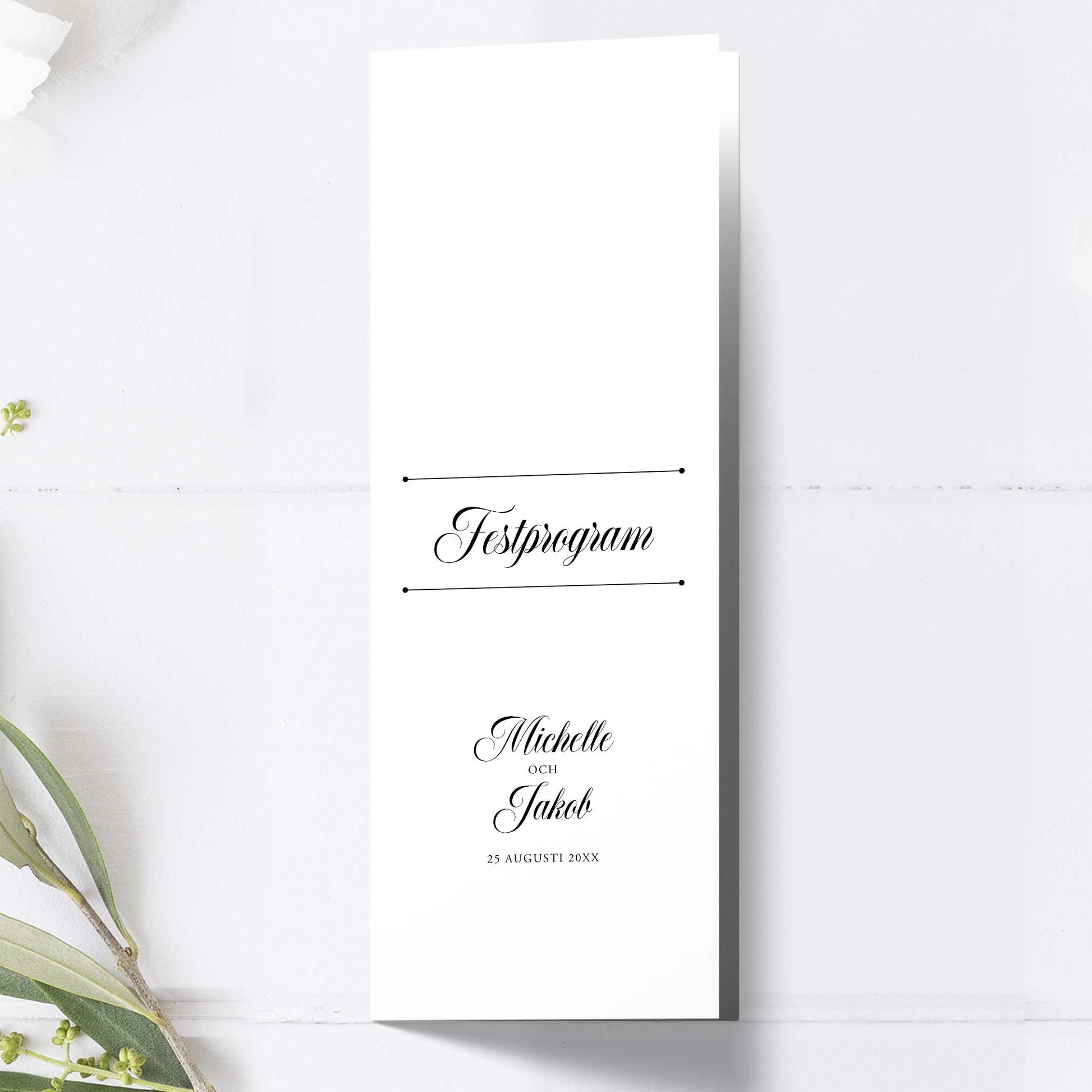 Festprogram till bröllop – Klassisk svartvit Formellt – Avlångt tryckt programkort 10,5×29,7 cm BR003