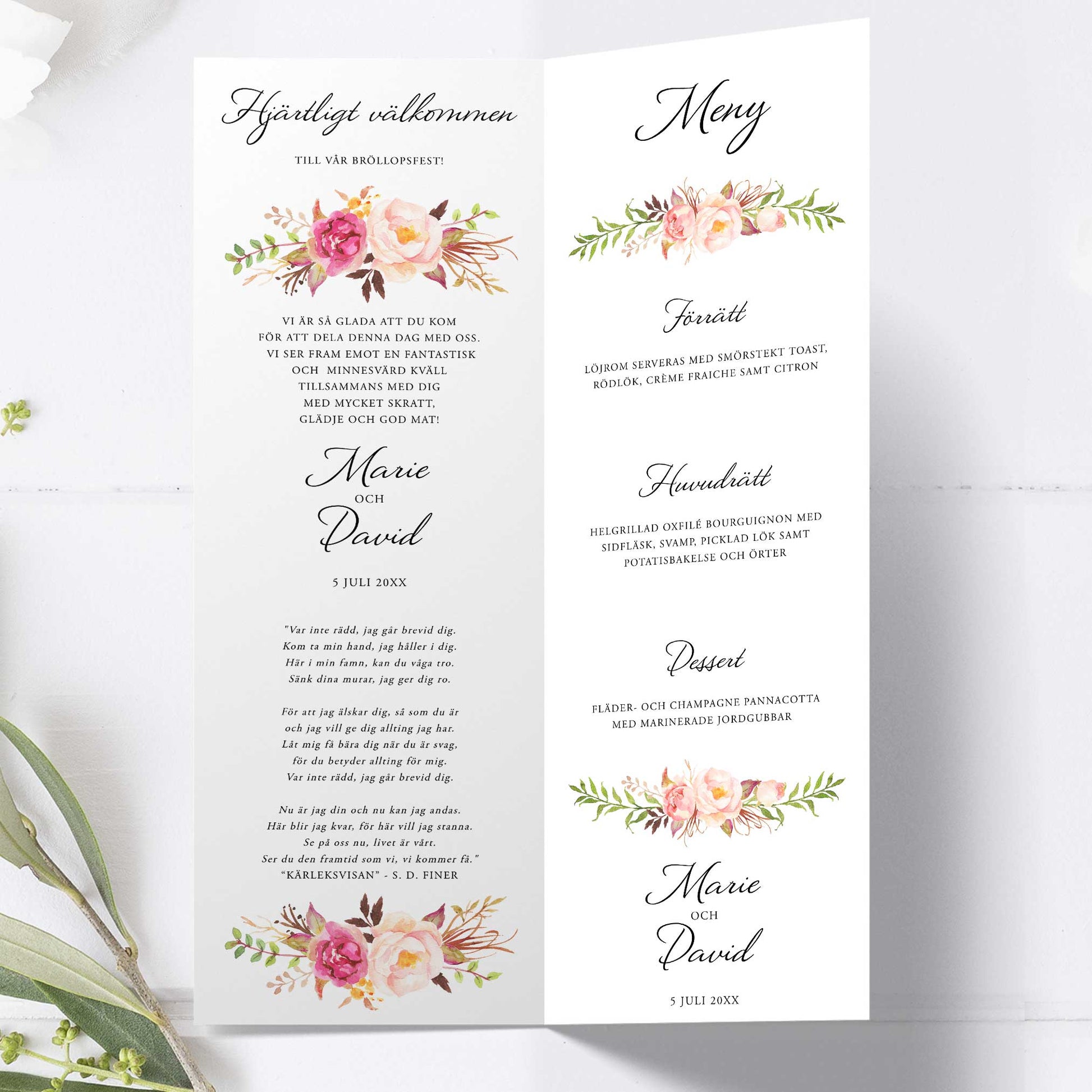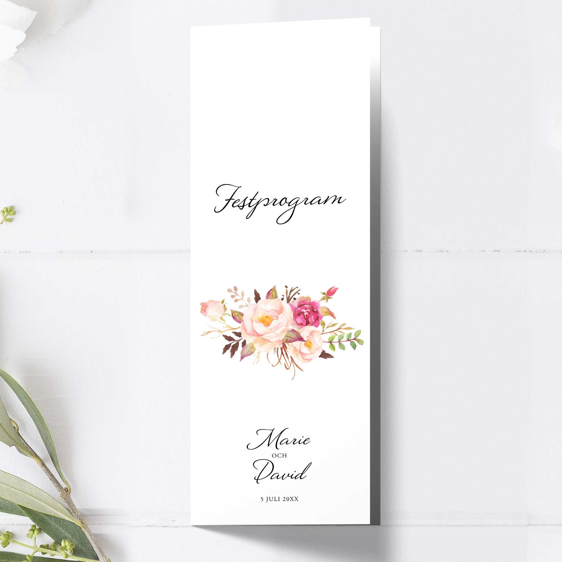 Festprogram till bröllop – Peach & Blush blommigt, somrigt – Avlångt tryckt programkort 10,5×29,7 cm BR006
