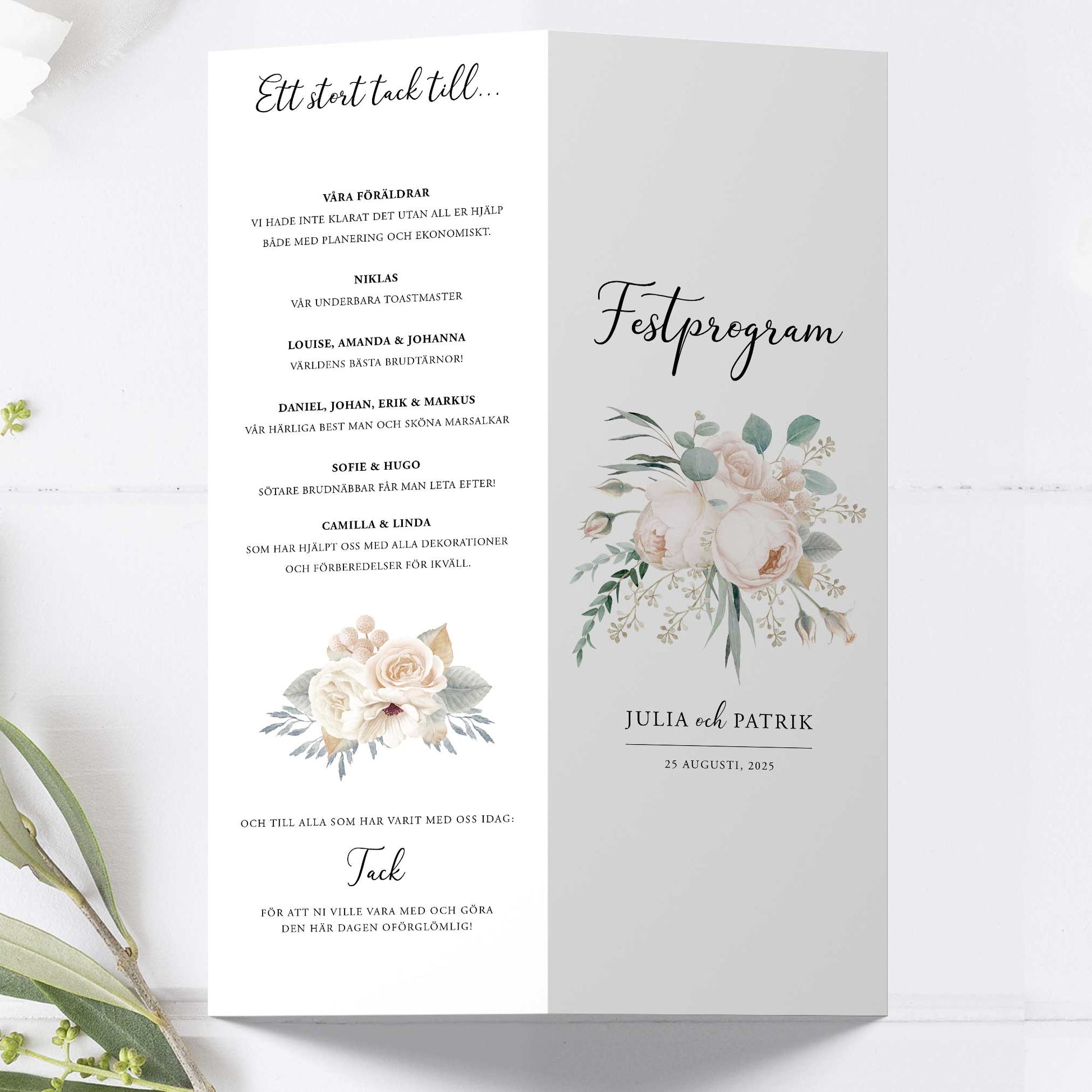 Festprogram till bröllop – Vintage Mr & Mrs Vita blommor – Avlångt tryckt programkort 10,5×29,7 cm BR001