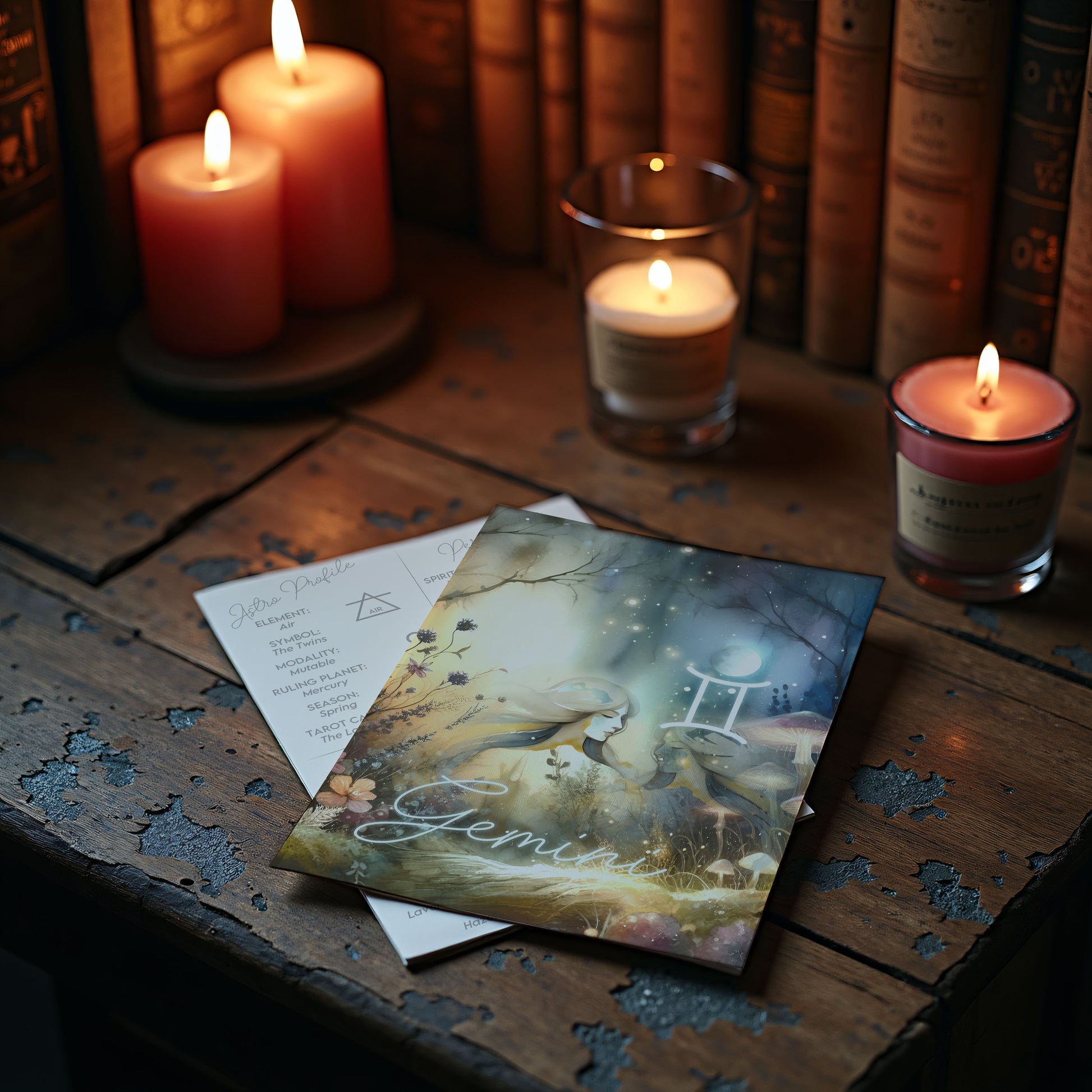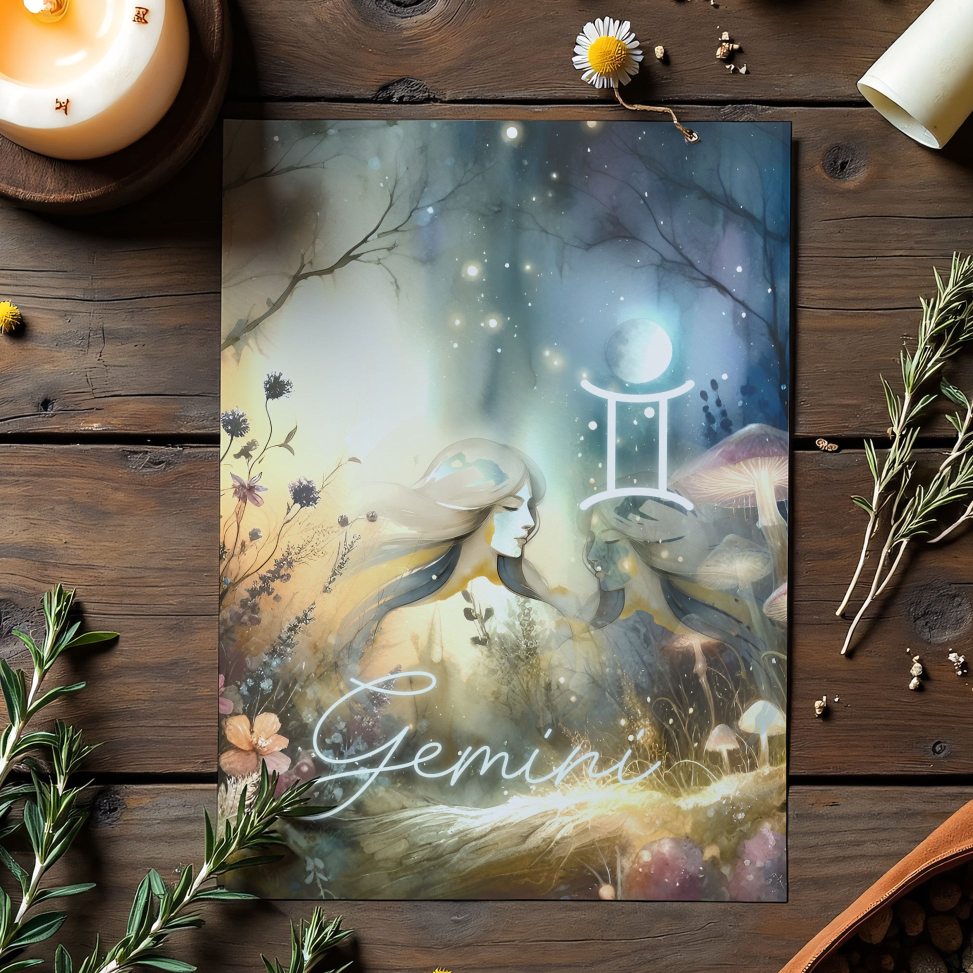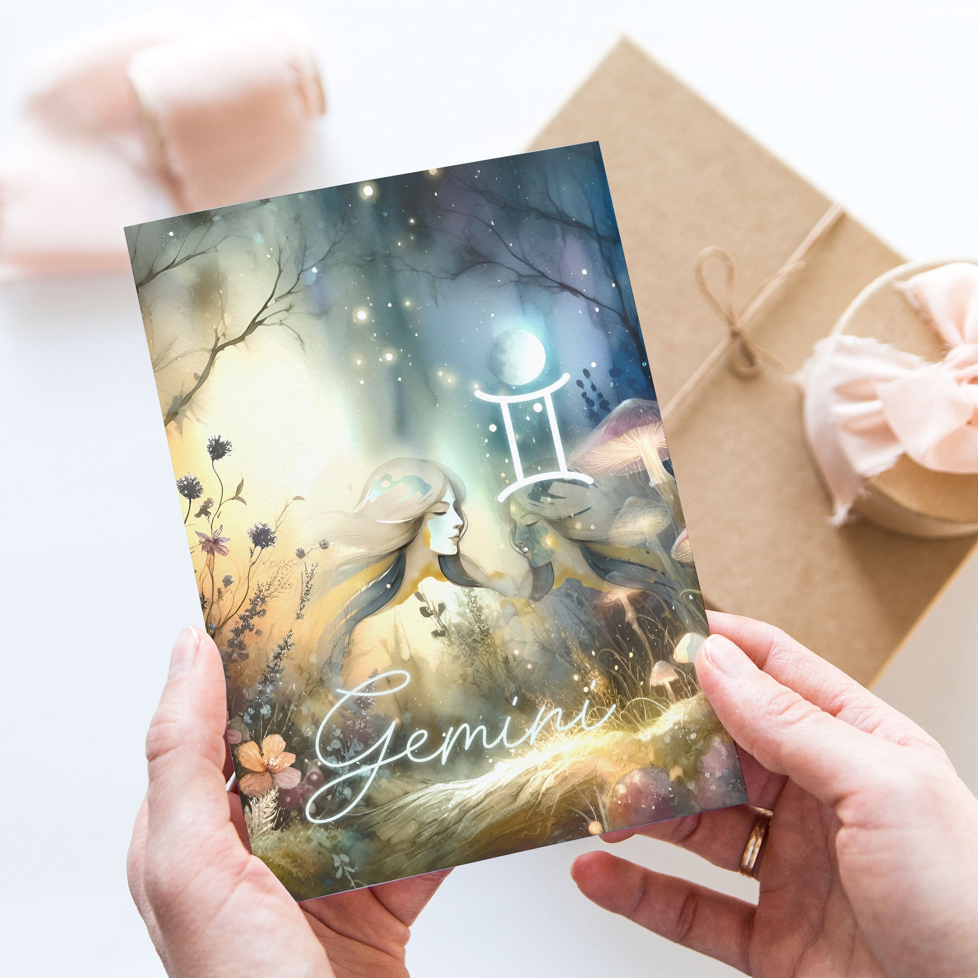 Tvillingarna – Stjärnteckenkort med stjärnbild & kristaller – Astrologiskt A6-kort för journaling eller gåva – ZC425