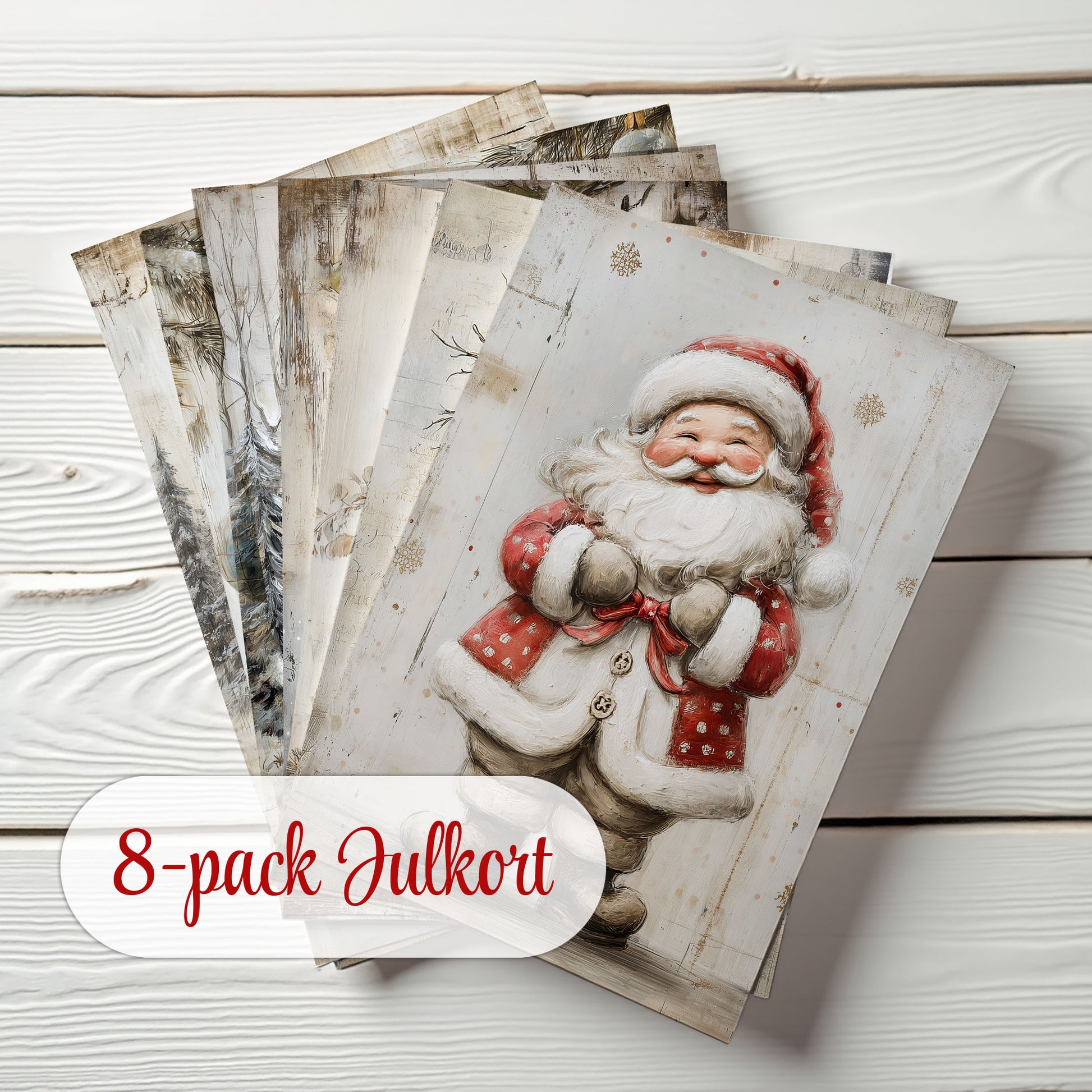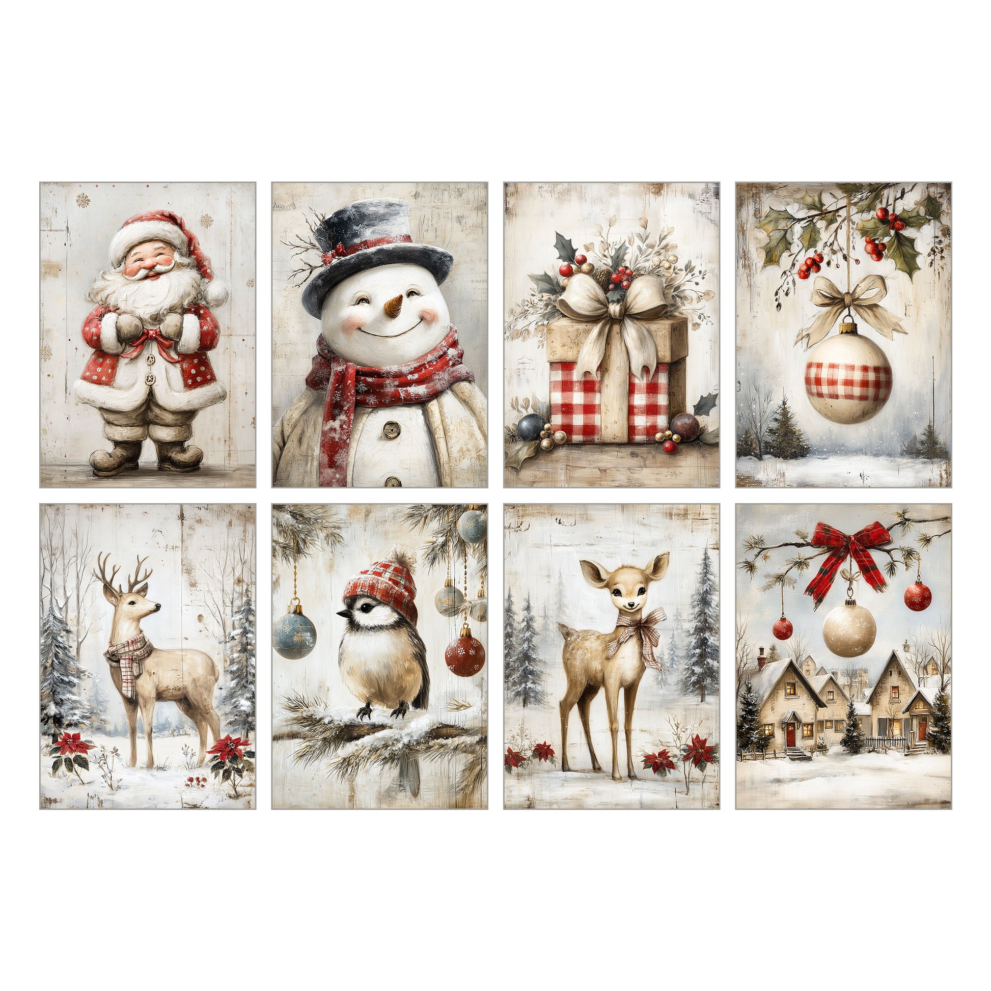 Skicka en personlig julhälsning med dessa söta julkort! Varje kort har unika djurmotiv i en modern vintagestil med vintriga toner i beige, rött och grönt. Perfekt att använda som vykort till jul 2025, eller som dekor i scrapbooking och junk journals.