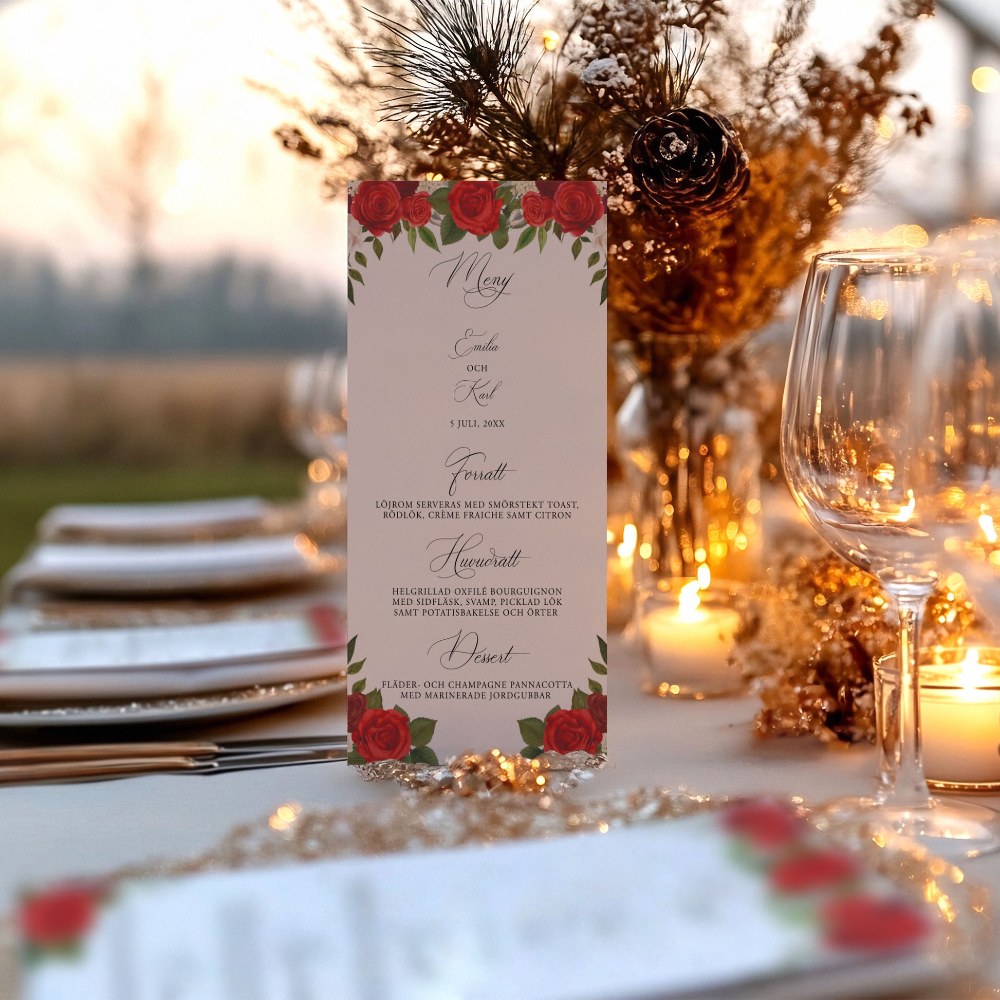 Menykort till bröllop – Röda rosor romantiskt – Tryckt kort för bröllopsmeny BR010