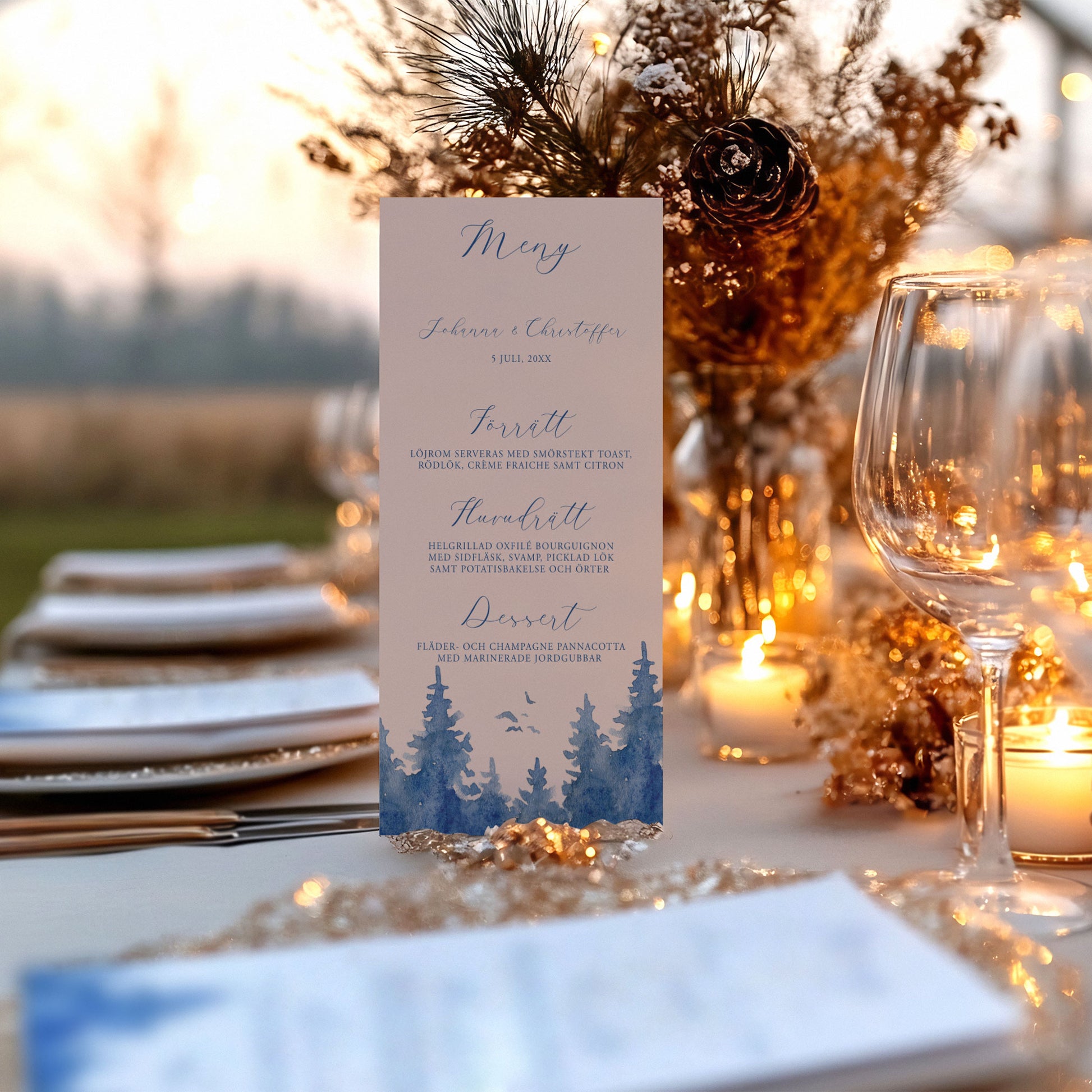 Menykort till bröllop – Vintrig Blått akvarell – Tryckt kort för bröllopsmeny BR008