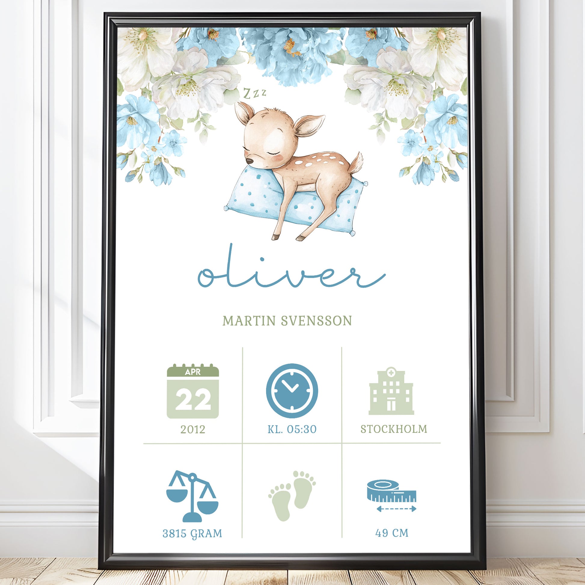 Personlig Doptavla Sovande Rådjur – Blå Födelsetavla & Doppresent | Tryckt Baby Poster i olika storlekar