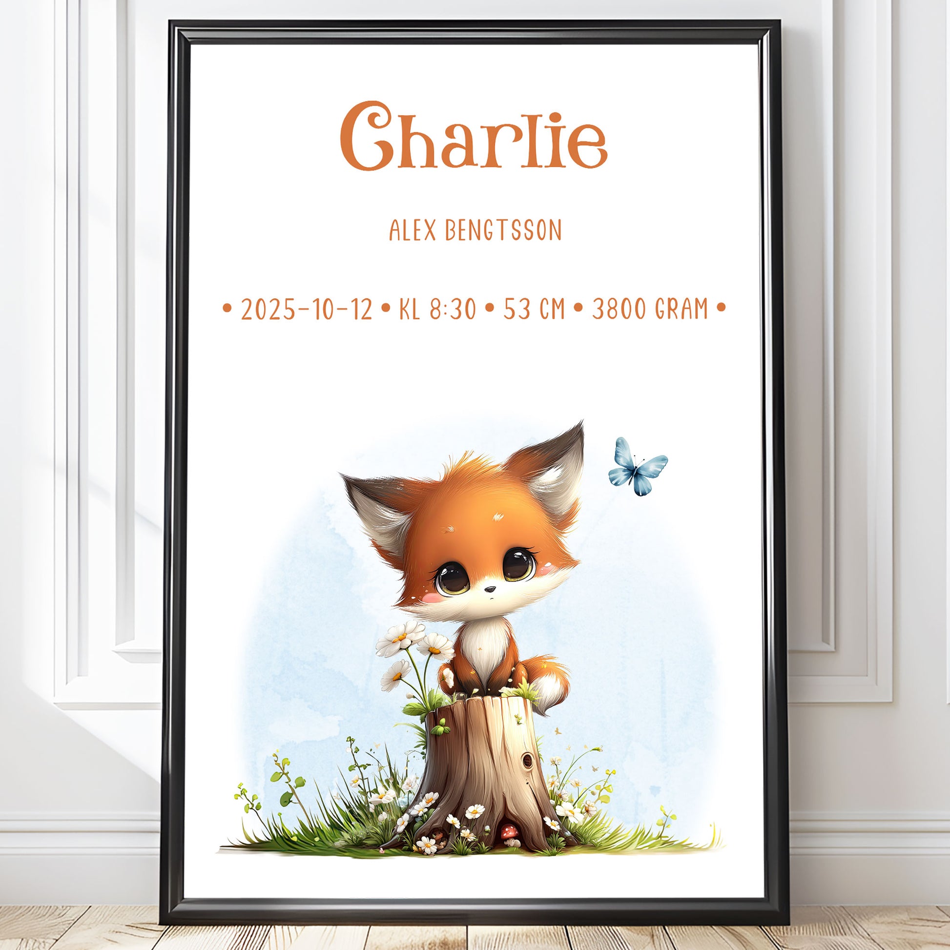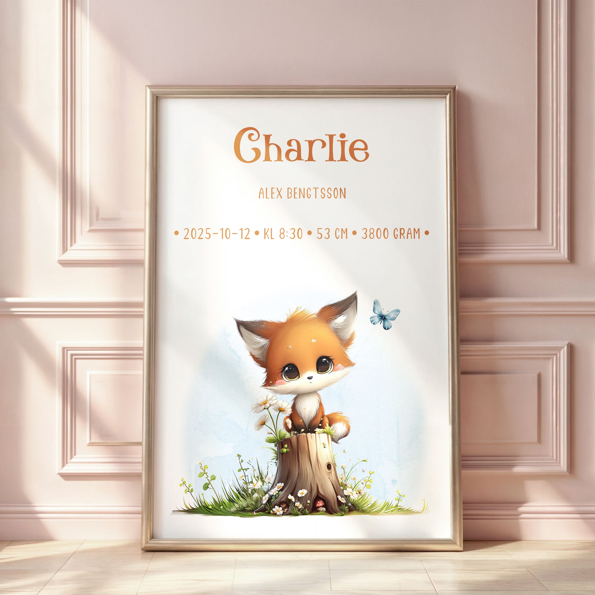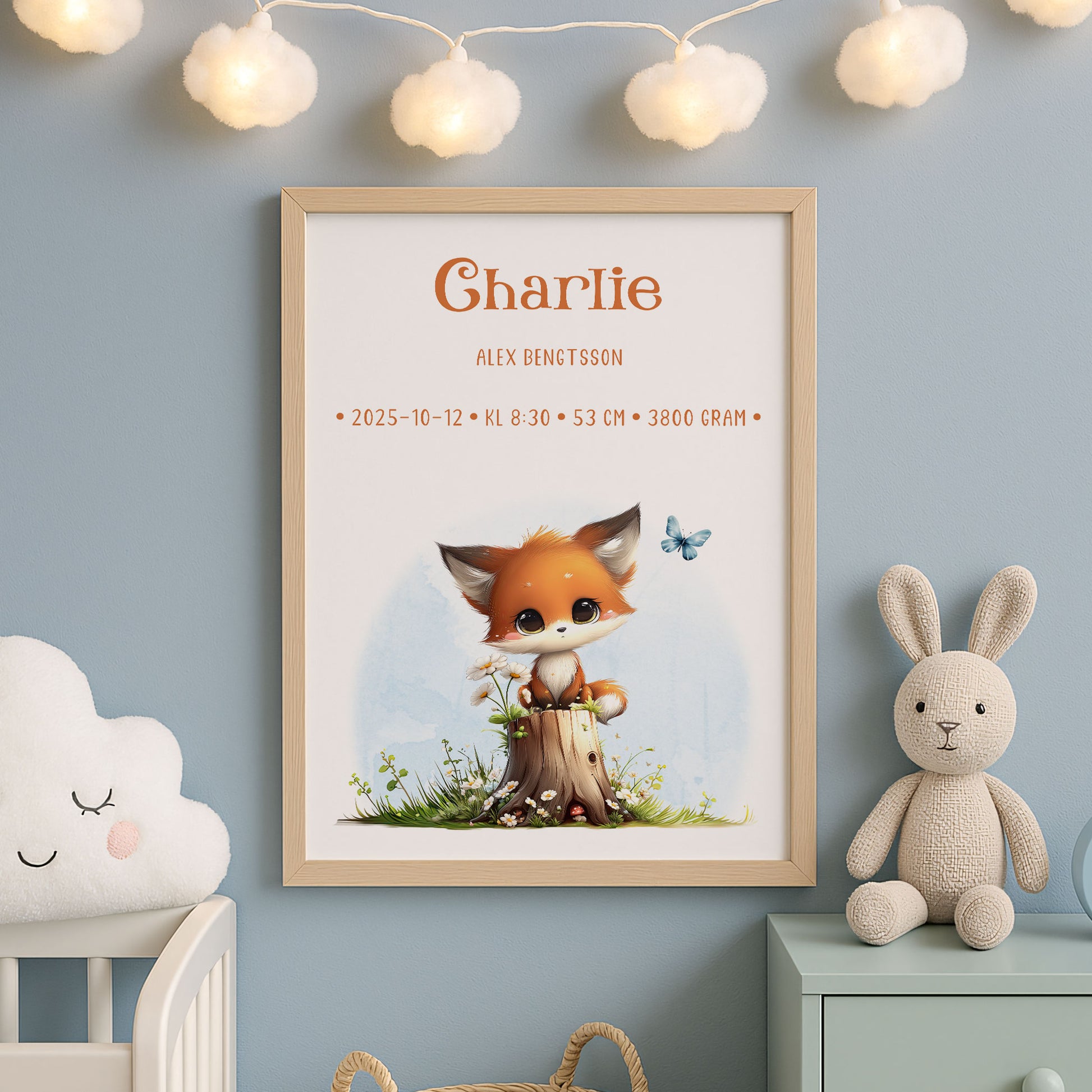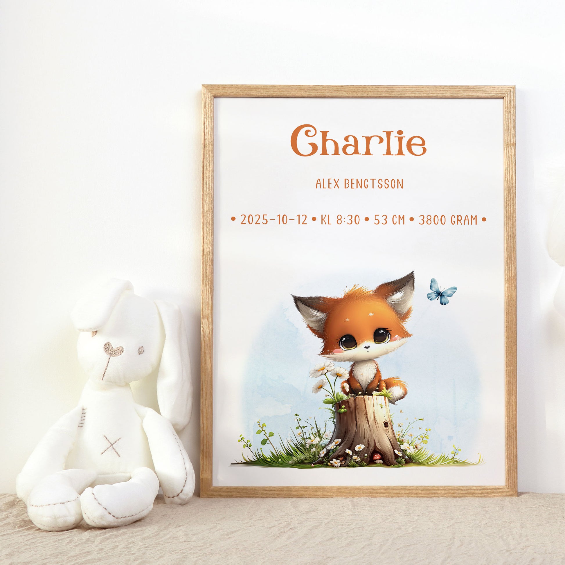 Personlig Doptavla Liten Räv – Könsneutral Födelsetavla & Doppresent | Tryckt Baby Poster i olika storlekar