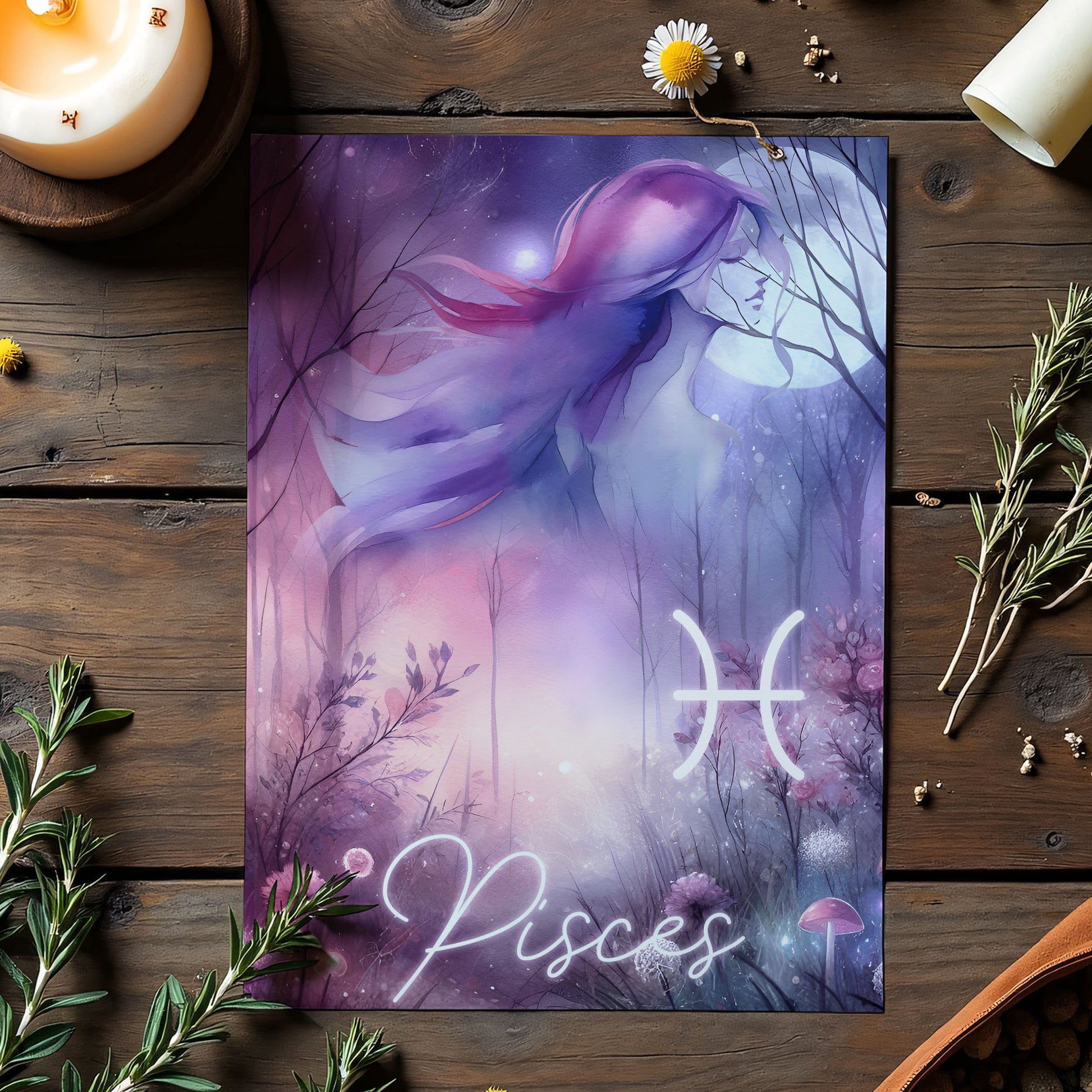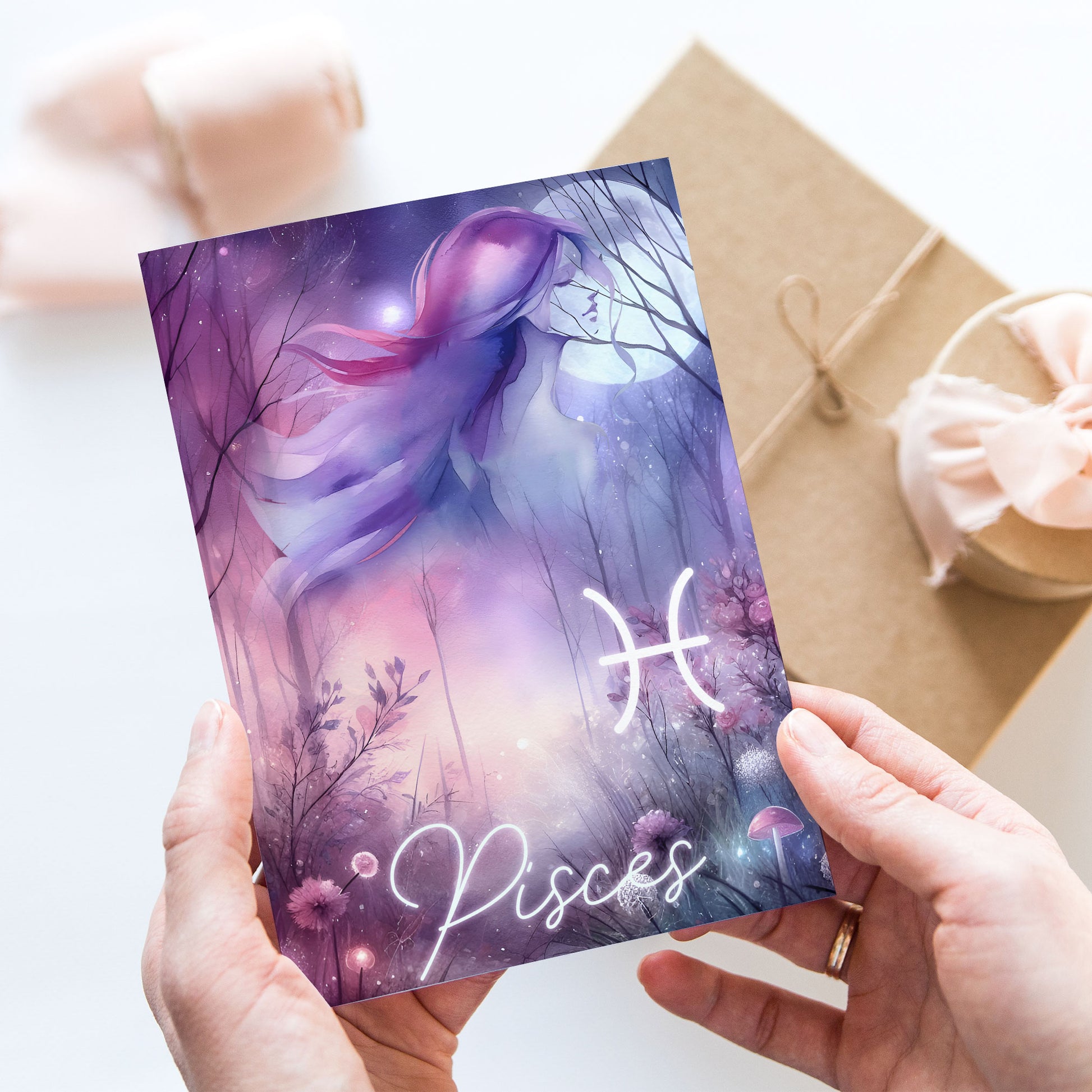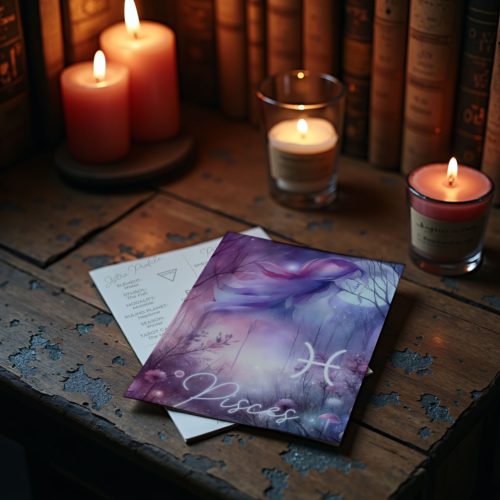 Fiskarna – Stjärnteckenkort med stjärnbild & kristaller – Astrologiskt A6-kort för journaling eller gåva – ZC428