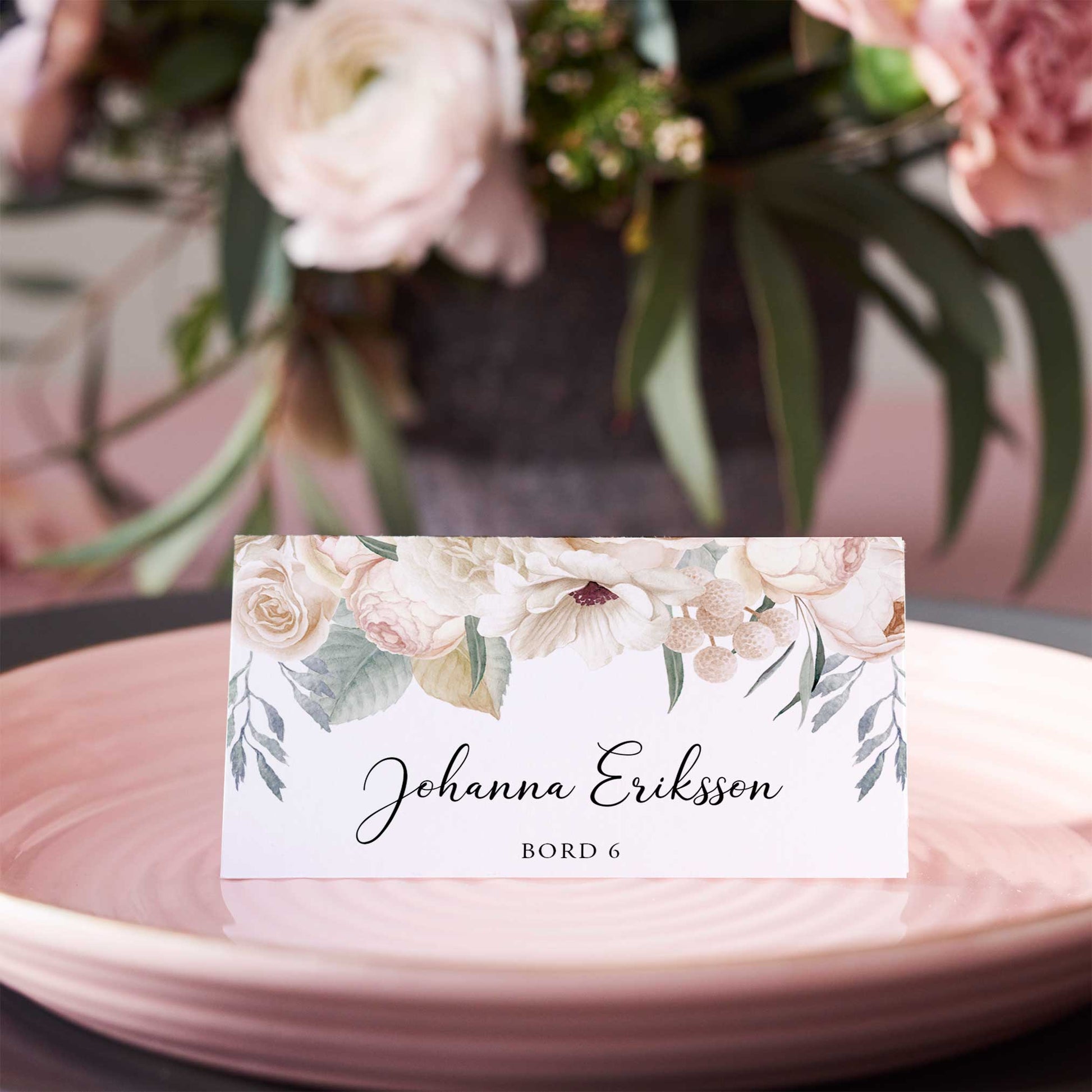 Vikta placeringskort till bröllop – White Floral Mr & Mrs – Tryckt kort med namn för dukning BR001