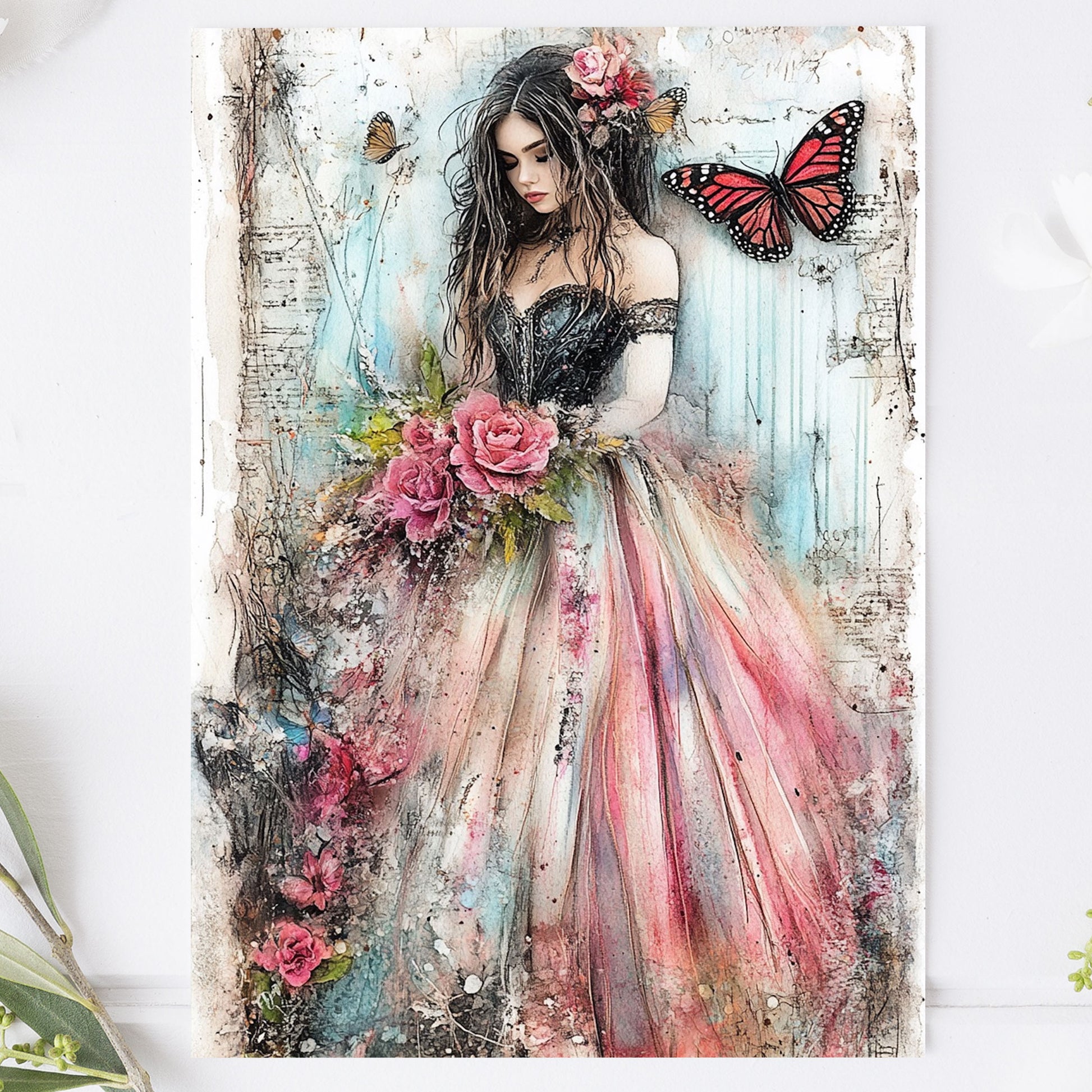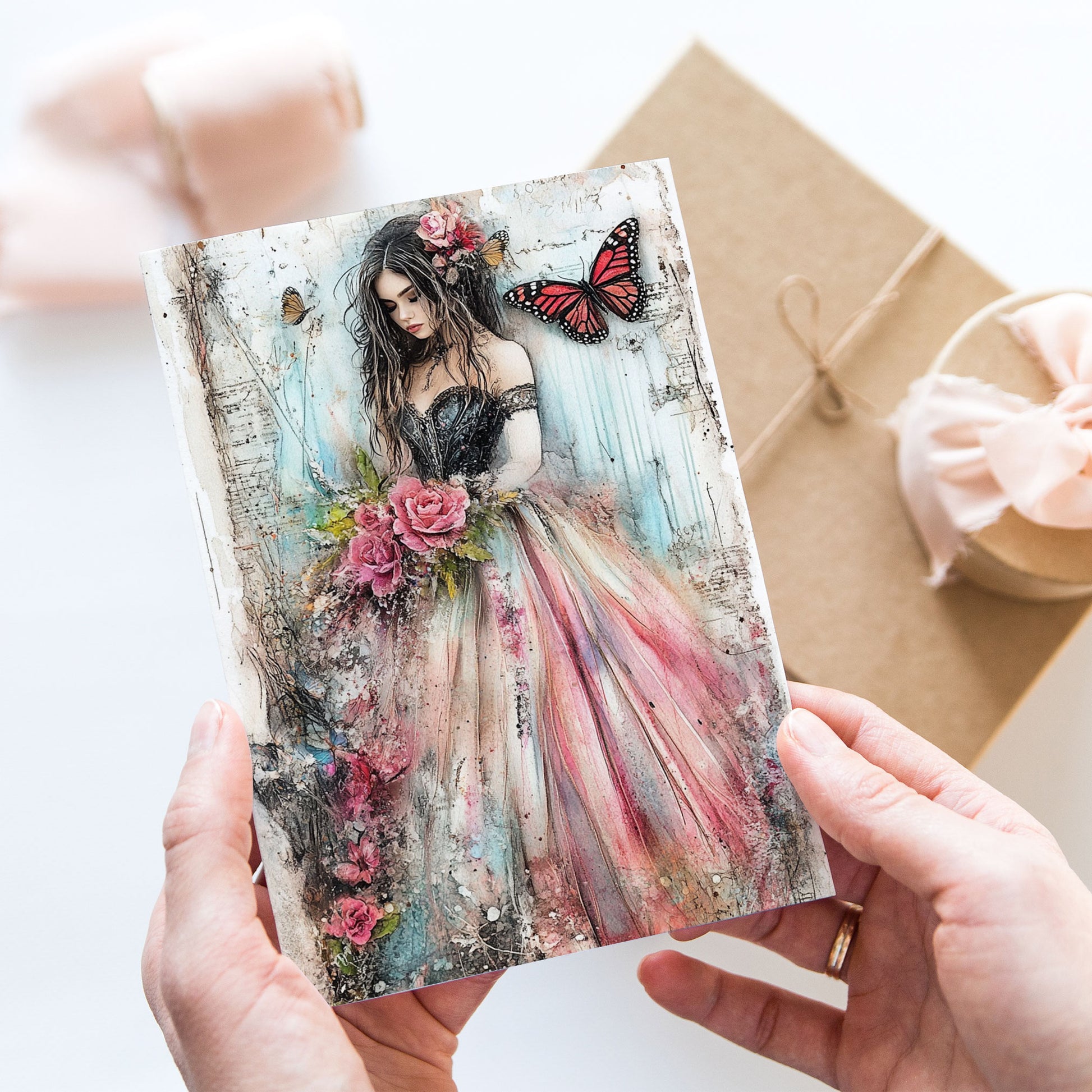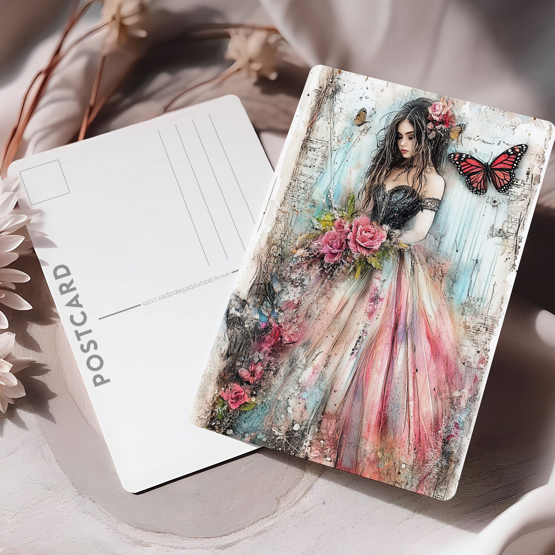 Vykort för postcrossing, scrapbooking & dekoration -Mörk Romantik - Rosor & Fjärilar PC603