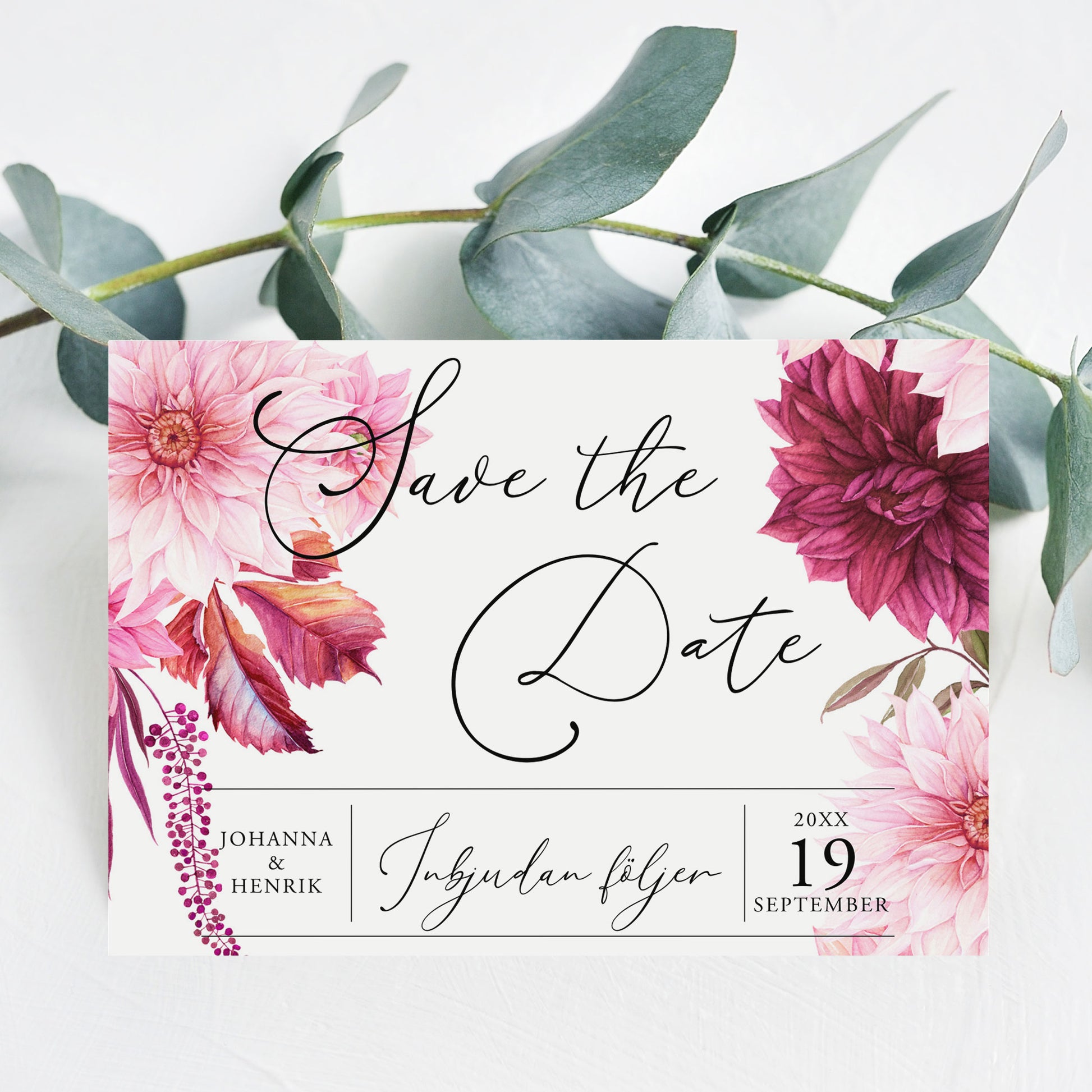 Save the Date-kort – Burgundy Dahlia - A6 Tryckt kort för bröllopsdatum BR002
