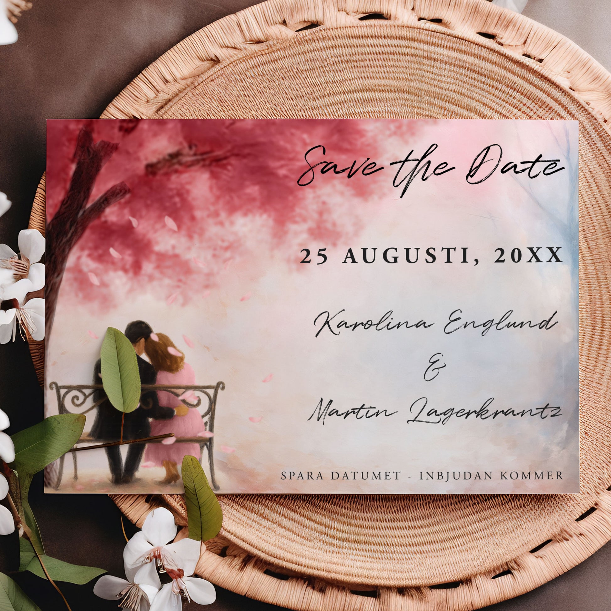 Save the Date-kort – Rosa körsbärsblommor & kärlekspar - A6 Tryckt kort för bröllopsdatum BR015