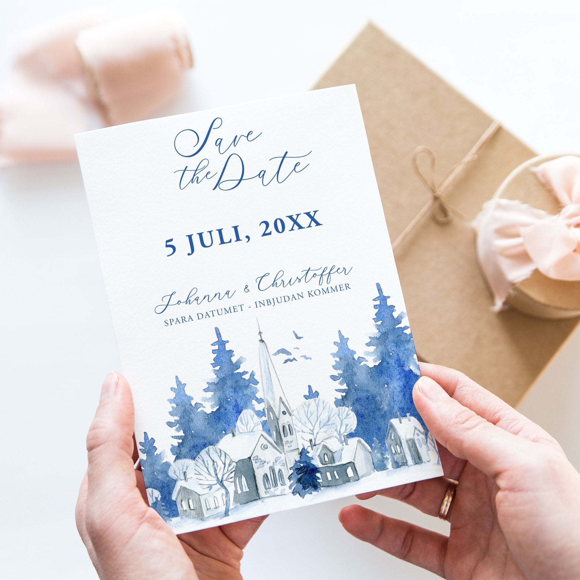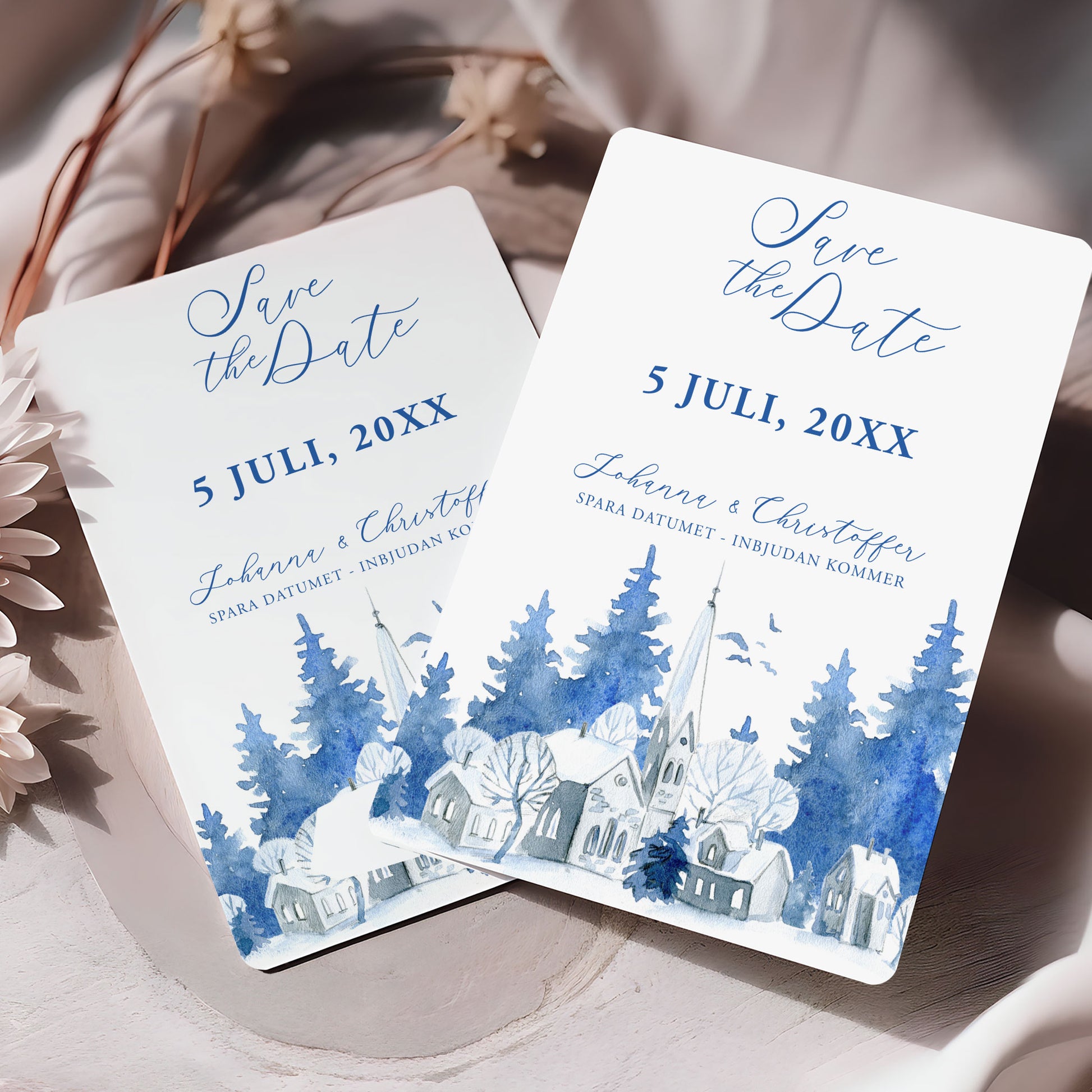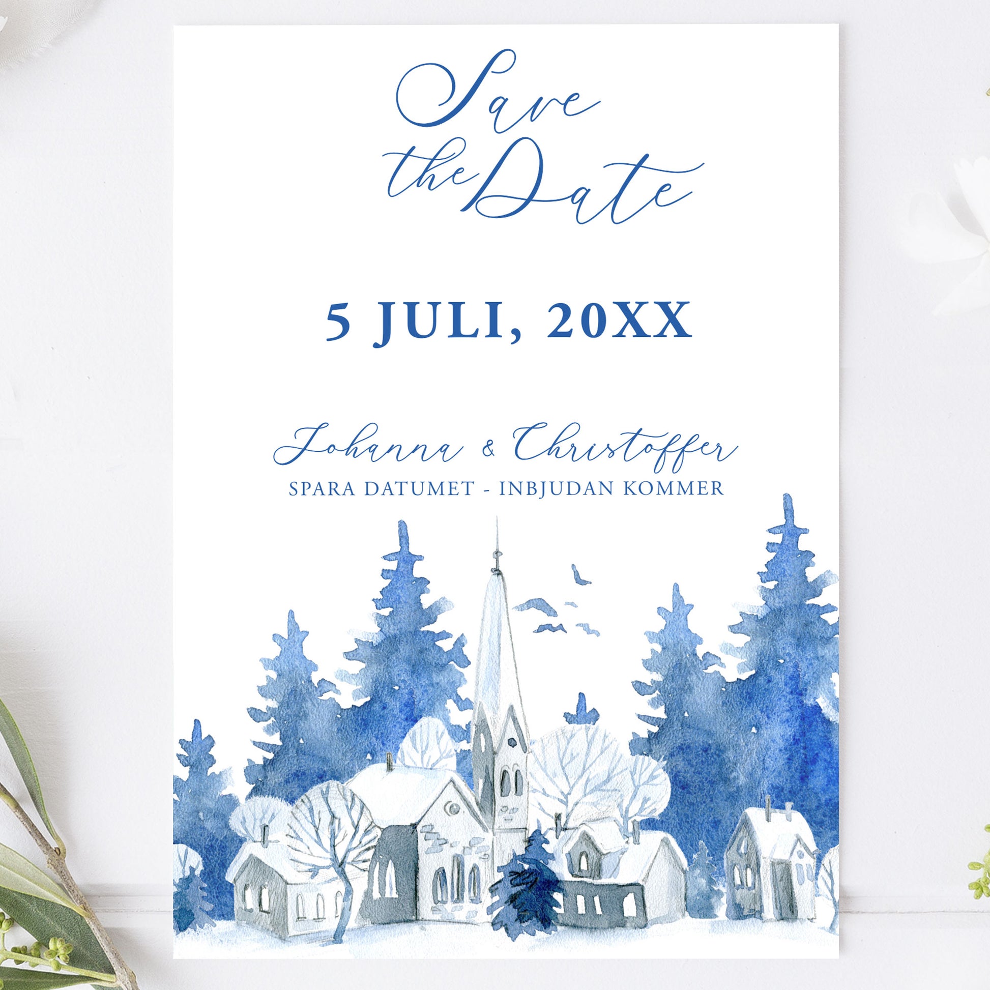 Save the Date-kort – Vintrig Blått akvarell - A6 Tryckt kort för bröllopsdatum BR008