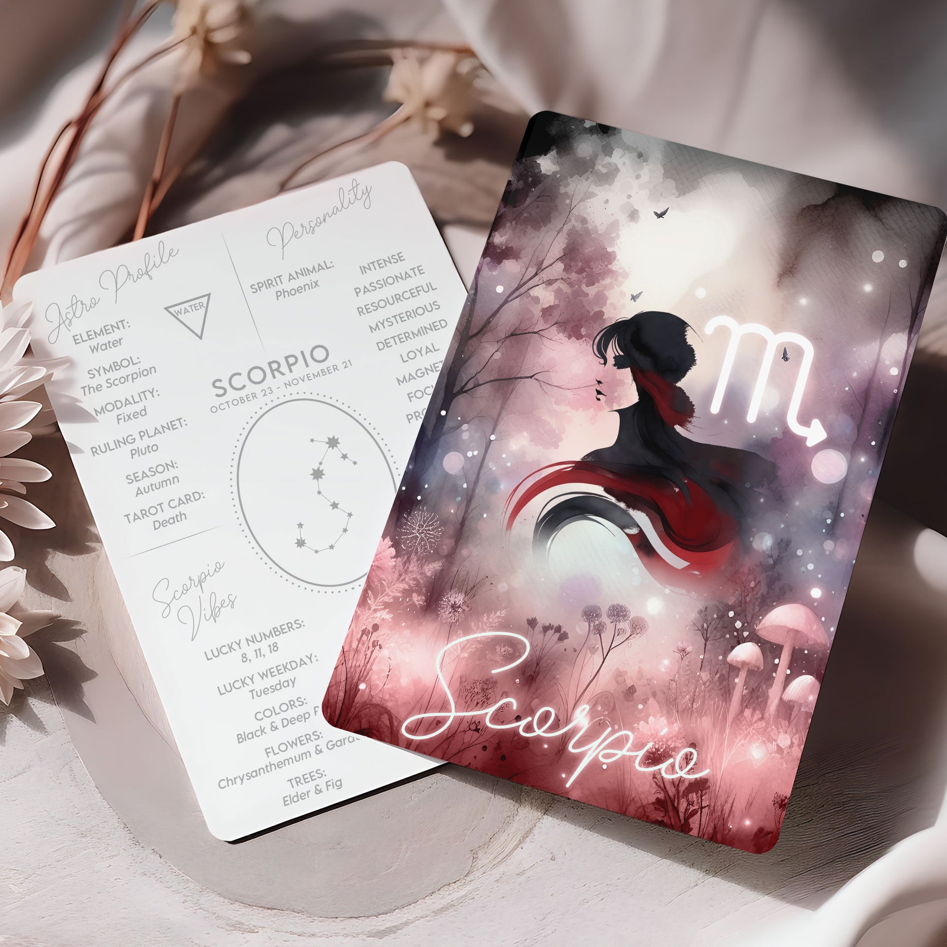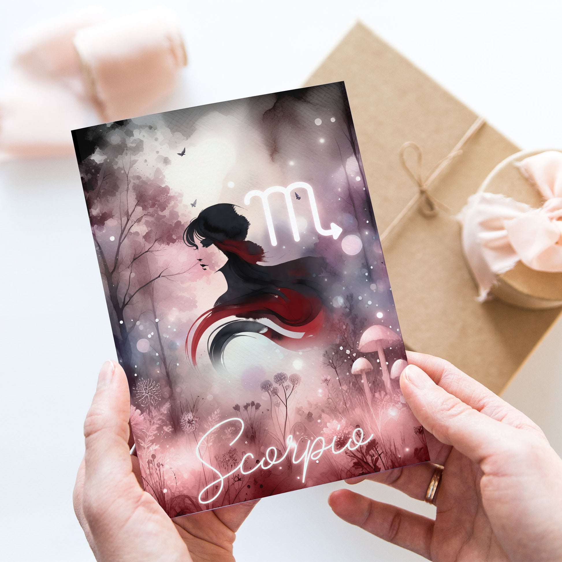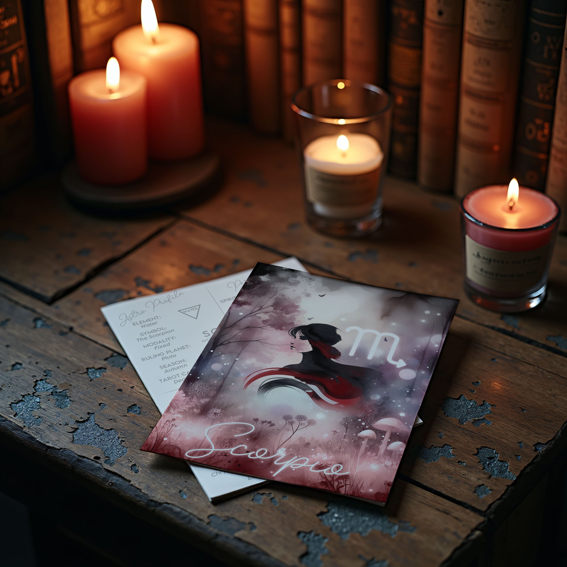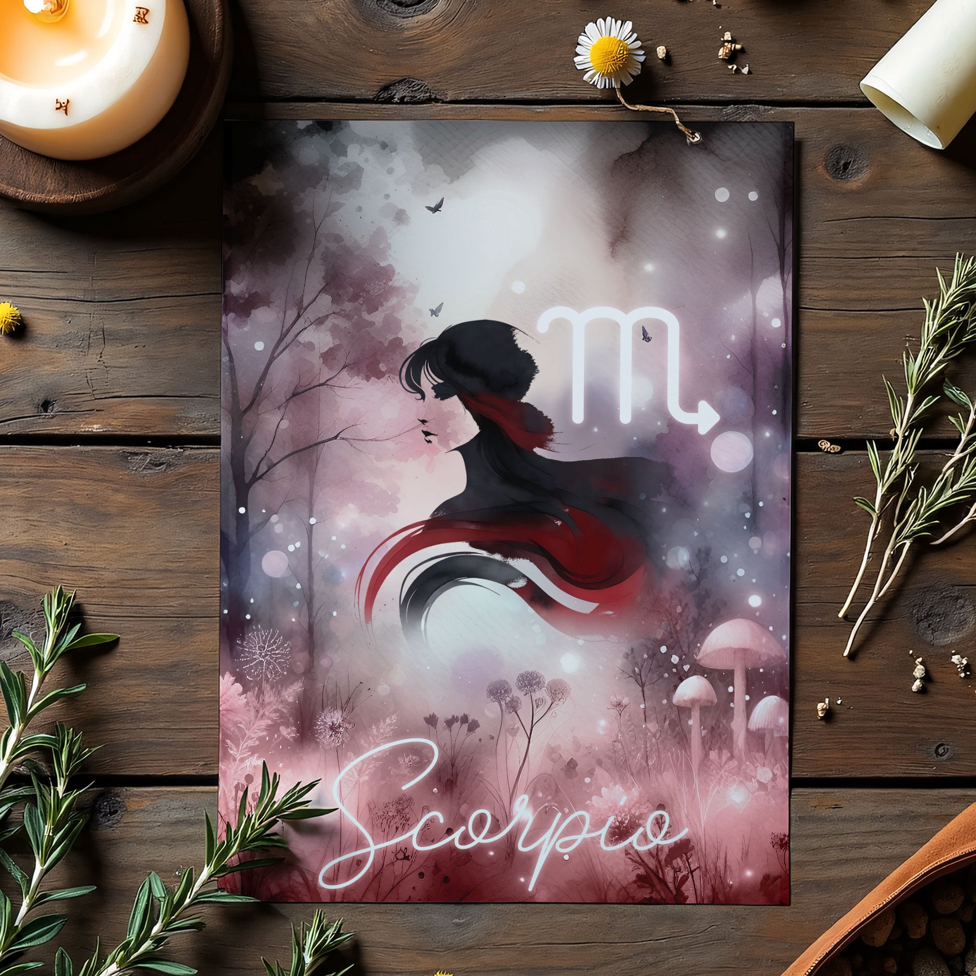 Skorpionen – Stjärnteckenkort med stjärnbild & kristaller – Astrologiskt A6-kort för journaling eller gåva – ZC430