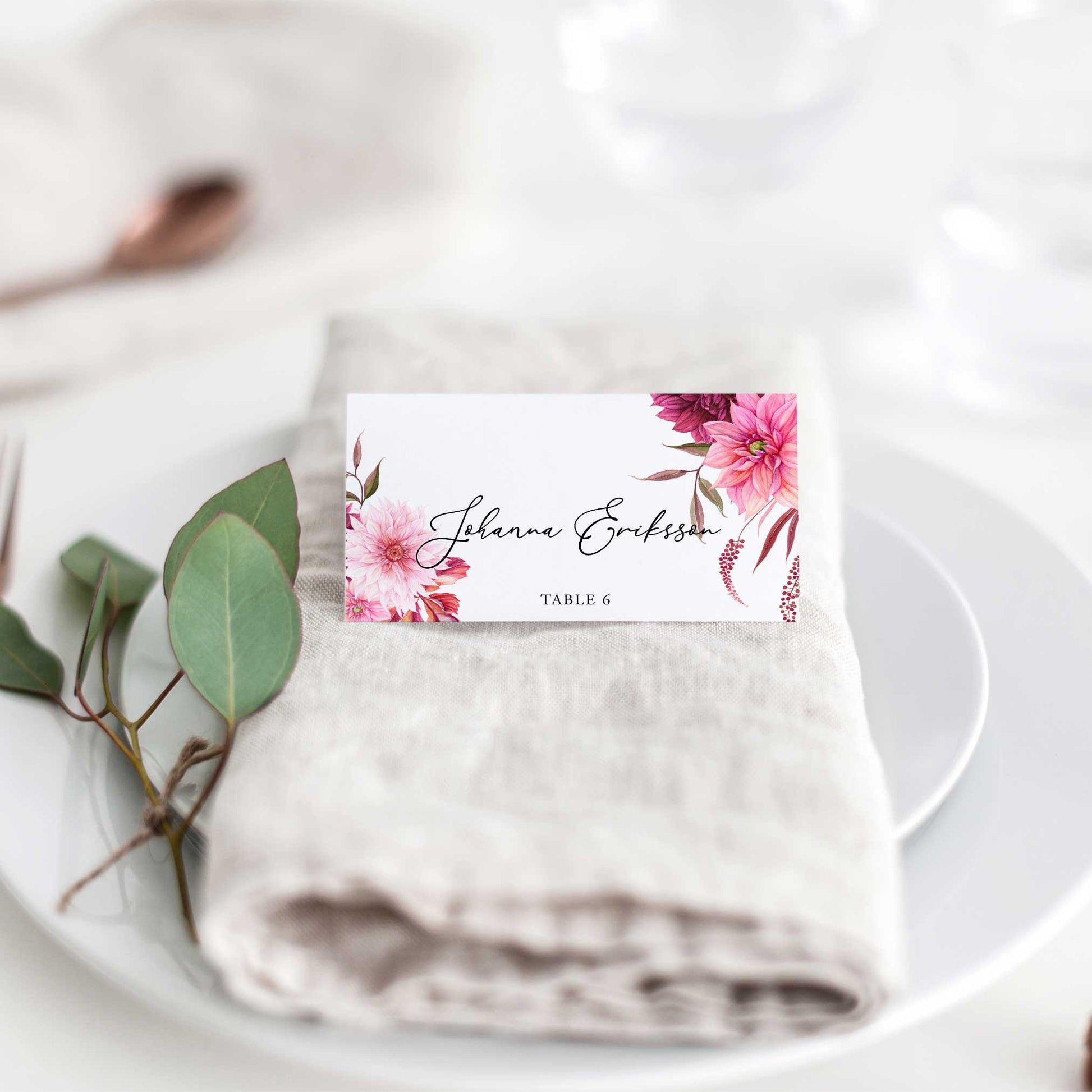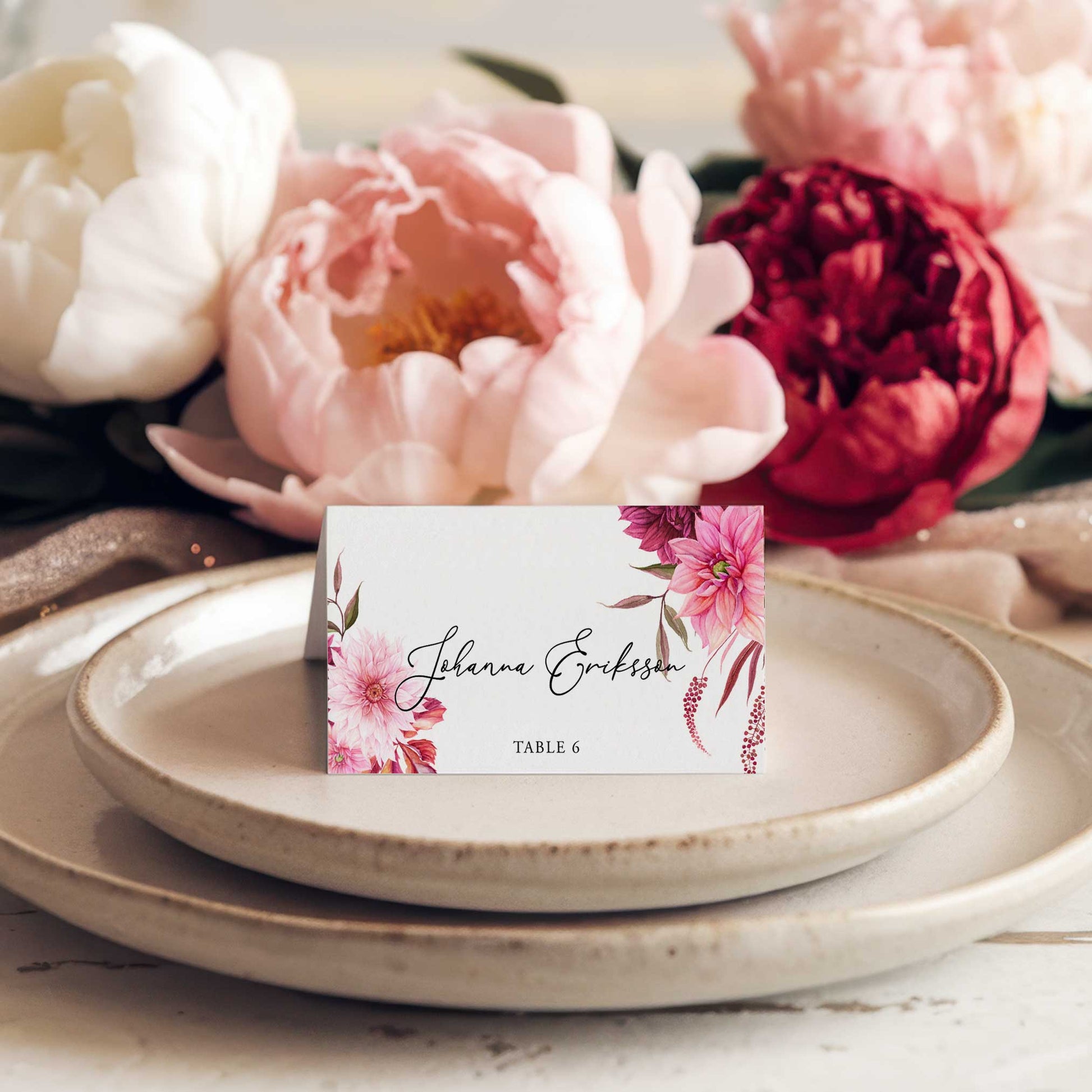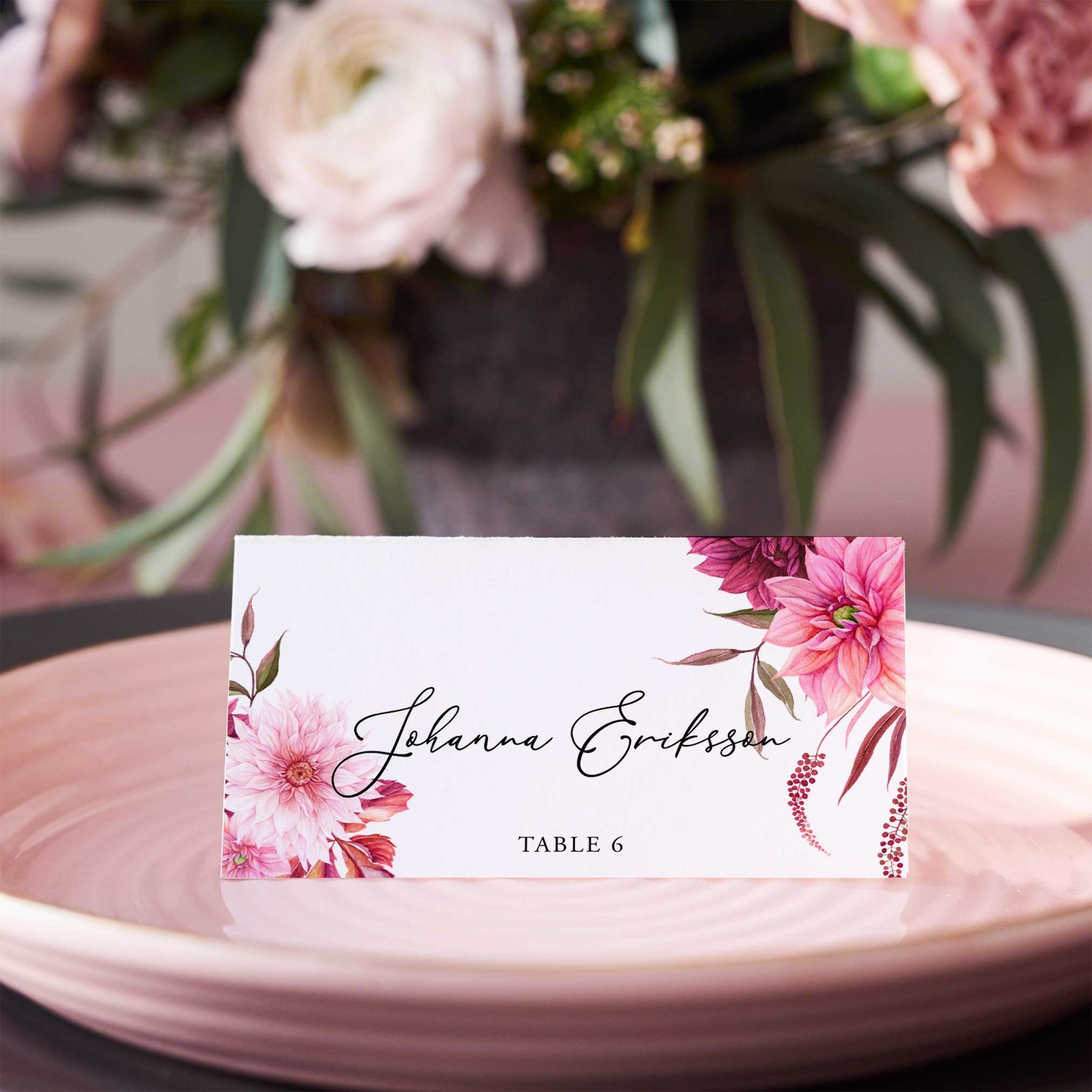 Vikta placeringskort till bröllop – Burgundy Dahlia – Tryckt kort med namn för dukning BR002