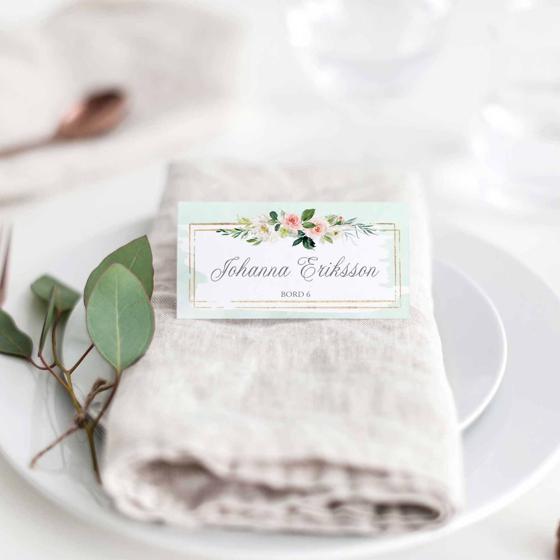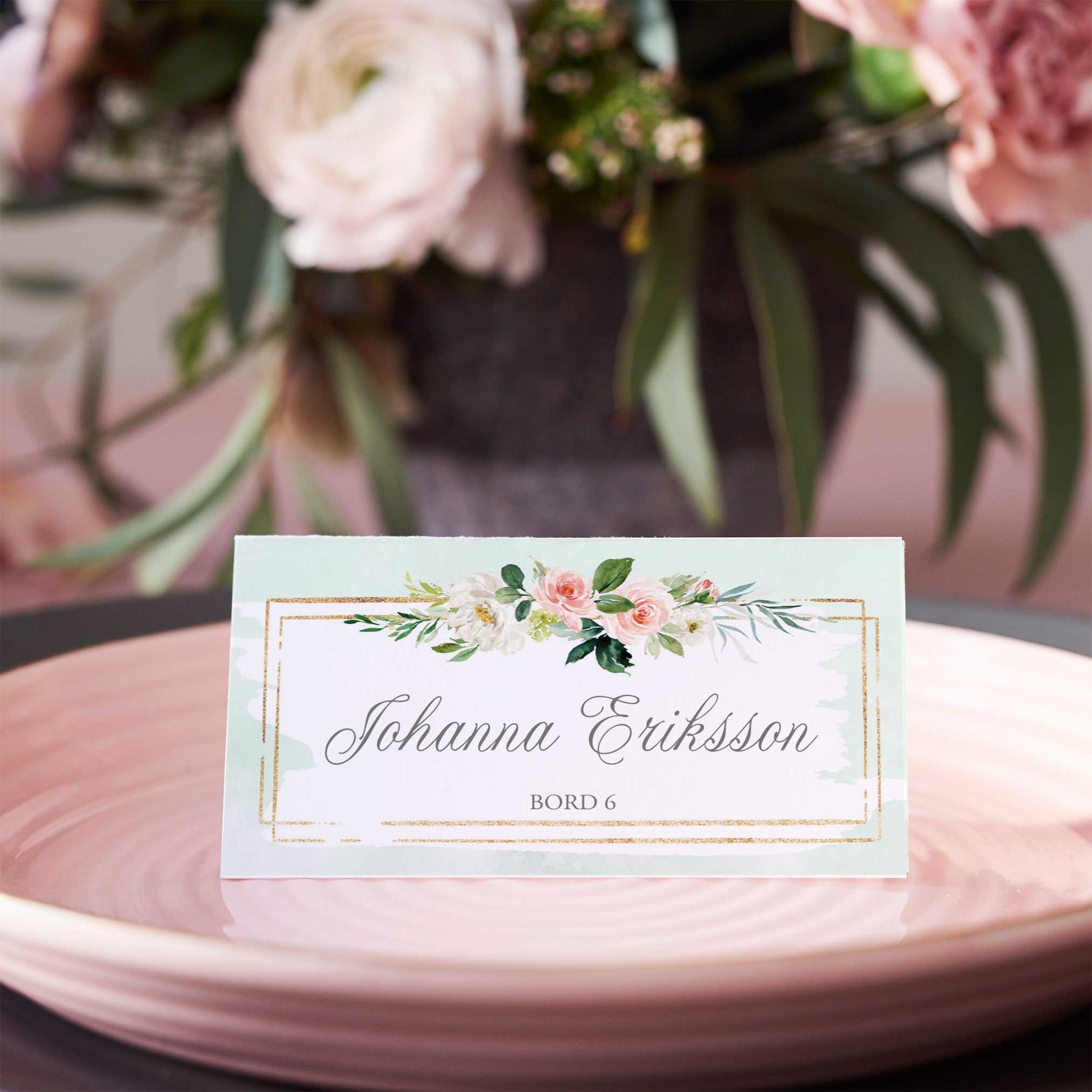 Vikta placeringskort till bröllop – Mint & Guld Rosa, blommig, somrig design – Tryckt kort med namn för dukning BR009