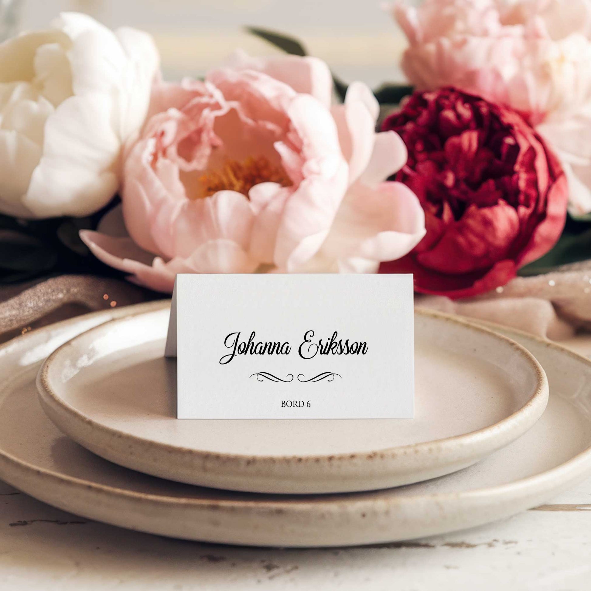 Vikta placeringskort till bröllop – Modern script stil svartvitt – Tryckt kort med namn för dukning BR004