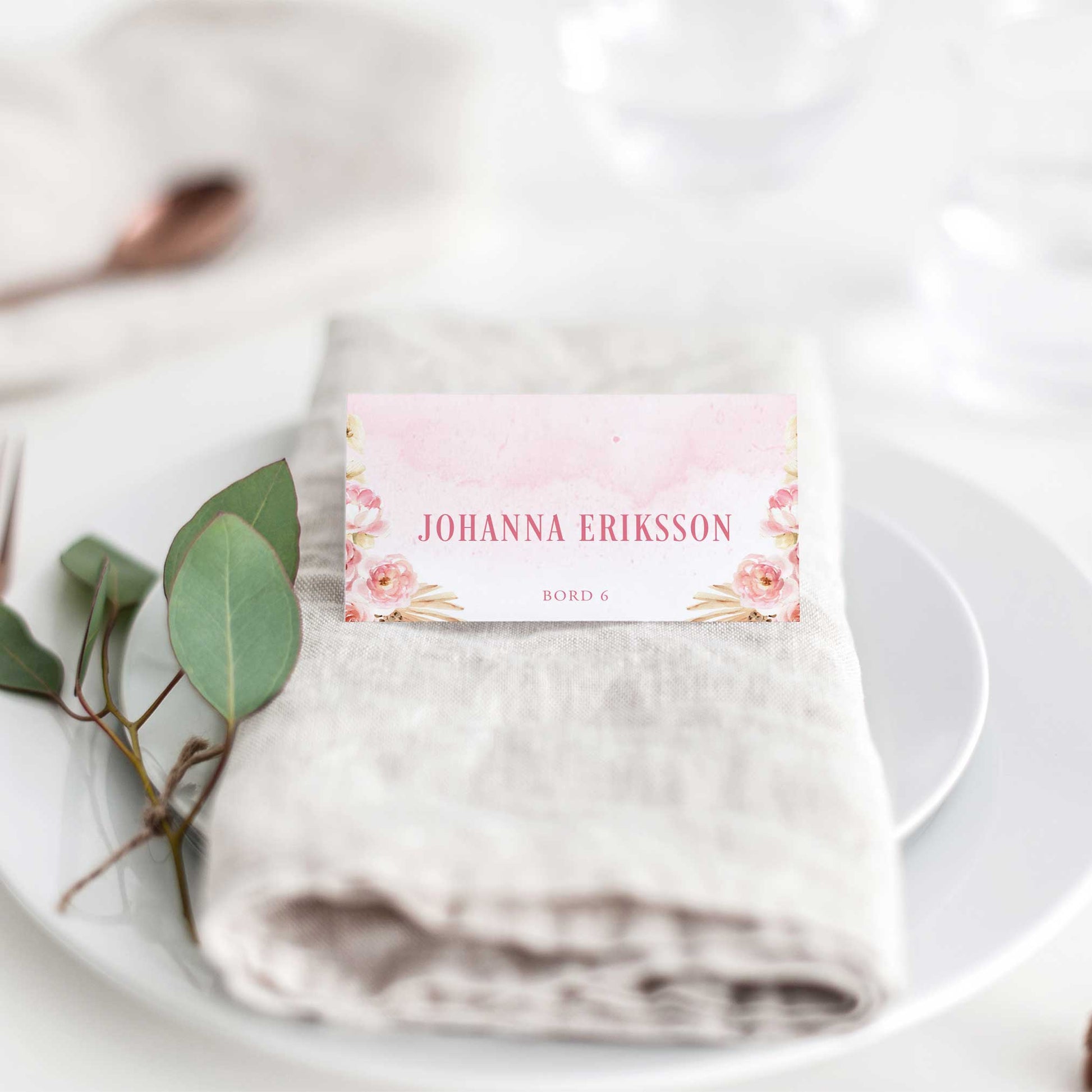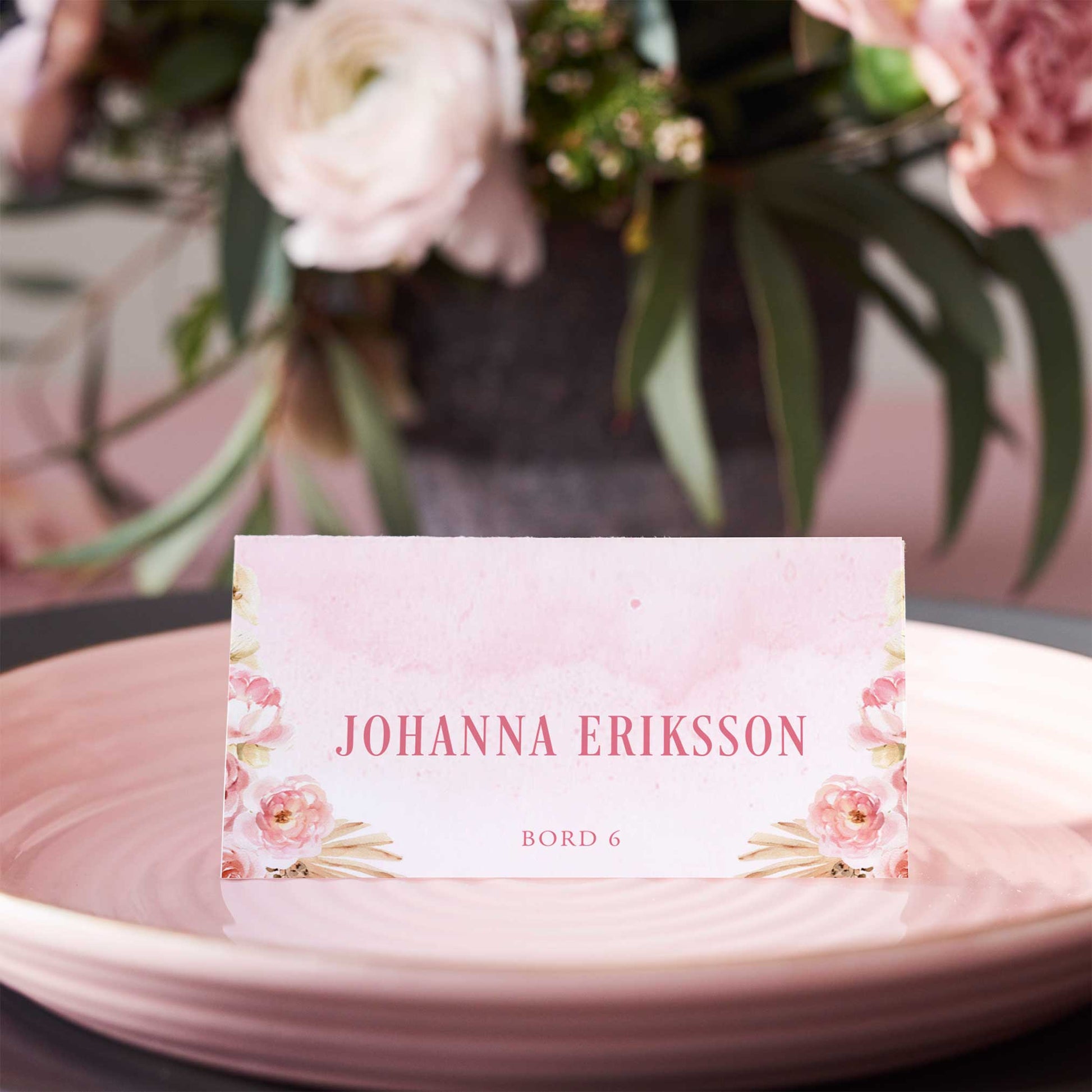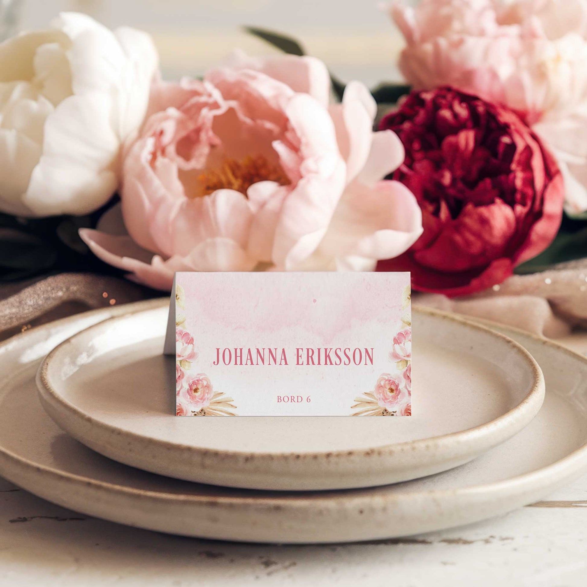 Vikta placeringskort till bröllop – Rosa Boho akvarell & pampasdesign – Tryckt kort med namn för dukning BR011