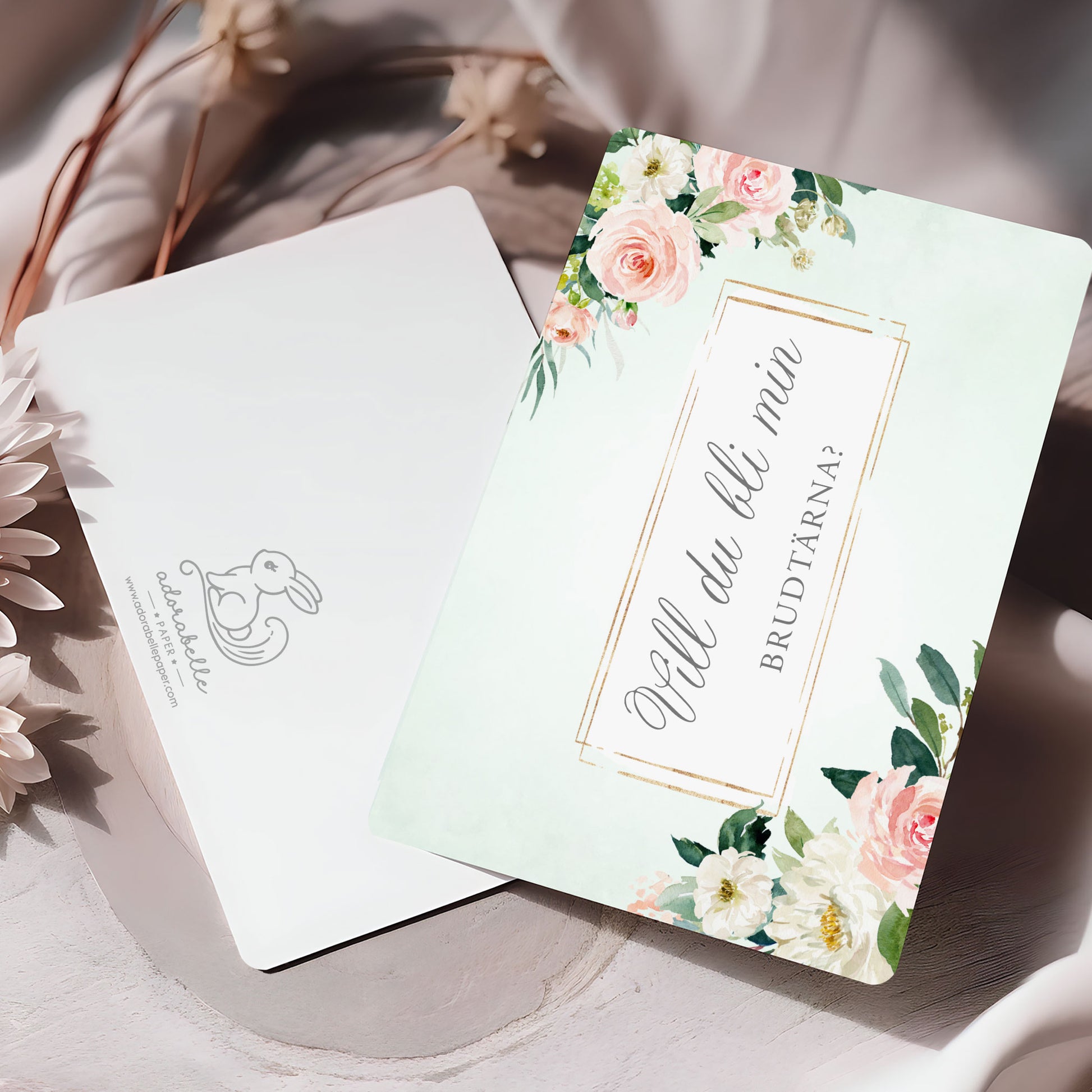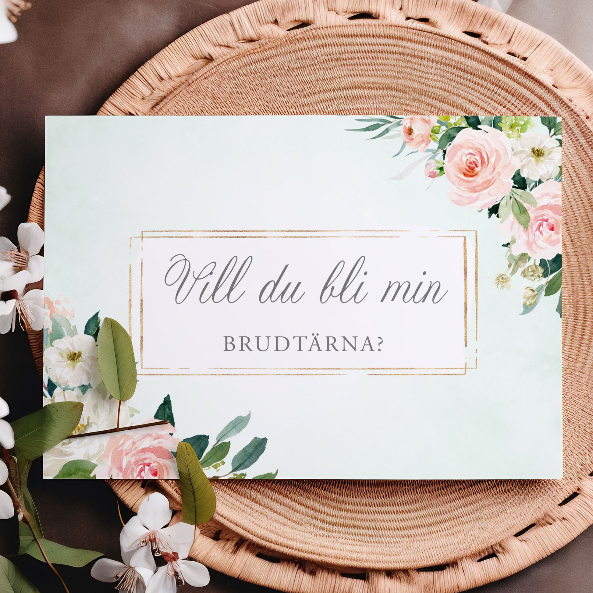 Vill du bli-kort – Mint & Guld Rosa, blommig, somrig design – A6 Tryckt fråga till brudfölje BR009