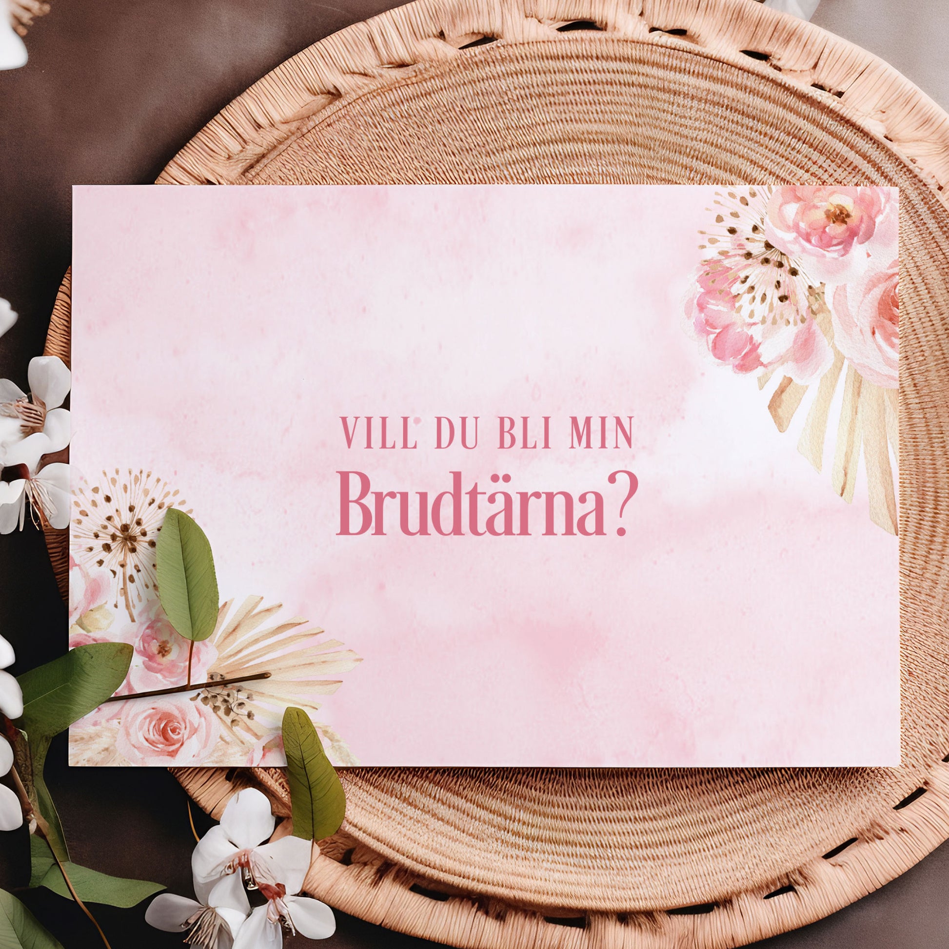 Vill du bli-kort – Rosa Boho akvarell & pampasdesign – A6 Tryckt fråga till brudfölje BR011