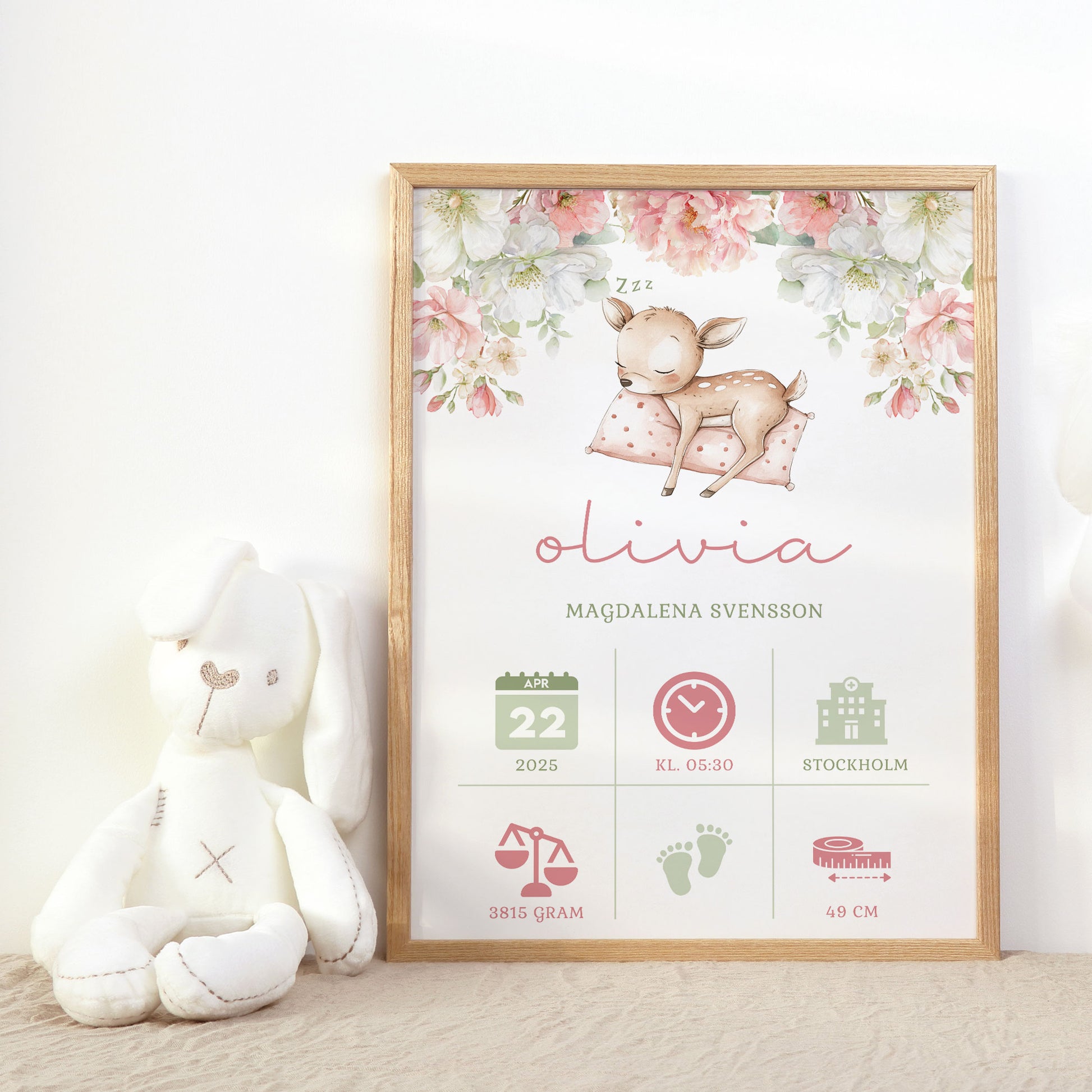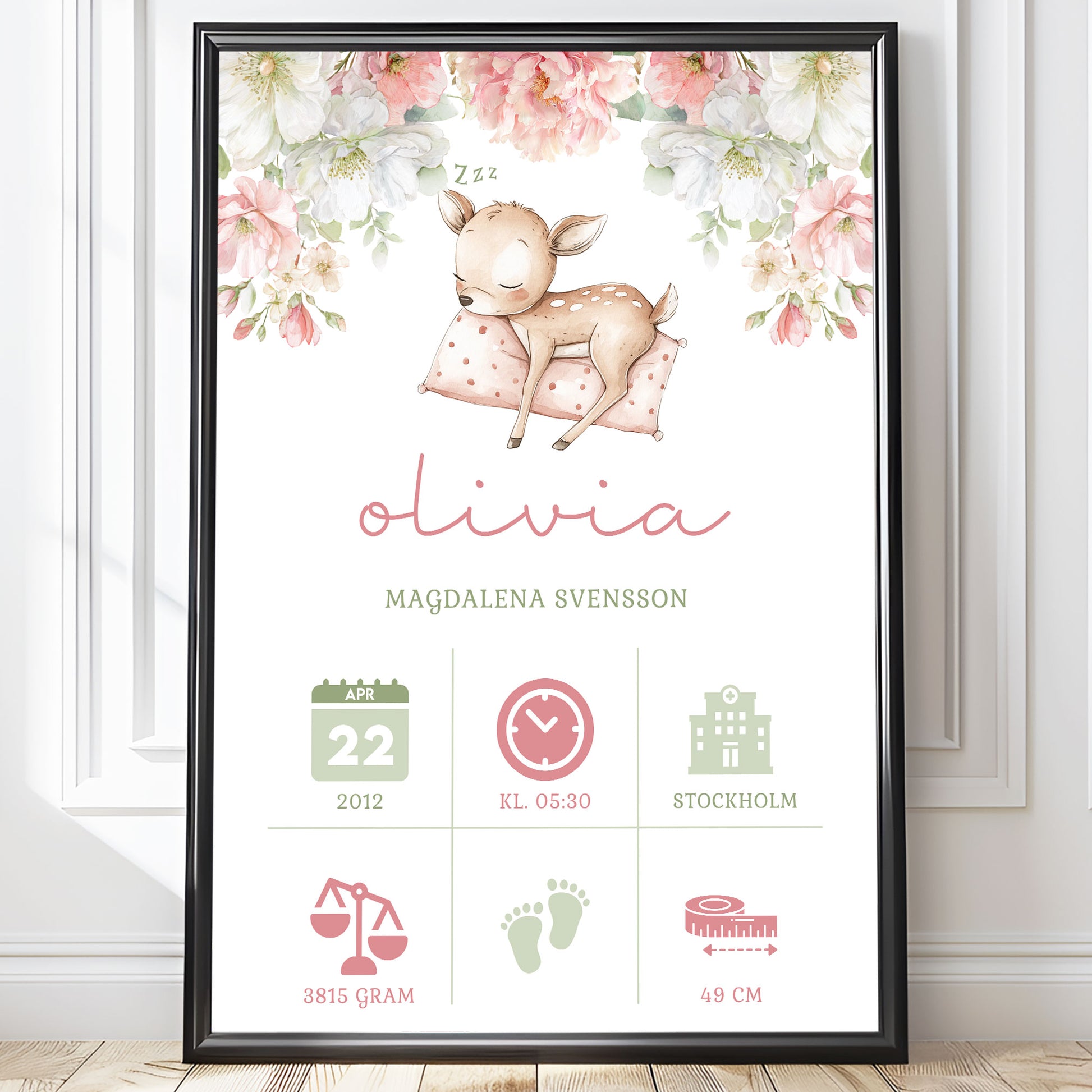 Personlig Doptavla Sovande Rådjur – Rosa Födelsetavla & Doppresent | Tryckt Baby Poster i olika storlekar
