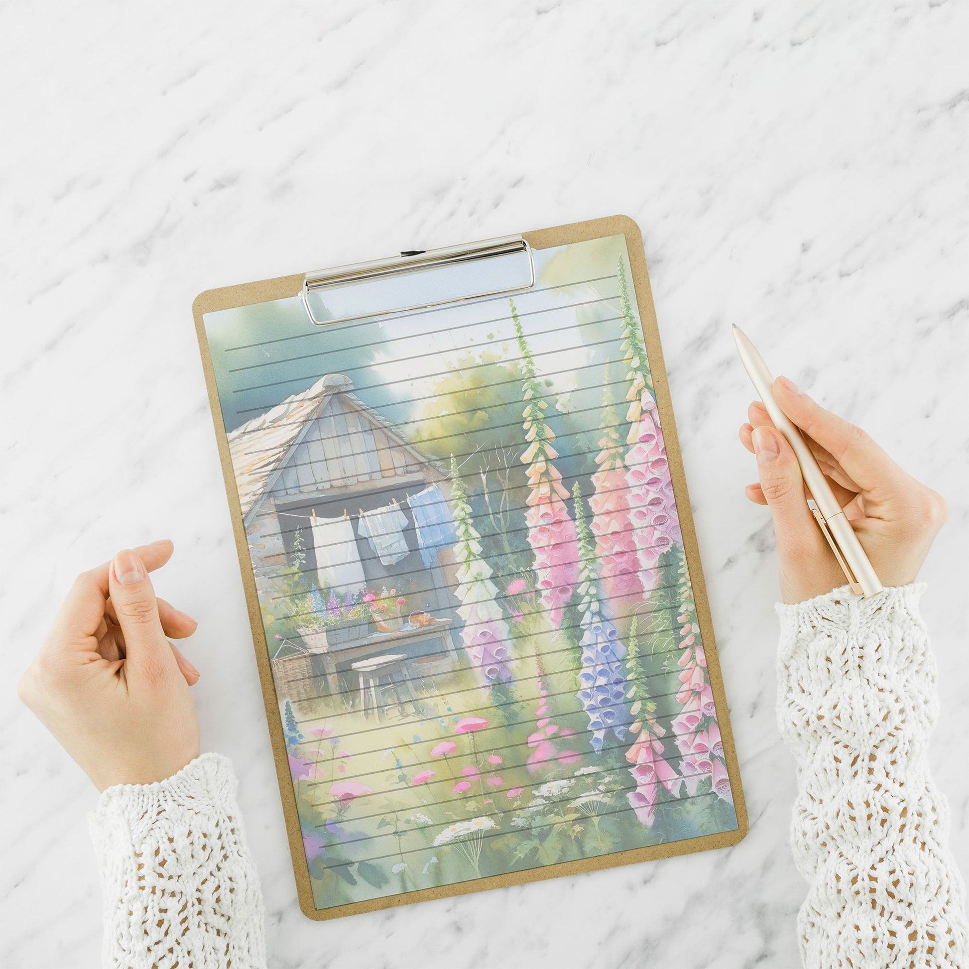 Detta A5-papper har en charmig design av en stuga en sommardag omgiven av livfulla fingerborgsblommor. Förbättra din skrivupplevelse med detta vackra papper.